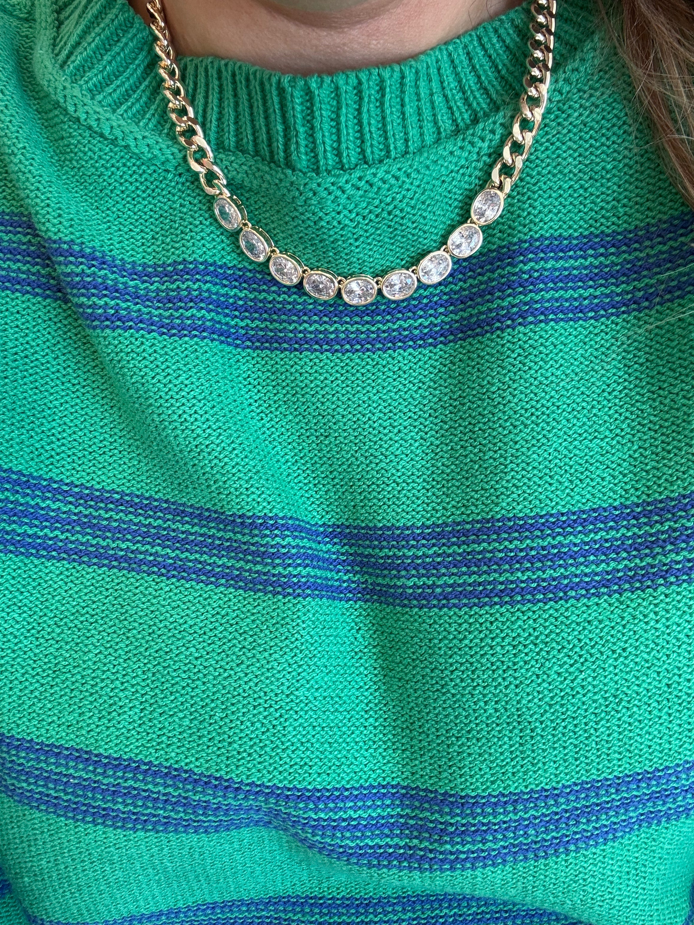 • Chain link necklace featuring a row of evenly spaced round stone details for added dimension and shine. Designed to stand alone or layer easily, this necklace offers a refined, modern look ideal for everyday wear, gifting, and boutique jewelry collections.