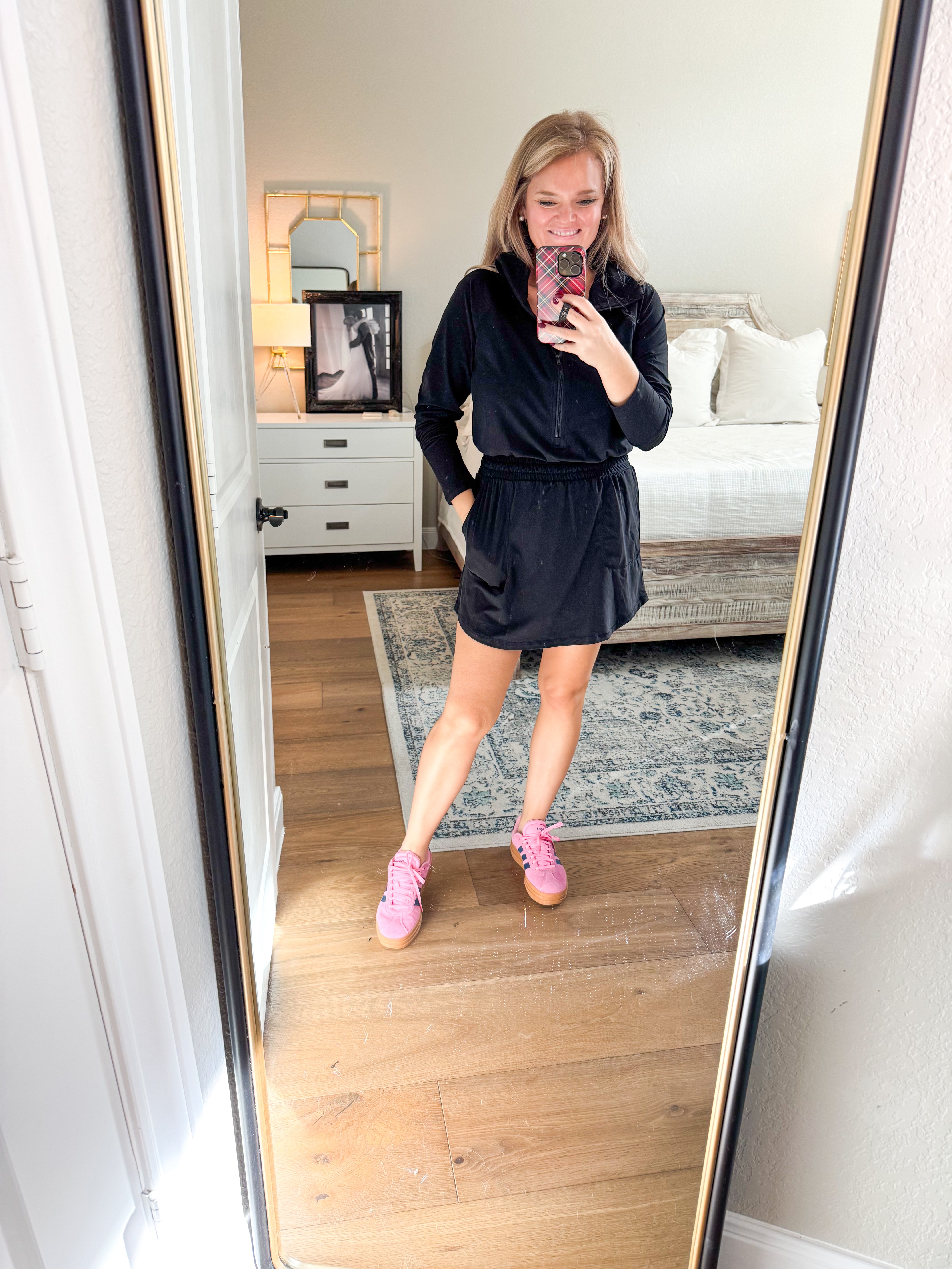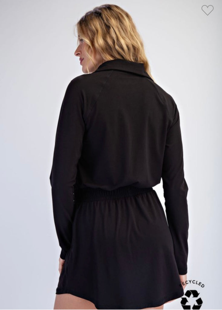 Butter soft quarter zip romper skirt. Long sleeve, dropped shoulder, mock neck, quarter zipper closure, dress with built-in shorts. Elastic waistband with side pockets. 84% recycled polyester microfiber, 16% spandex. True to size, I am a 6/8 wearing a medium.