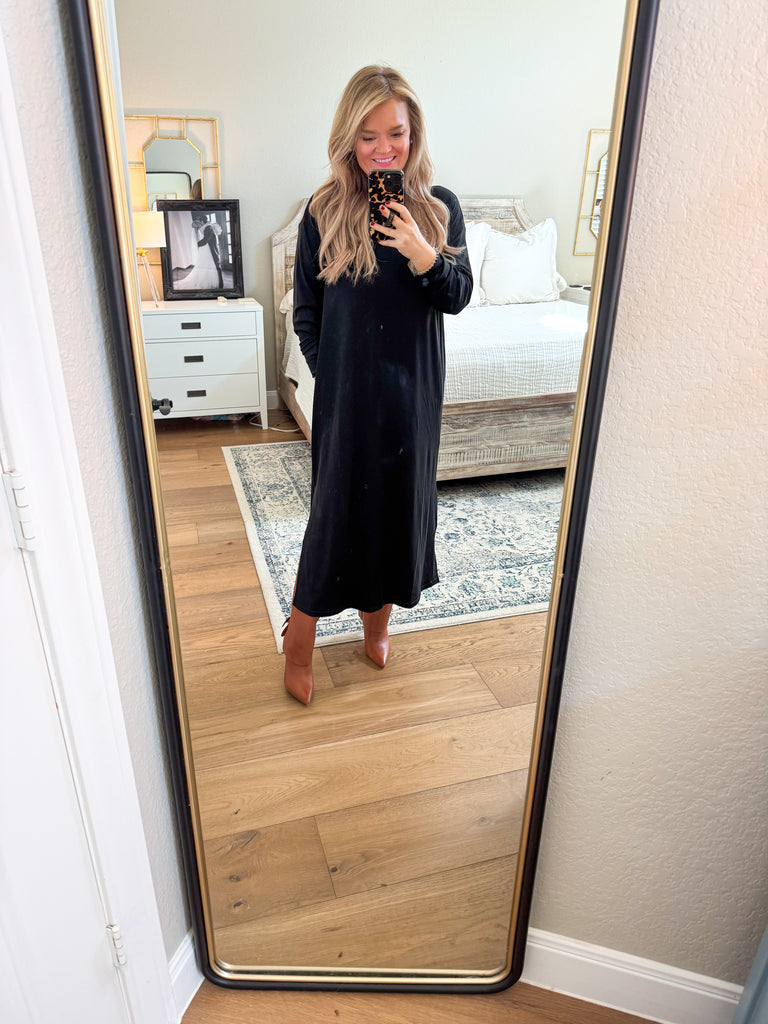 True to size, I am a 6/8 wearing a medium. Solid long sleeve midi dress featuring mock neck. Side pockets, unlined, knit, non-sheer, lightweight. 90% polyester, 10% spandex.