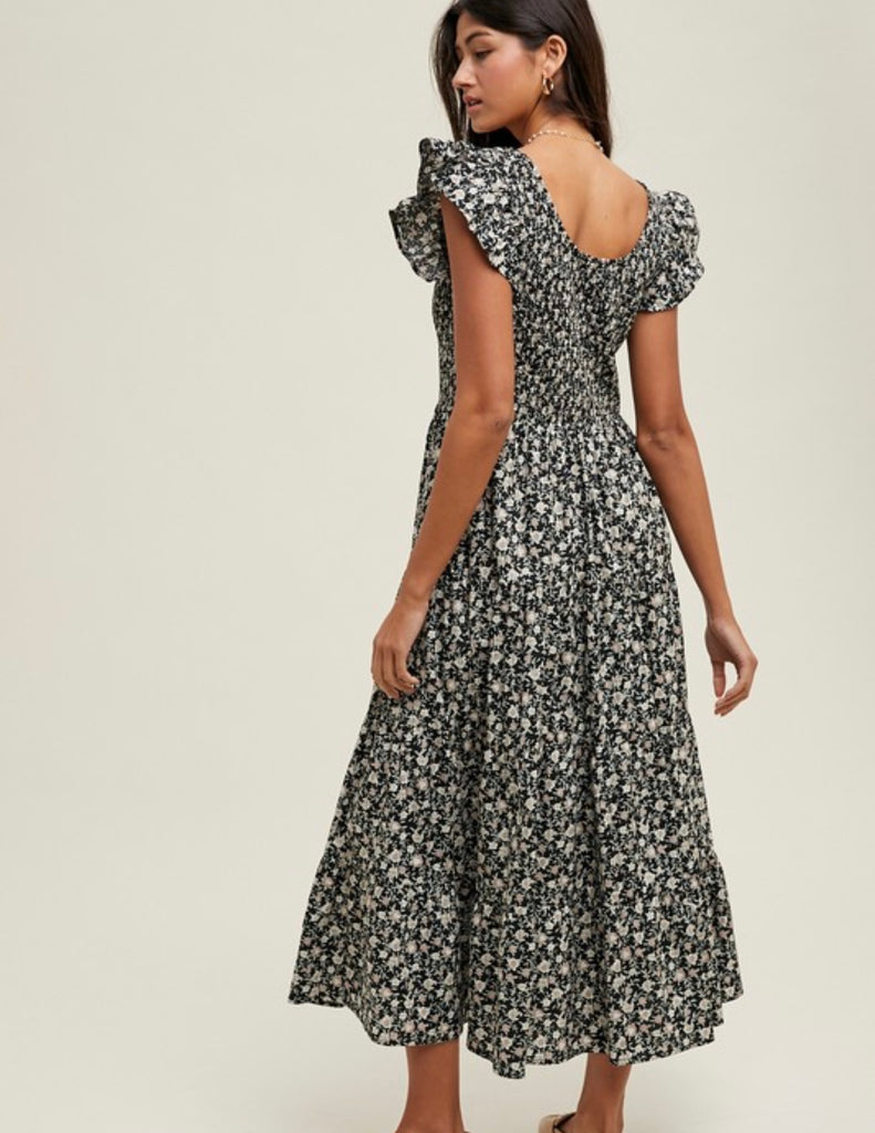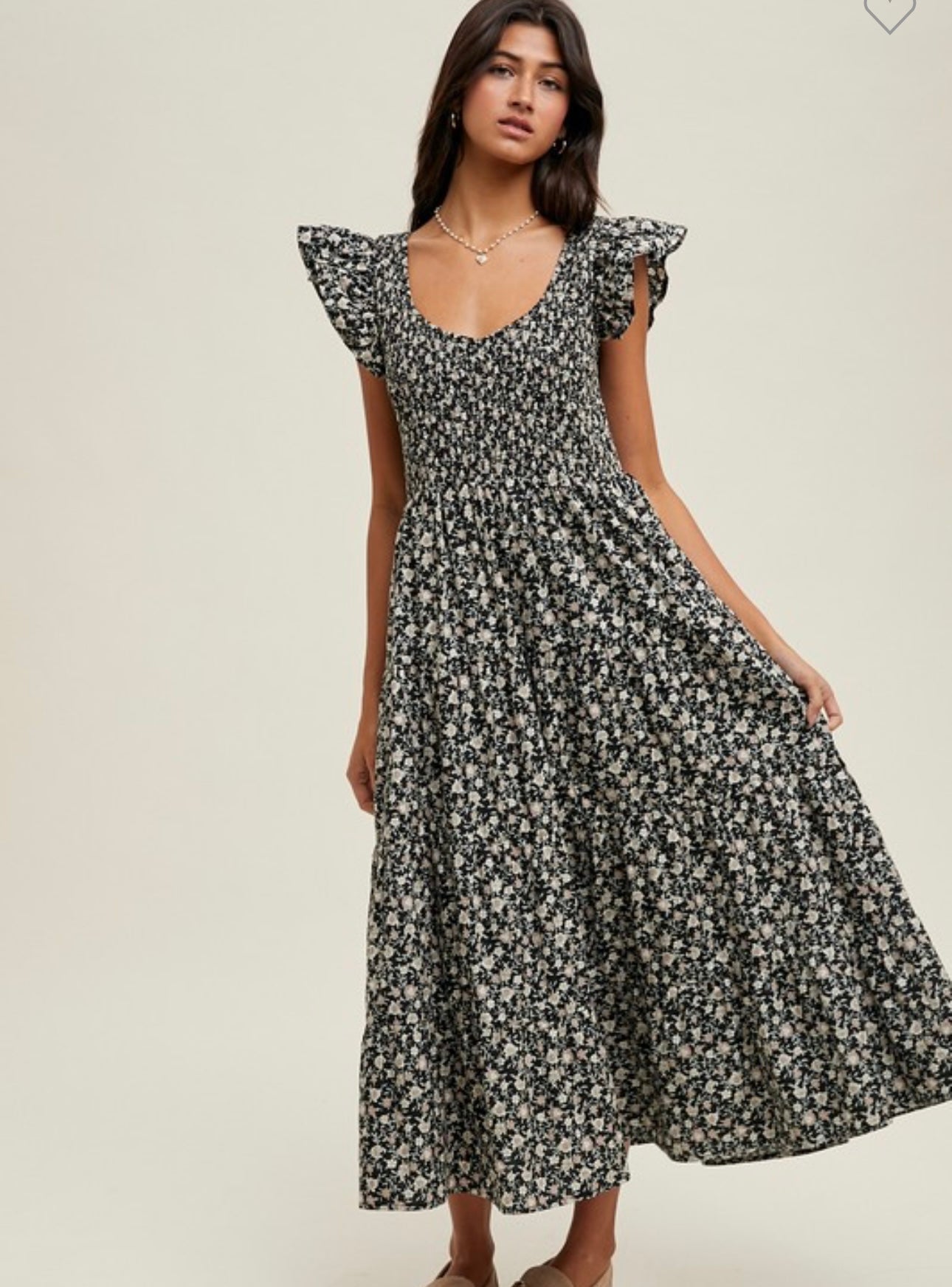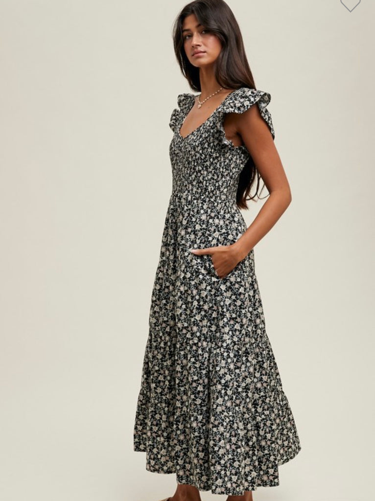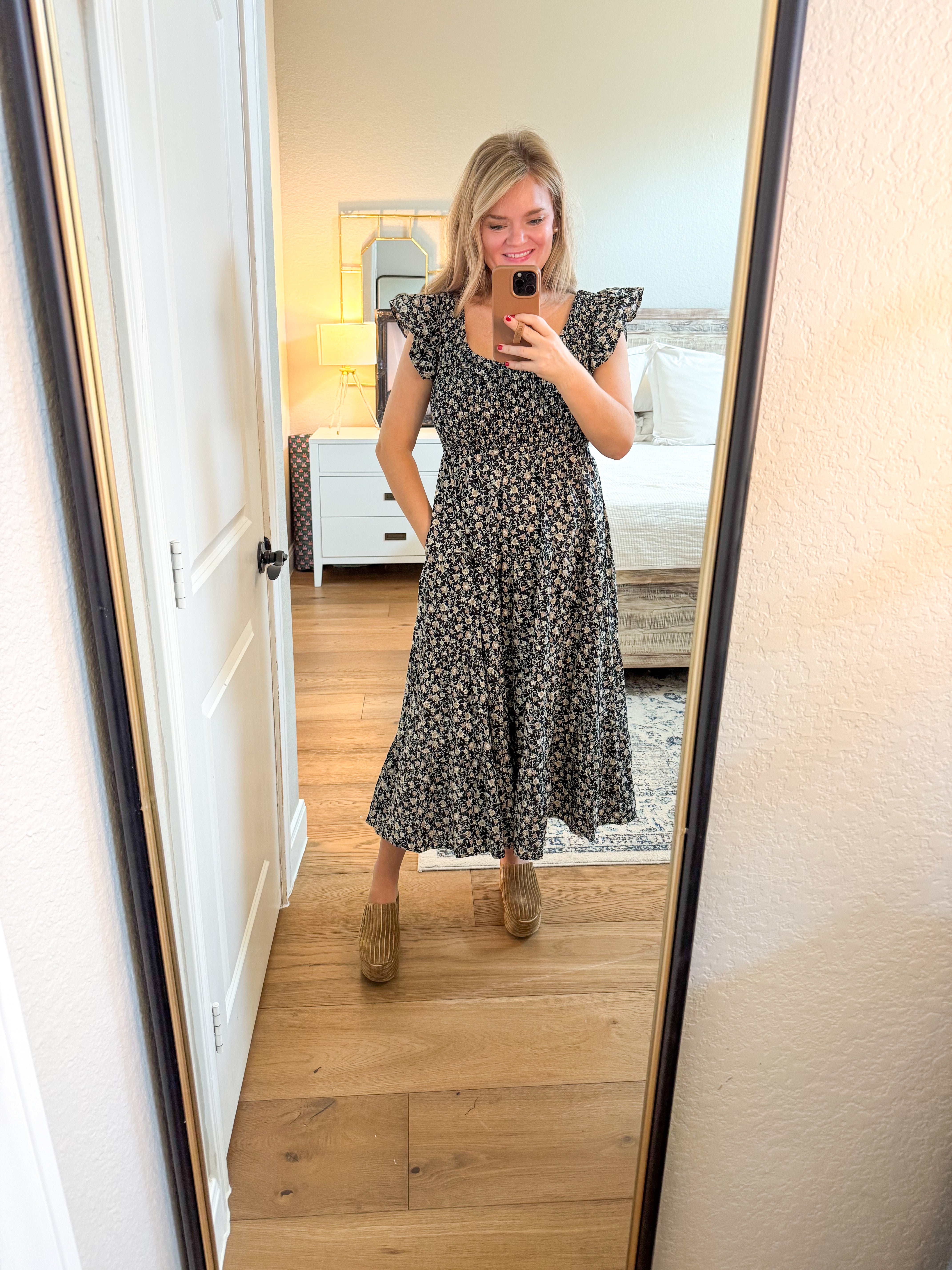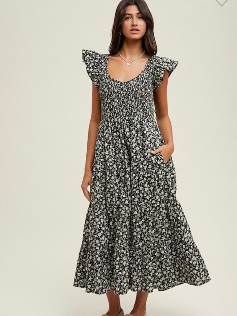 Floral smocked midi dress. 100% cotton. Ruffle sleeve, side pockets. True to size, I am a 6/8 wearing a medium.