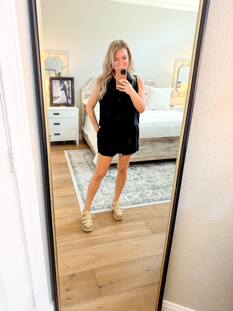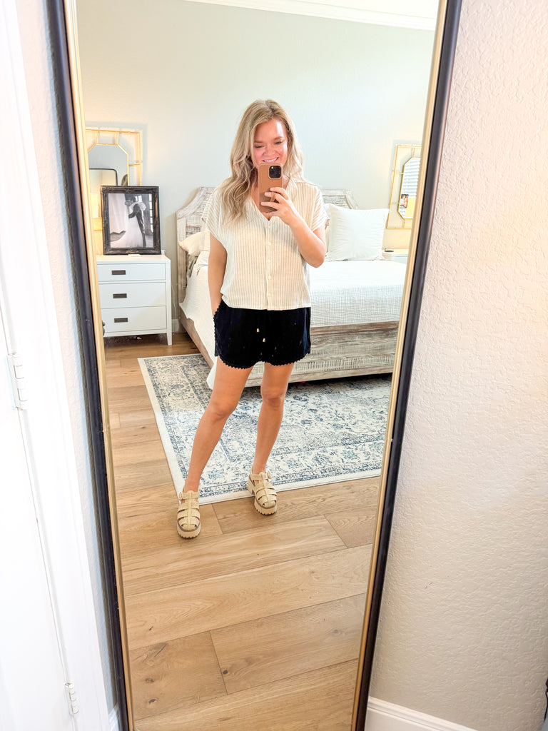Viscose & linen soft linen blend elastic tie waist tulip shorts with crochet lace. True to size, I am a size 6 wearing a medium. Coordinating top sold separately.