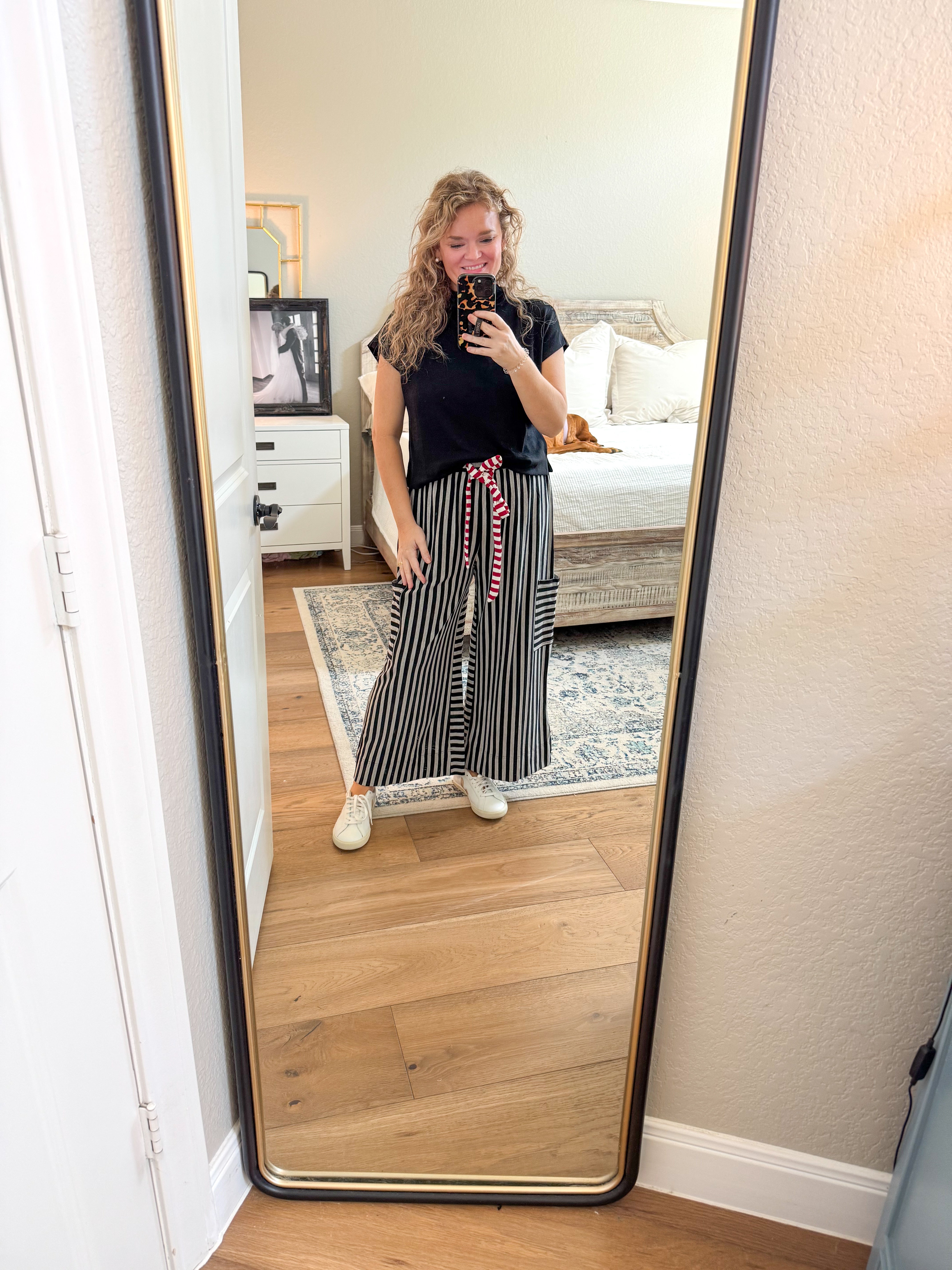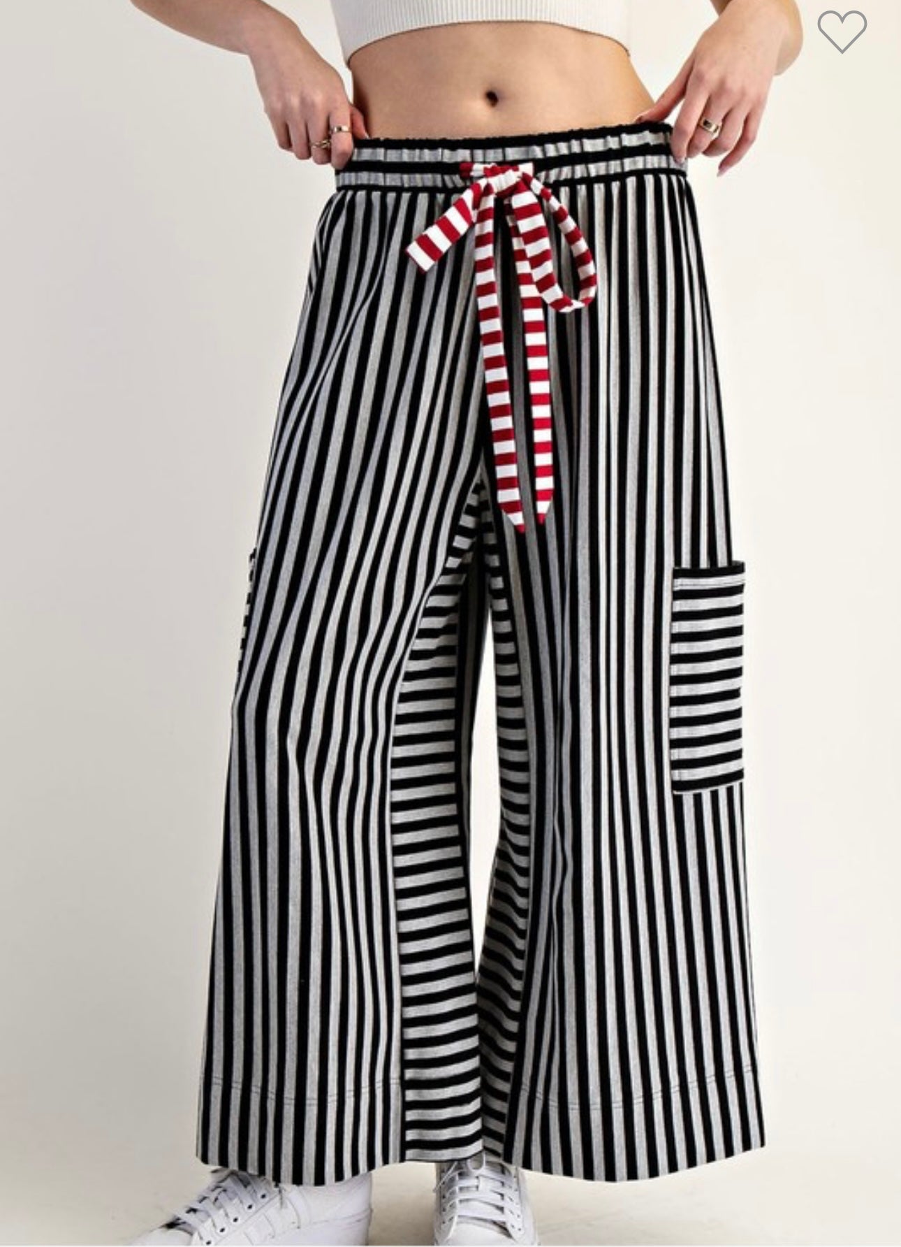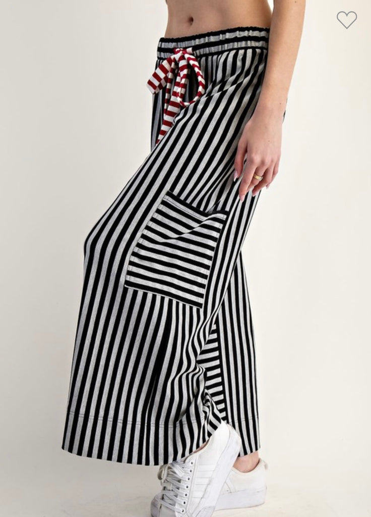 Striped pants with elastic waistband with a contrasting striped drawstring. Oversized Side pockets. Runs large, I am a size 6 wearing a small.