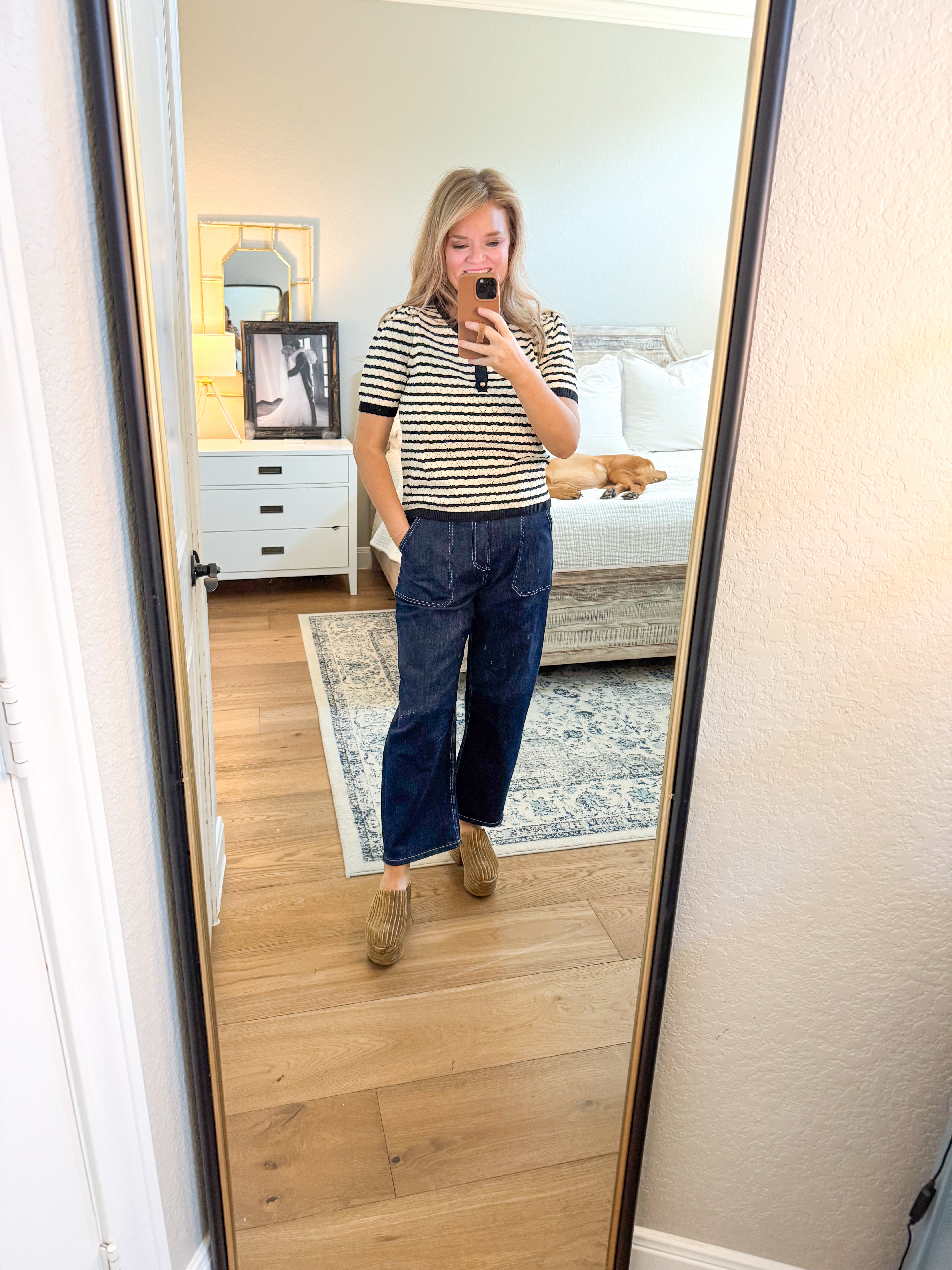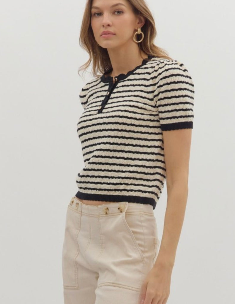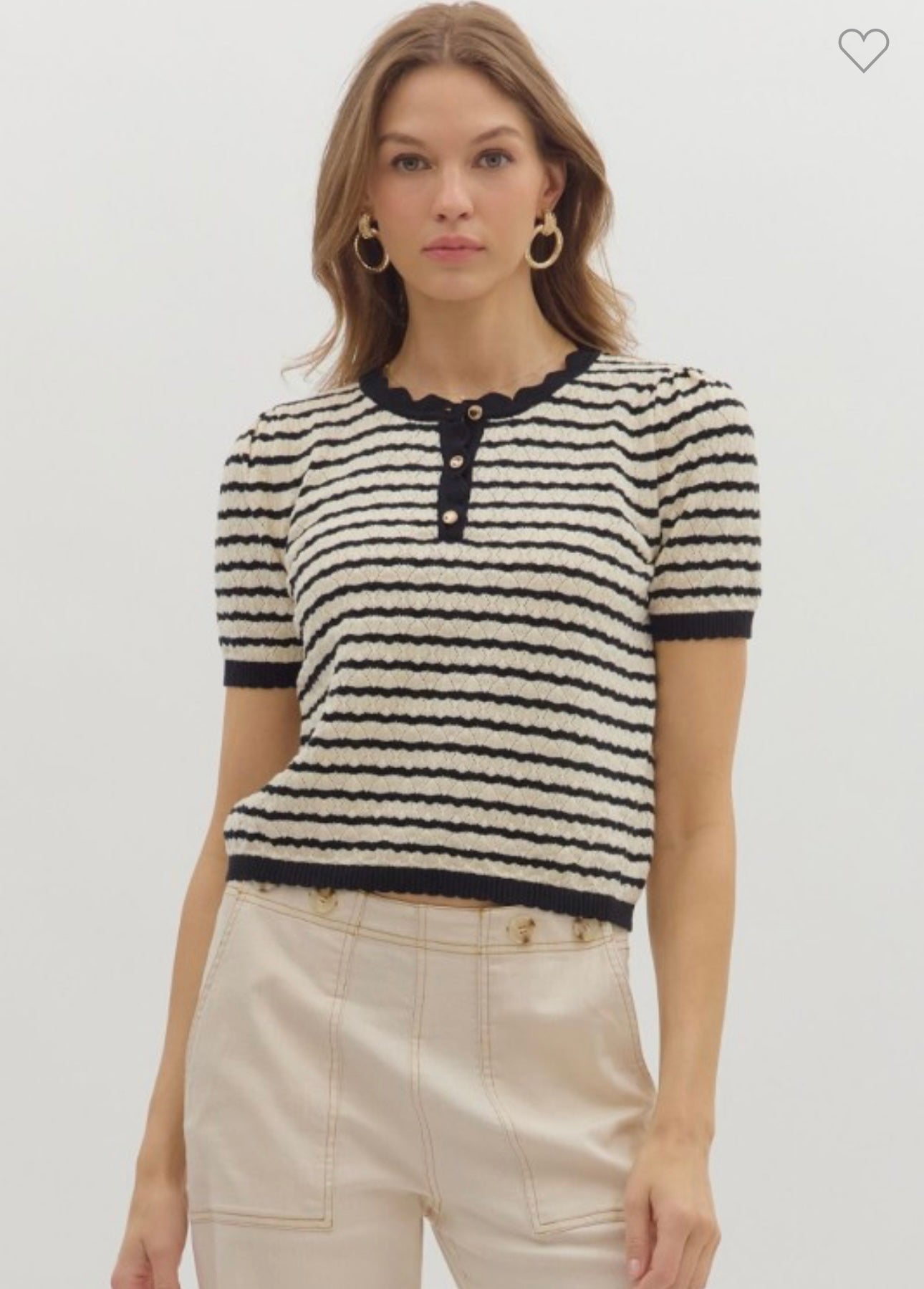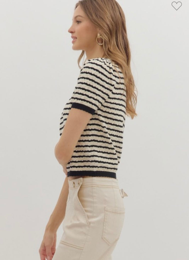 Striped lightweight knit sweater. True to size, I am a 6/8 wearing a medium. Short sleeve pointelle sweater knit top featuring scallop edge finish. Button front closure. Unlined, knit, semi-sheer, lightweight. 95% cotton, 5% spandex.