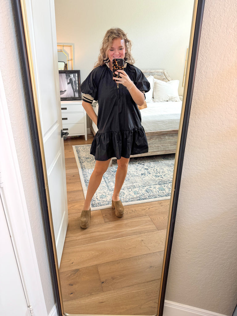 True to size, I am a 6 wearing a small. 80% polyester, 20% cotton. Solid puff sleeve ruffle hem dress featuring multicolor accent band and zipper closure at front neck. Pockets at sides, lined, woven, non-sheer, lightweight.