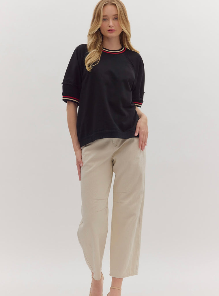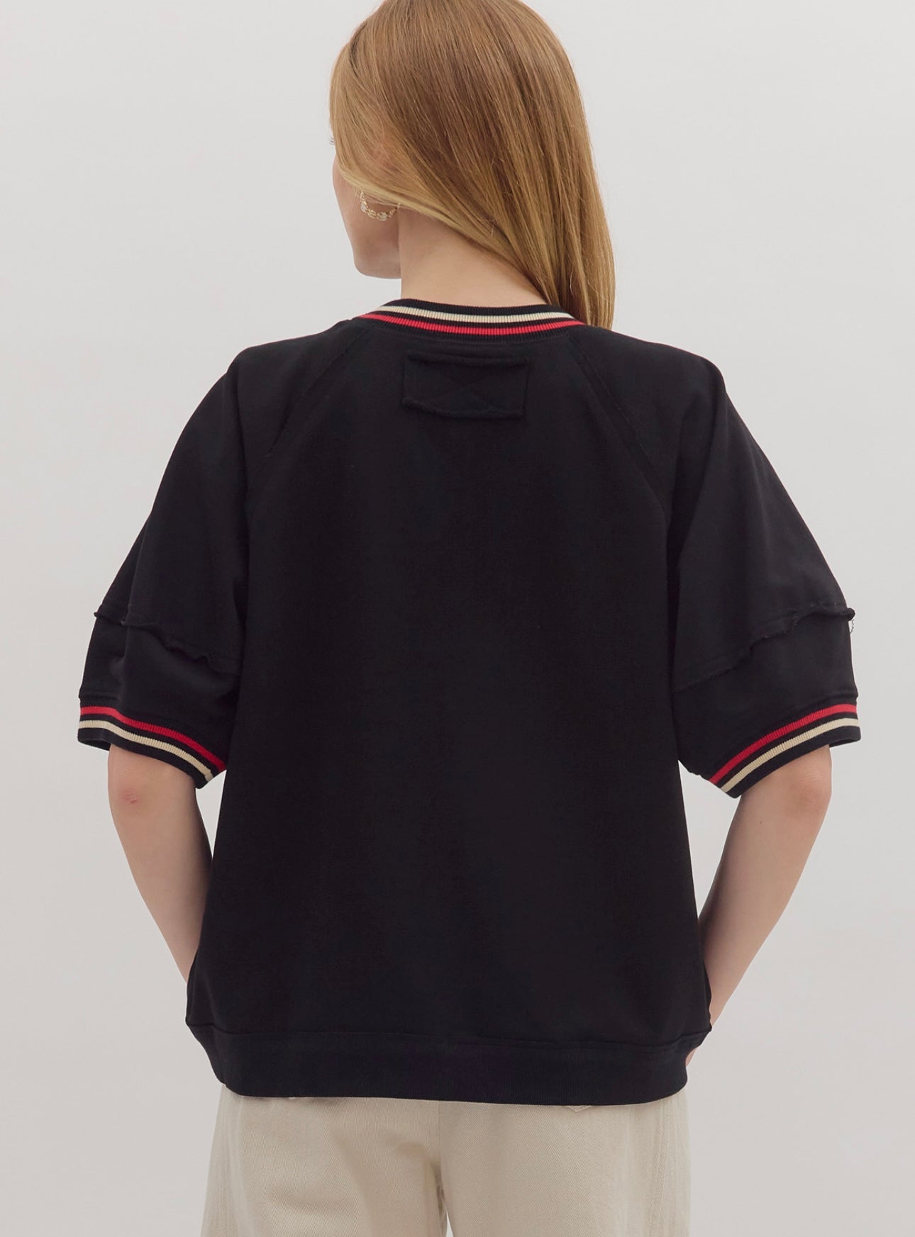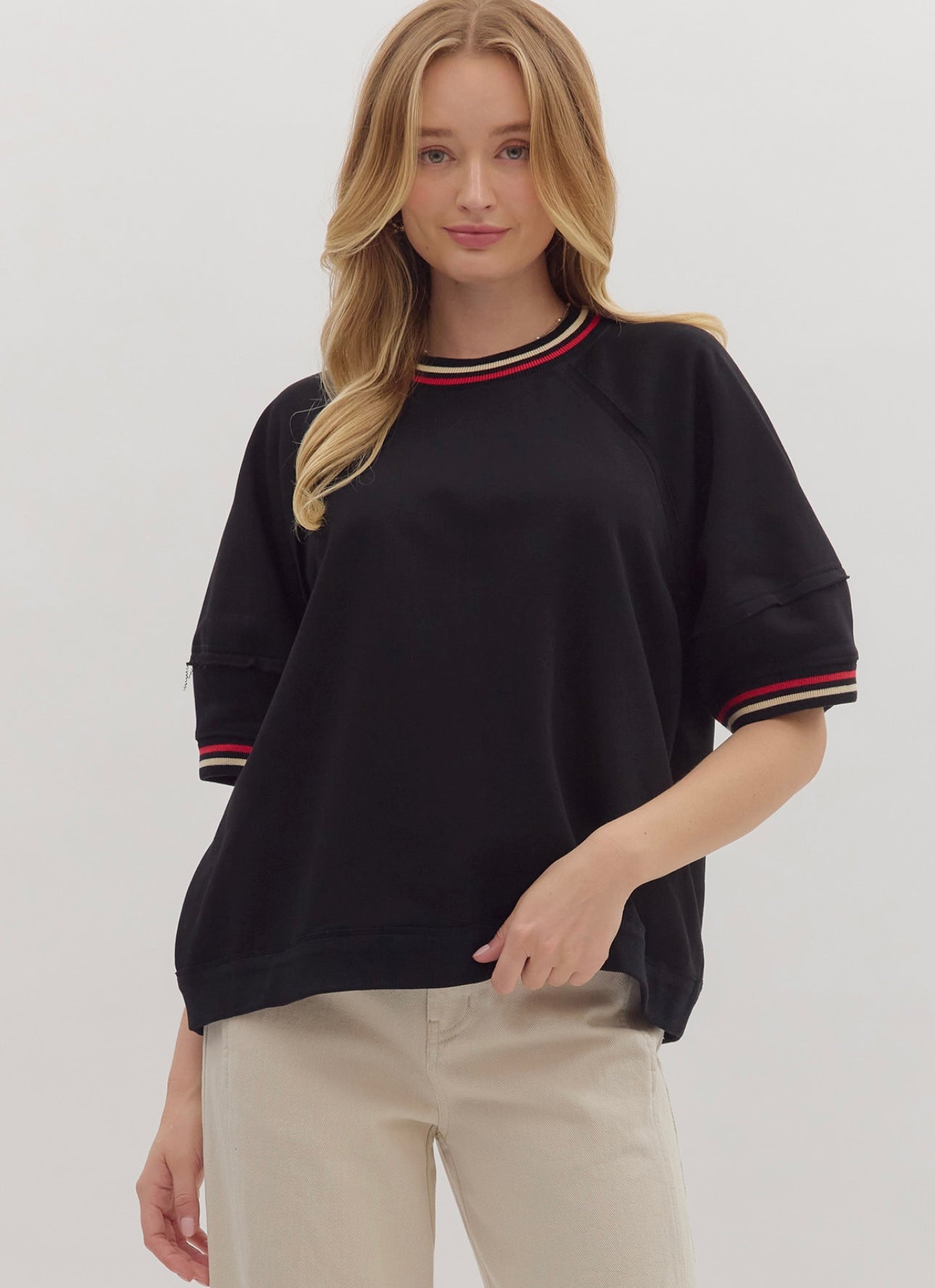 100% cotton solid elbow-length raglan sleeve pullover knit top featuring multicolor band accent. Unlined, knit, non-sheer, lightweight. Runs large, I am a 6/8 wearing a medium.