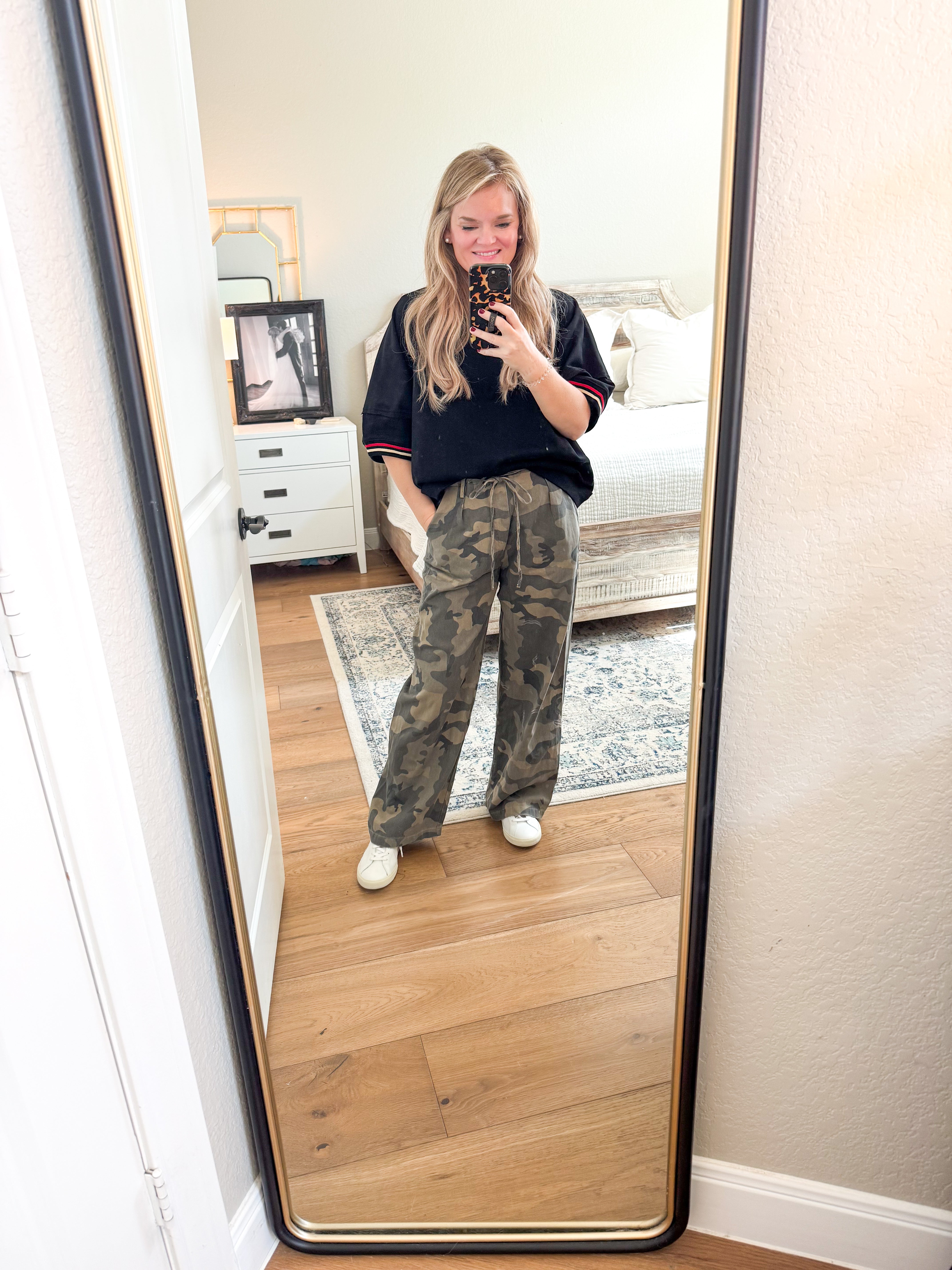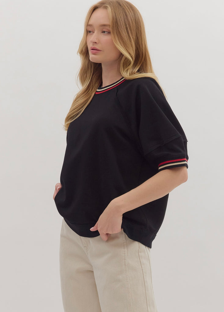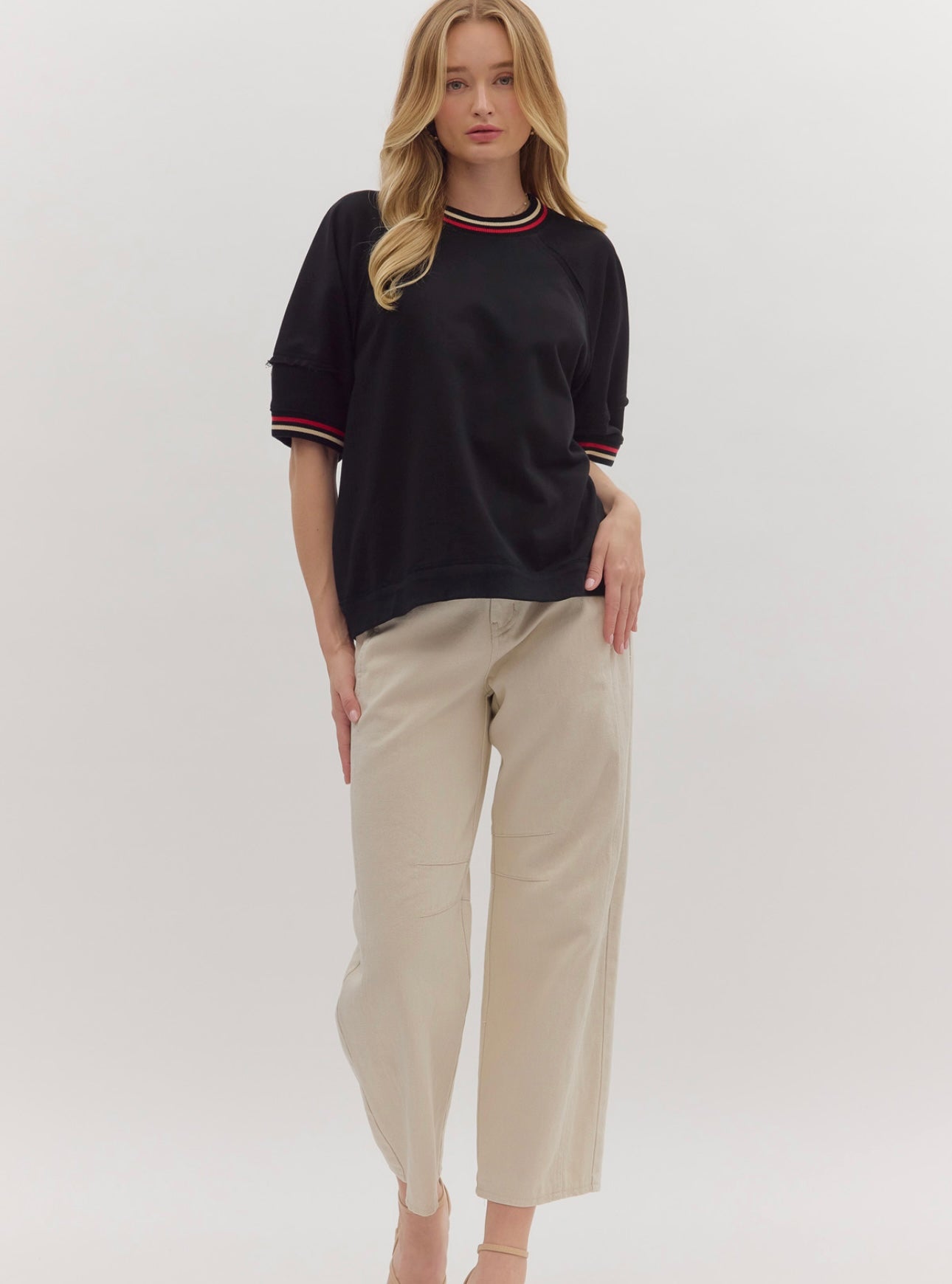 100% cotton solid elbow-length raglan sleeve pullover knit top featuring multicolor band accent. Unlined, knit, non-sheer, lightweight. Runs large, I am a 6/8 wearing a medium.