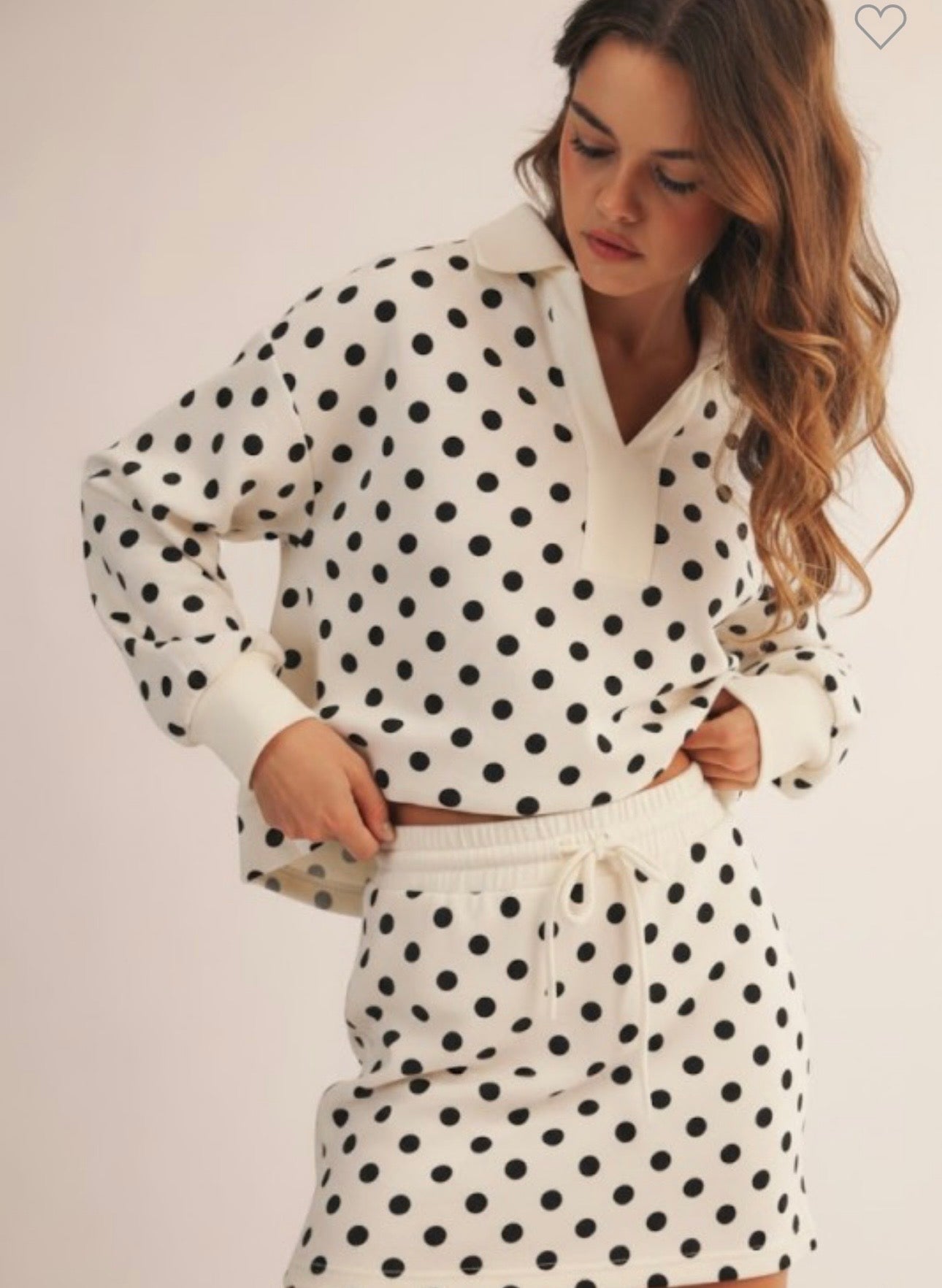 97%POLYESTER 3%SPANDEX Sweatshirt with v-neck collared top. Matching skirt sold separately.