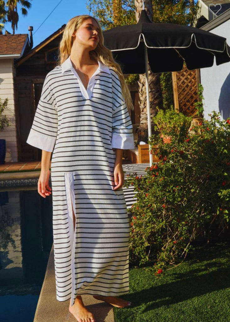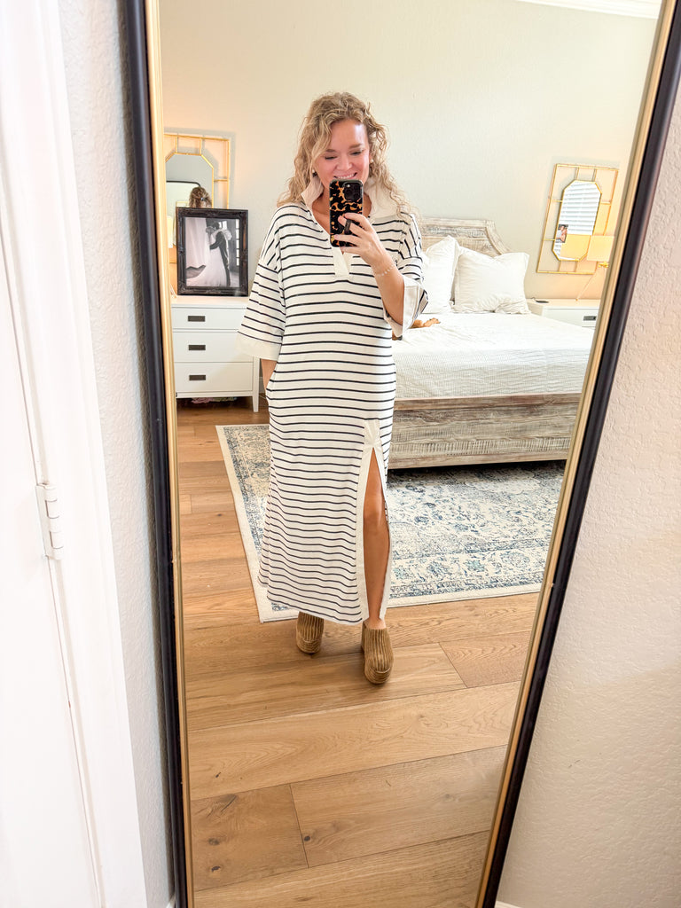 True to size, I am a 6 wearing a medium76% cotton, 19% rayon, 5% spandex. Striped print rugby midi dress with collared neckline and side pockets.