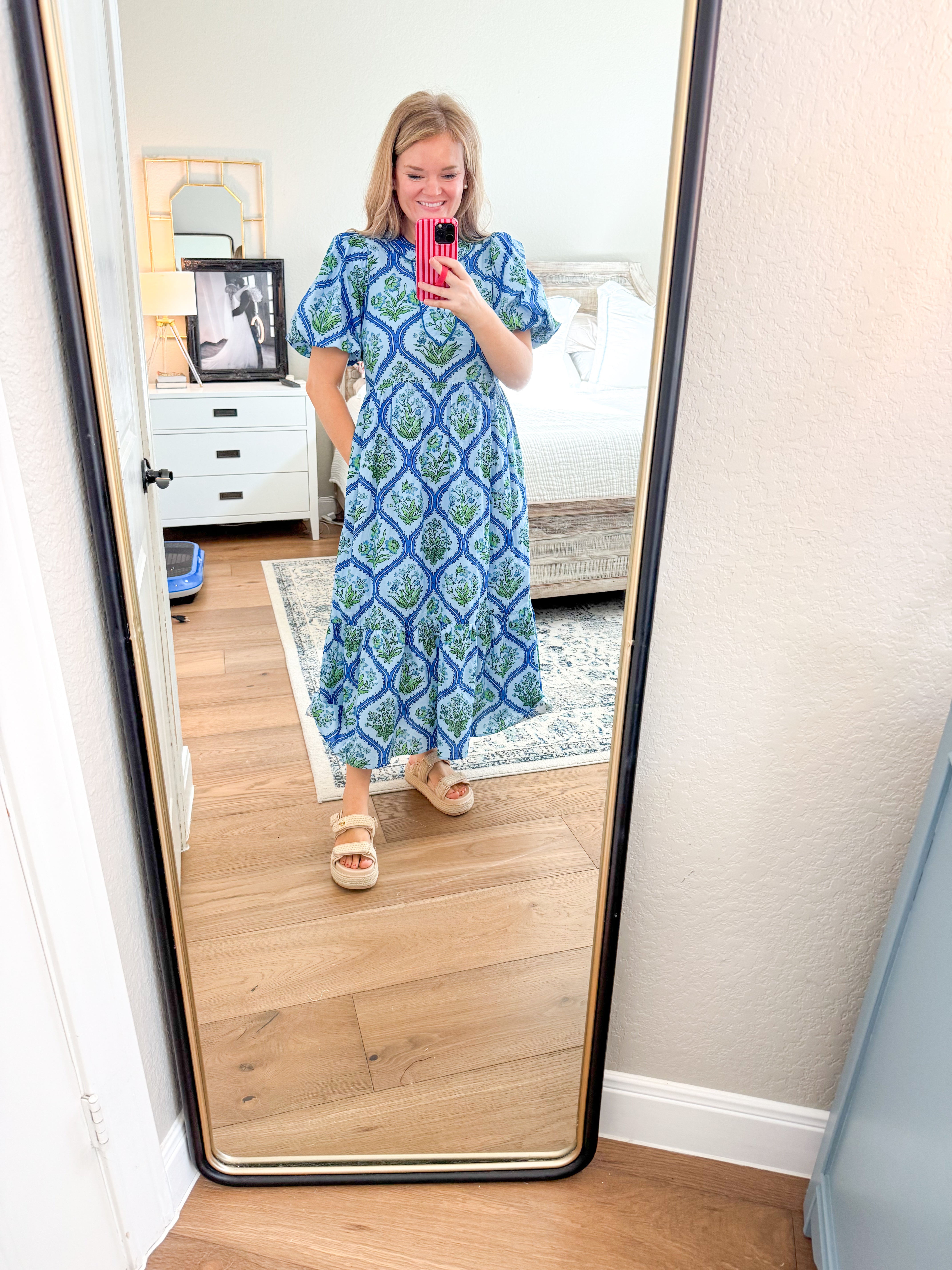 True to size, I am a 6/8 wearing a small. 100% cotton Botanical print puff short sleeve midi dress featuring V-neck with contrast binding and ruffle hem. Side pockets. Lined. Woven. Non-sheer. Lightweight.
