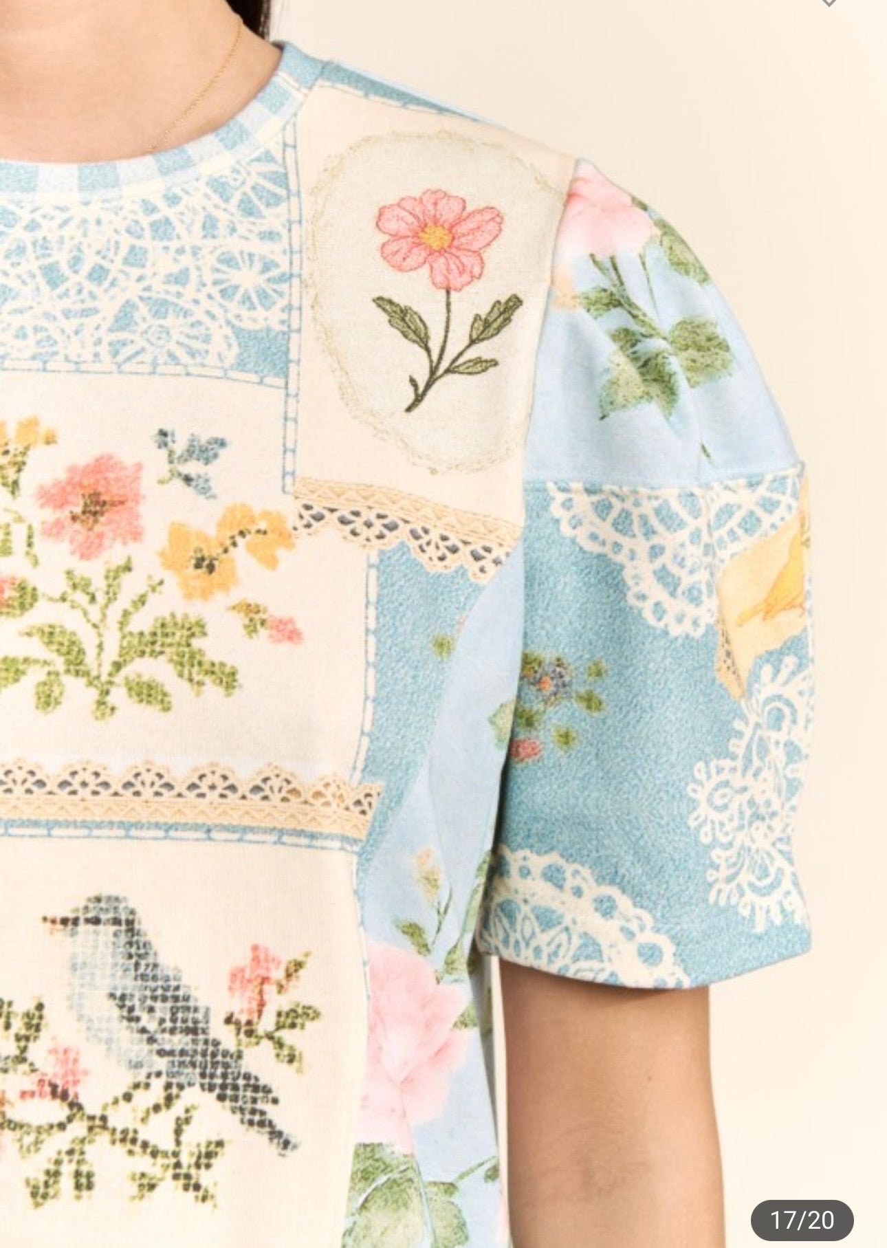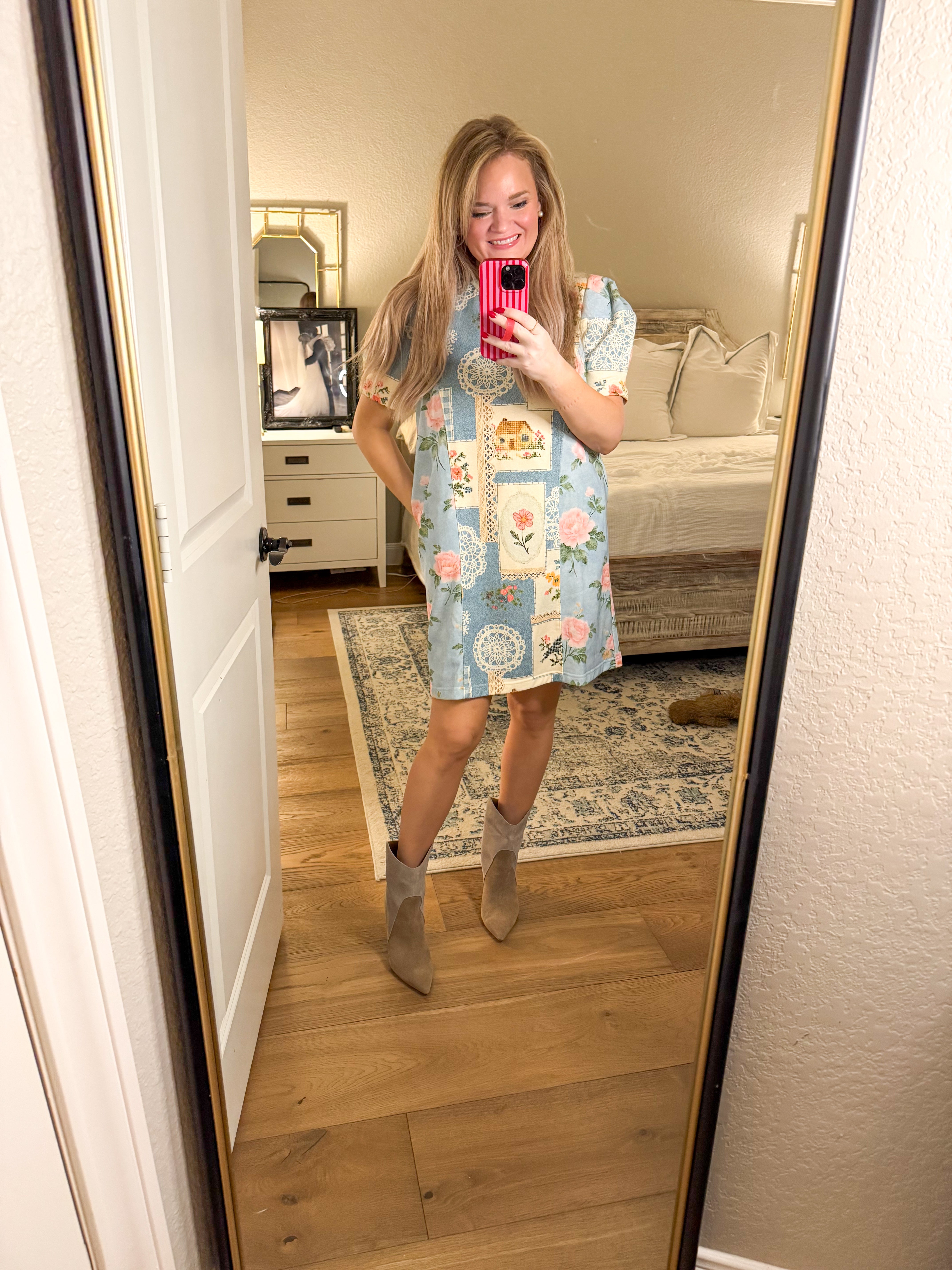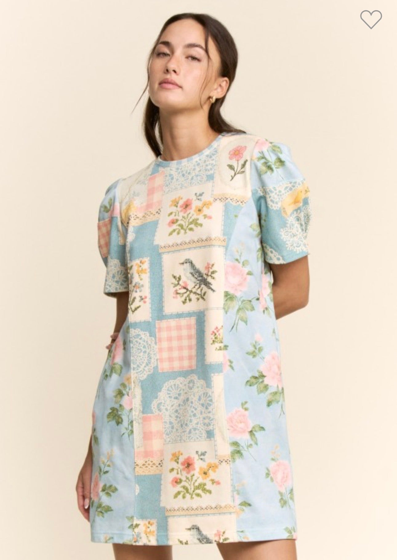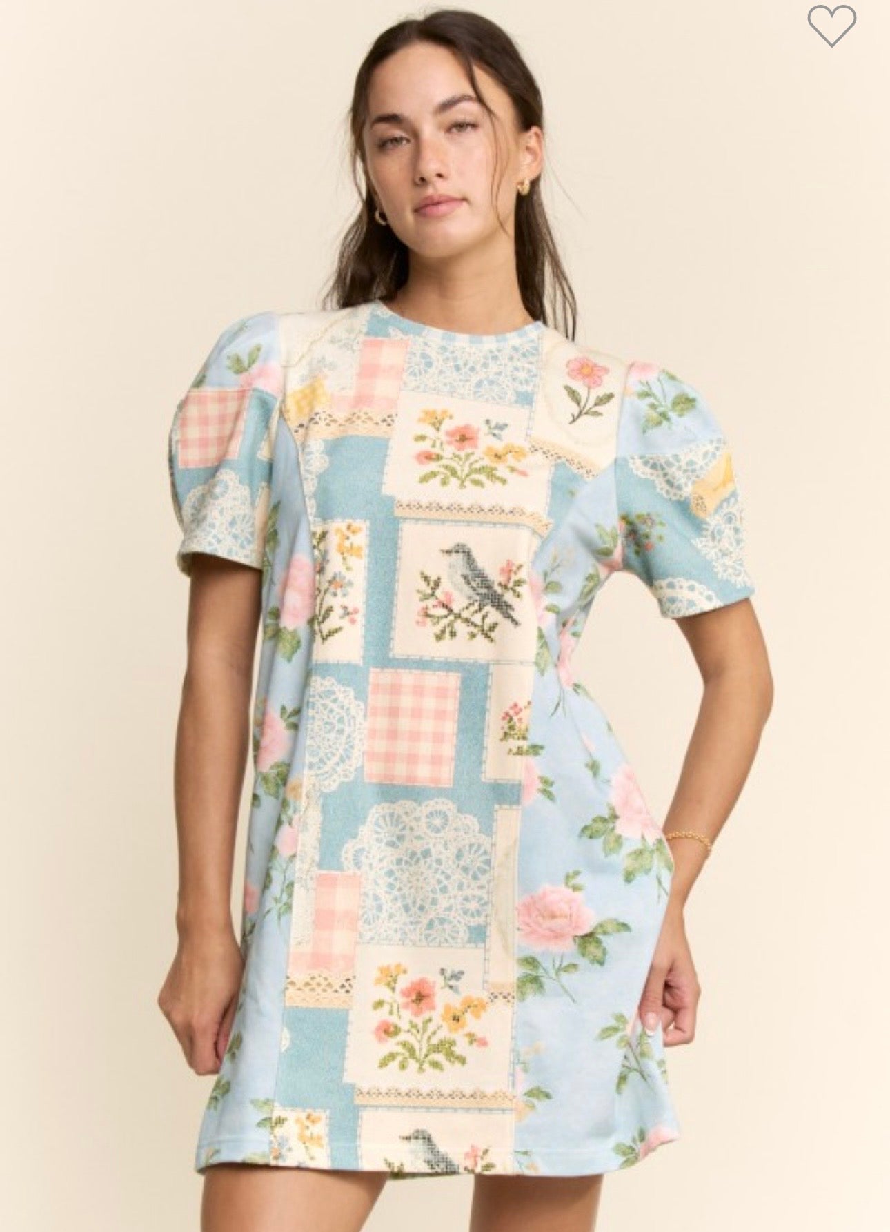 53% polyester, 47% rayon. This boutique ready T shirt dress features a charming floral patchwork design with soft mixed prints for an elevated casual look. Designed with short sleeves, easy pull on styling, and a relaxed silhouette that flatters while offering comfort and versatility for everyday wear or resort assortments True to size, I am a 6/8 wearing a small.