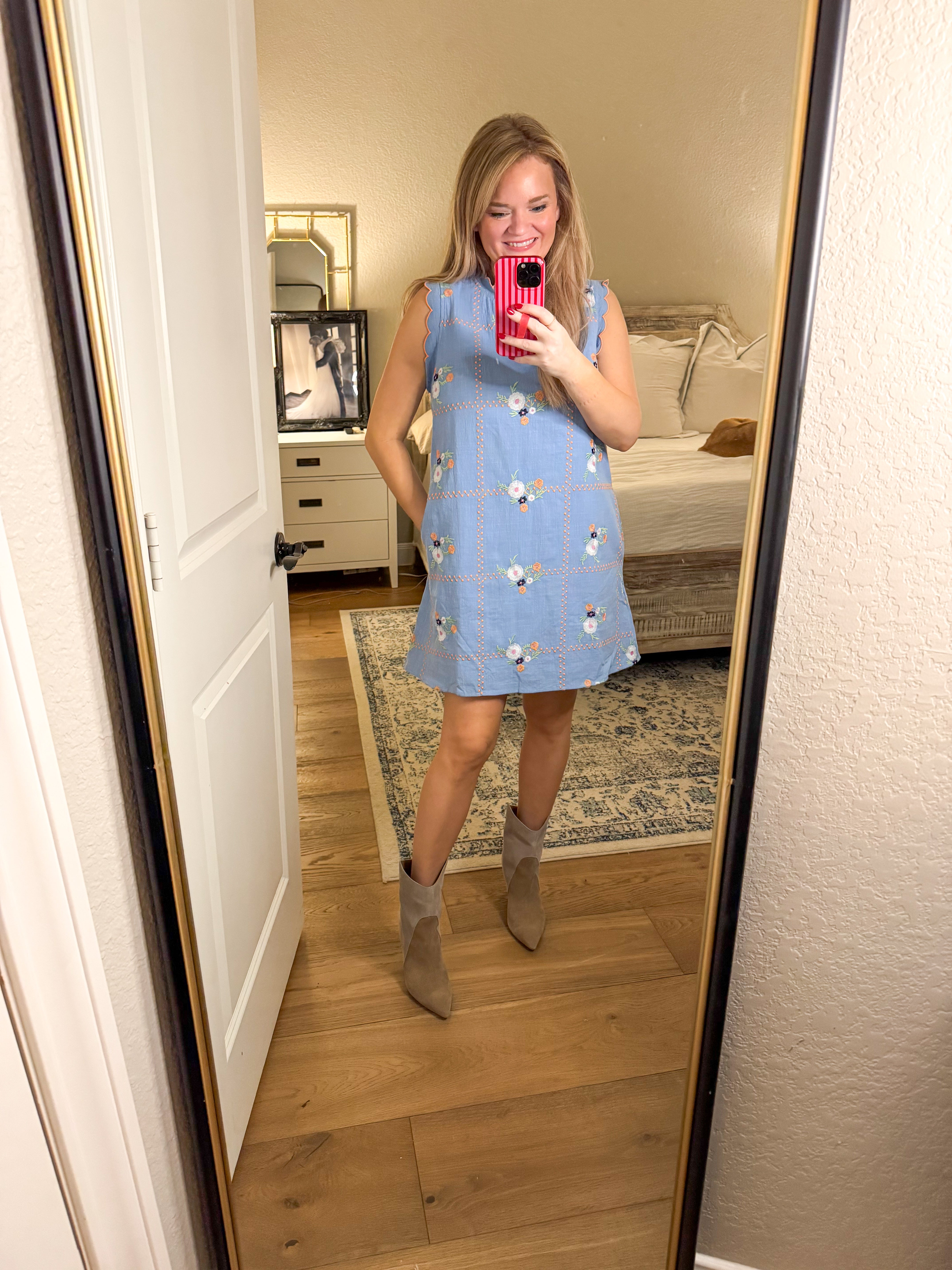 Floral embroidered sleeveless mini dress featuring scallop trim neckline and armholes. Button closure at back. Side pockets. Lined. Woven. Non-sheer. Lightweight. 100% cotton. True to size, I am a 6/8 wearing a medium.