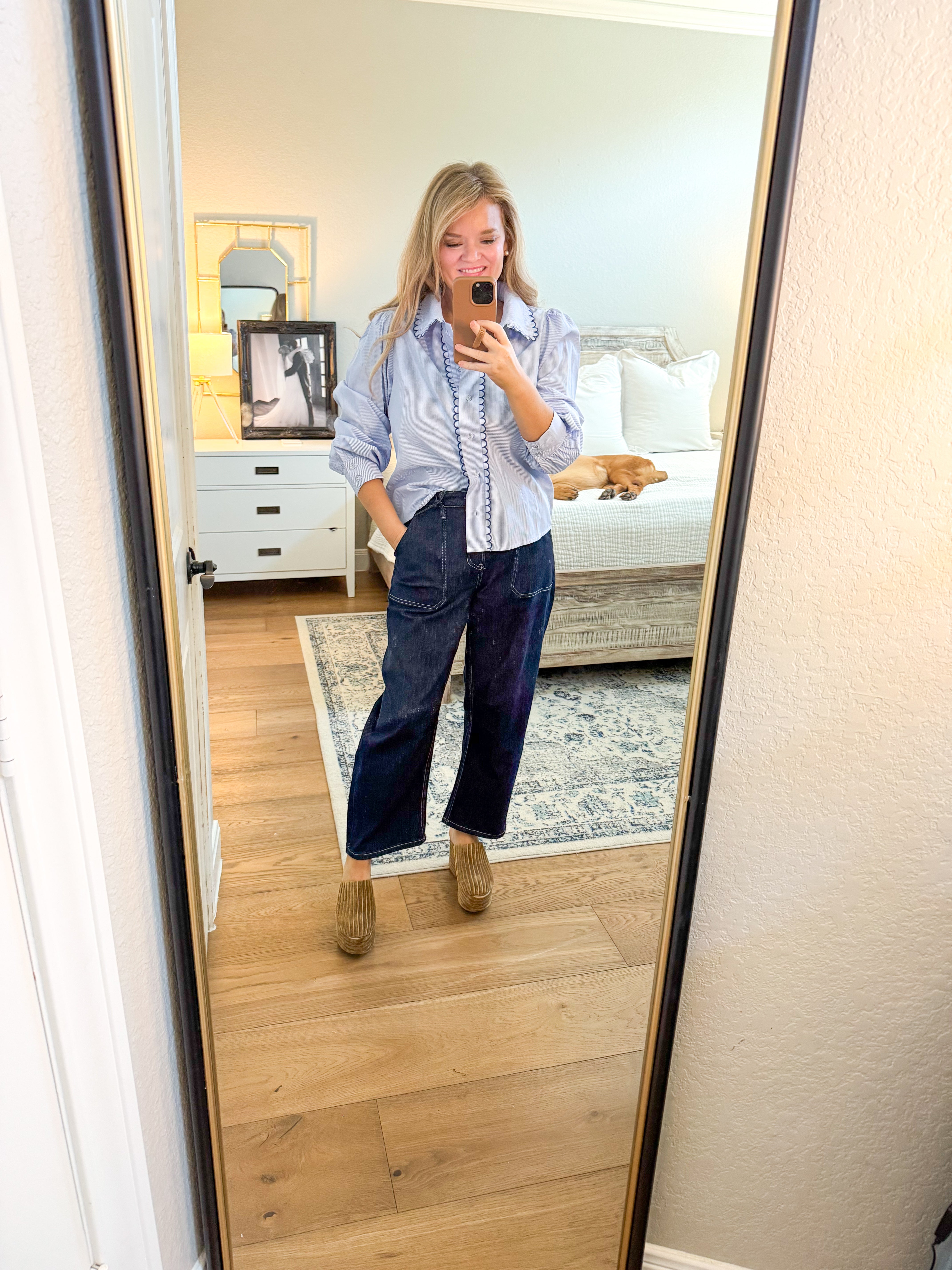 Lightweight striped shirt with scallop detail. 100% cotton. True to size, I am a 6 wearing a medium.