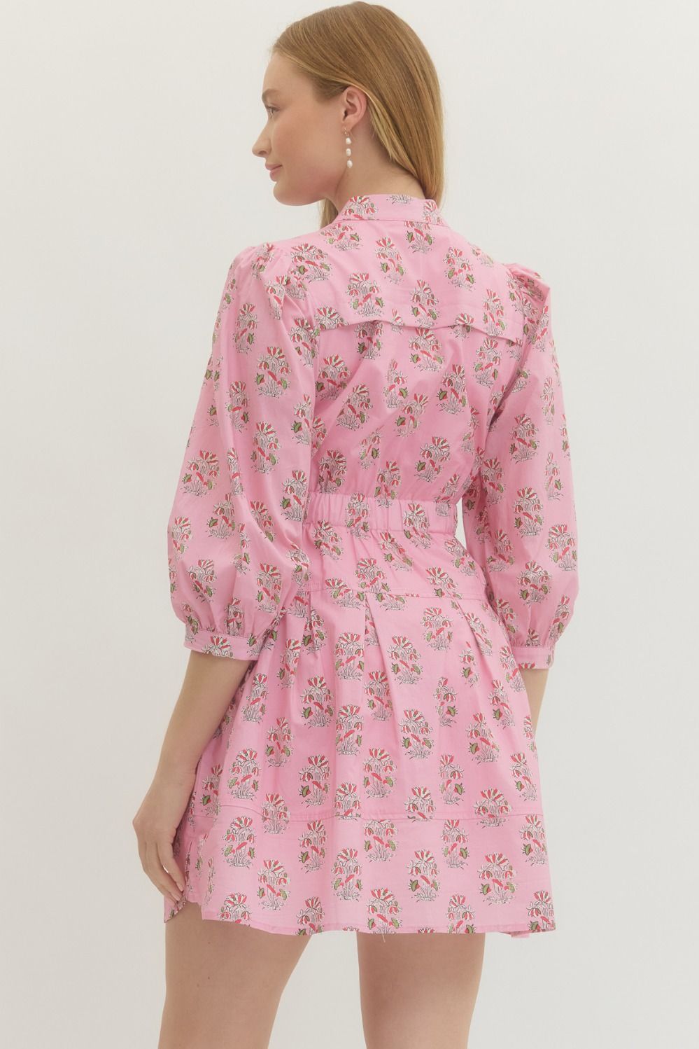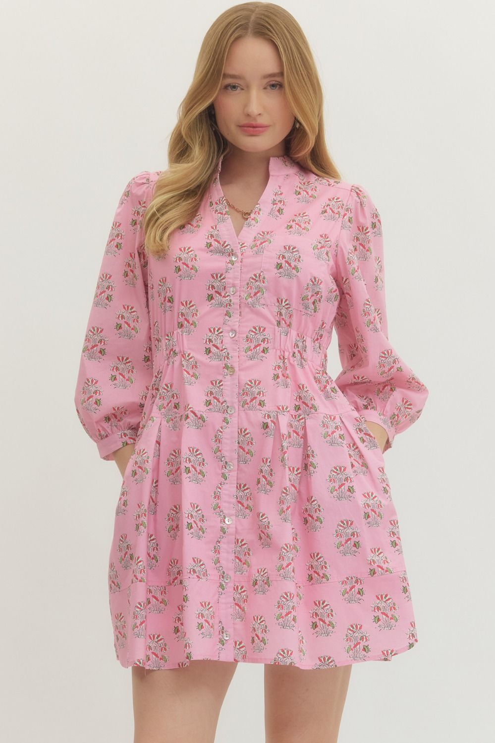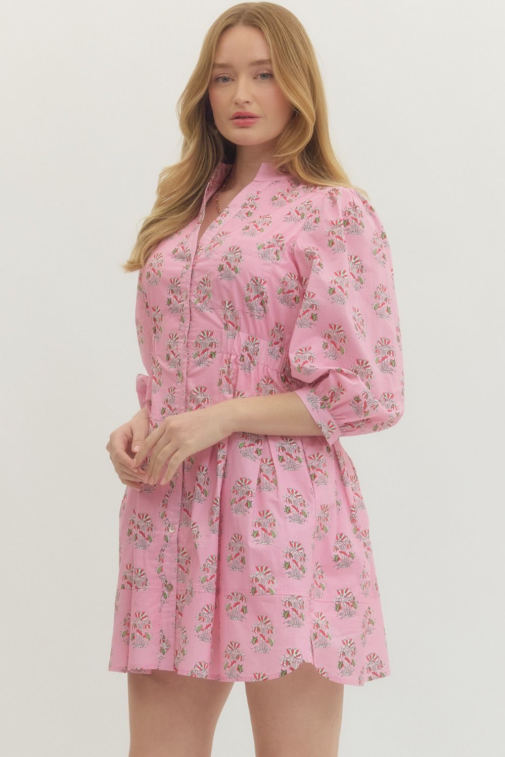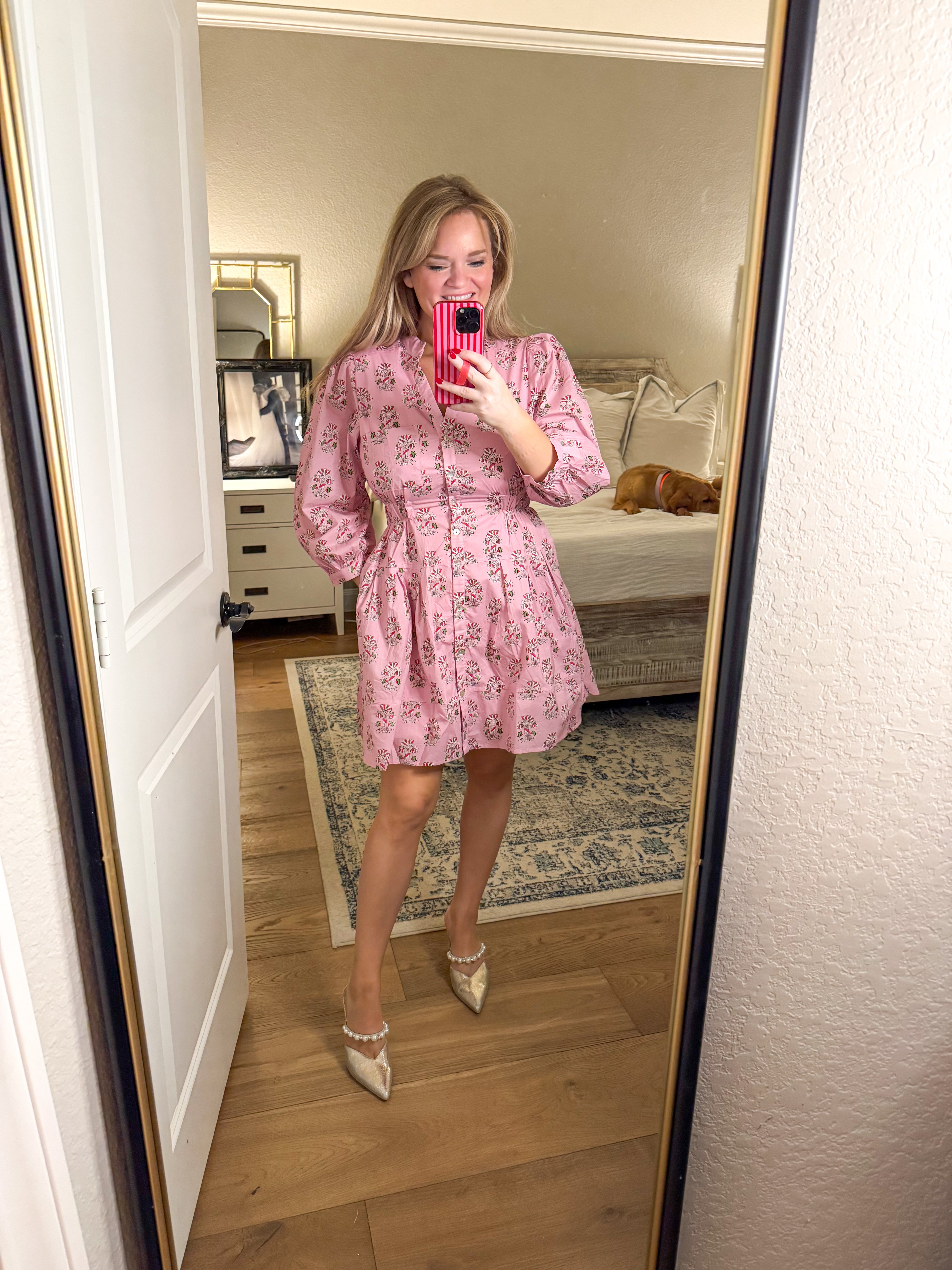 Floral print 3/4 sleeve mini dress featuring band collar and button closure at front. Side pockets. Lined. Woven. Non-sheer. Lightweight. 100% cotton. True to size, I am a 6/8 wearing a medium.
