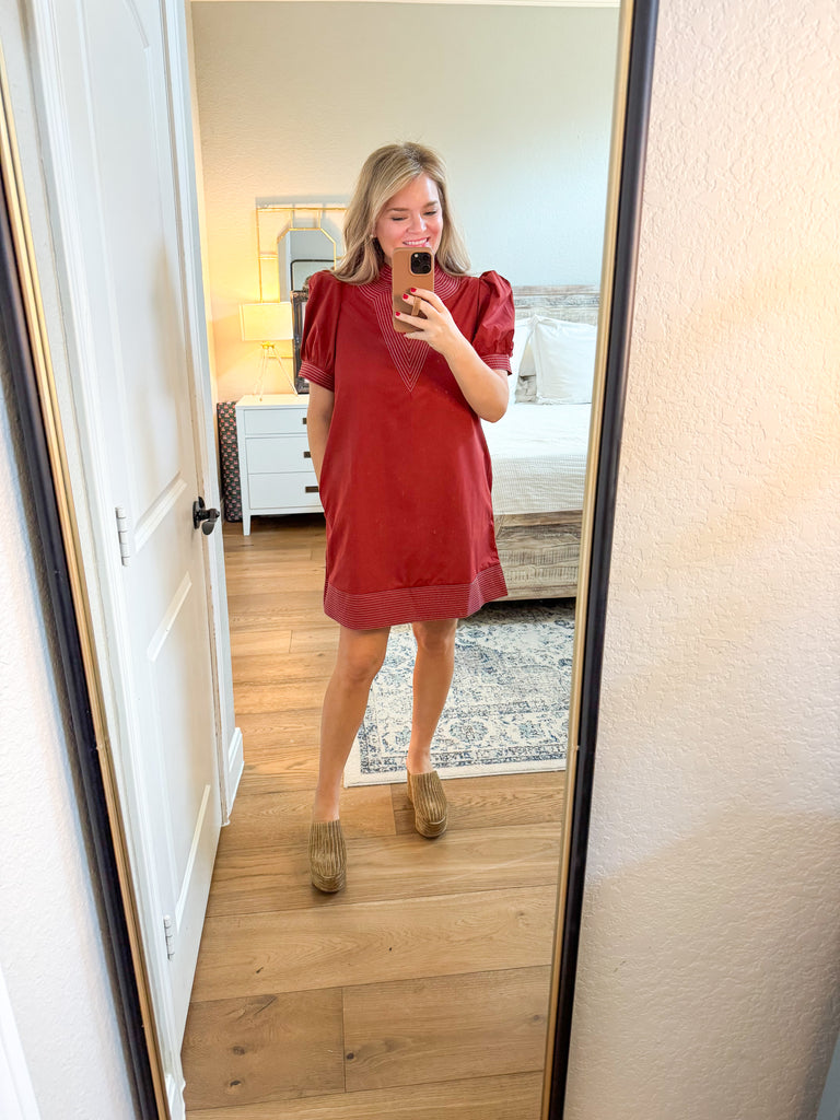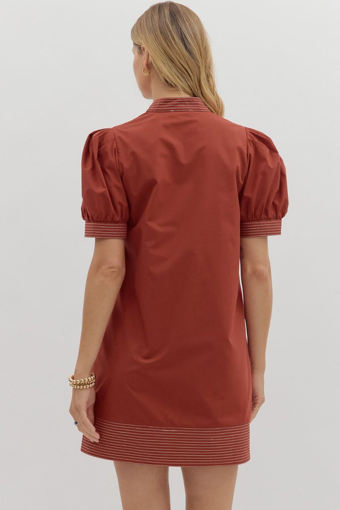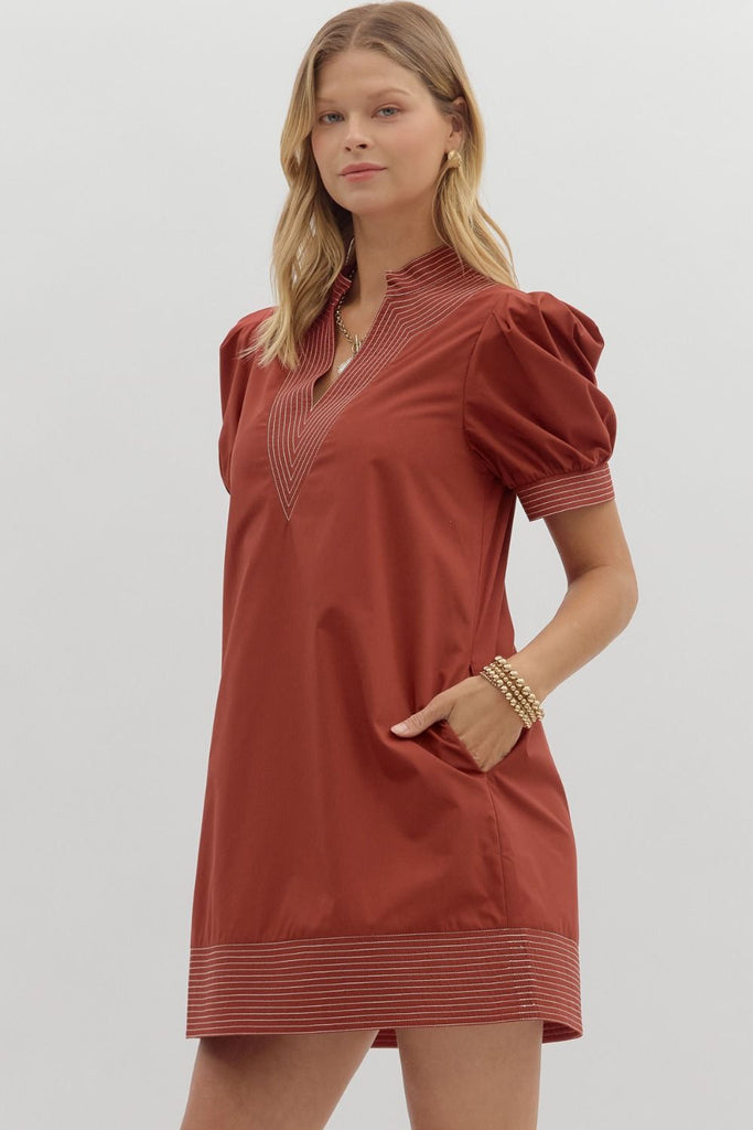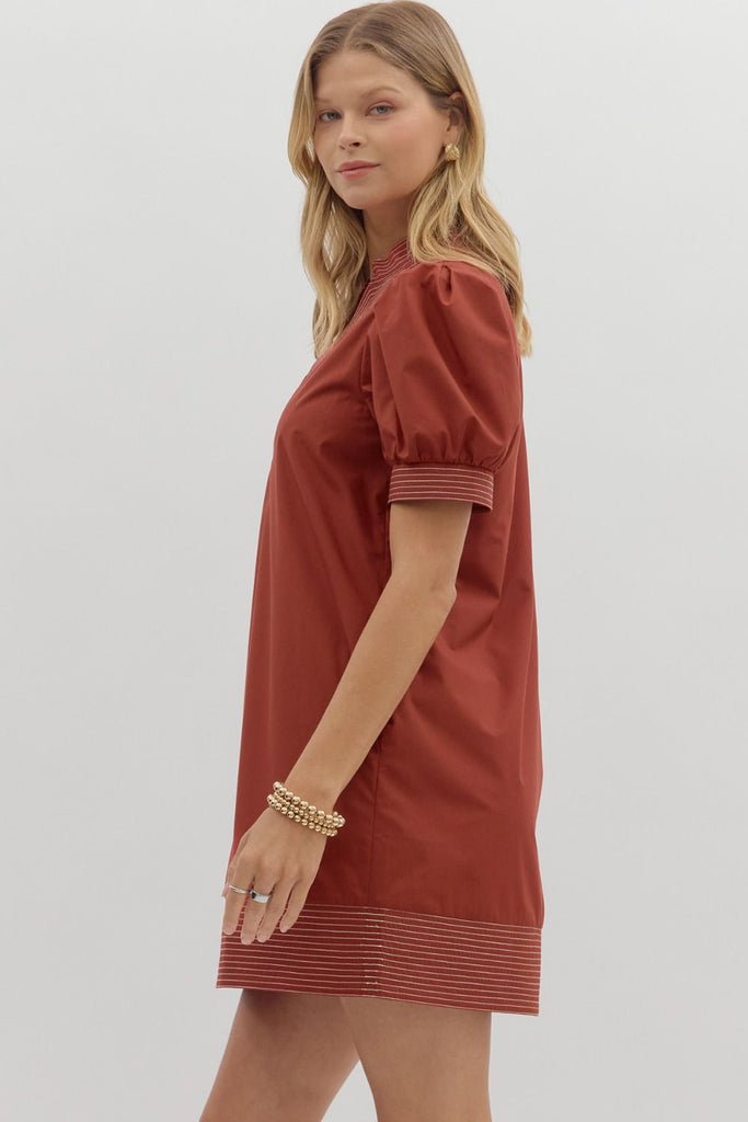 Solid cuff band short puff sleeve pullover dress featuring contrast stitch detailed neck band and hem finish. Side pockets, lined, woven, non-sheer, lightweight. 65% polyester, 35% cotton. True to size, I am a size 6/8 wearing a medium.