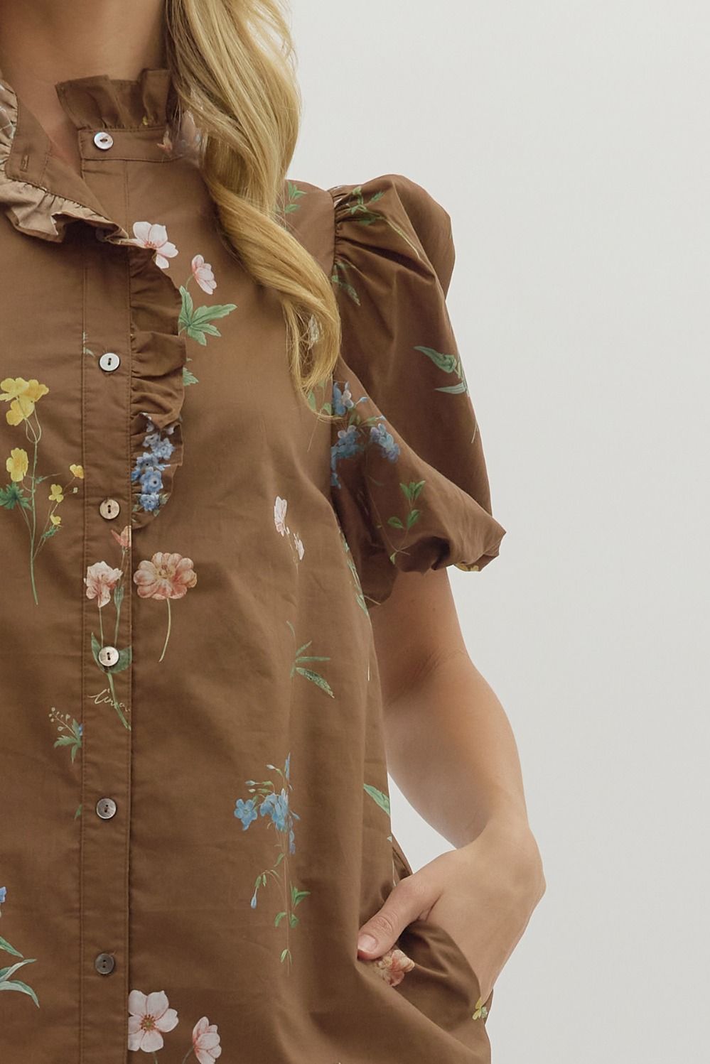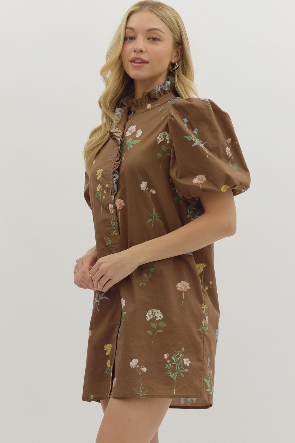 Floral print short bubble sleeve dress featuring ruffle accent band collar button front closure. Side pockets, lined, woven, non-sheer, lightweight. 100% cotton. Unlined, knit, non-sheer, lightweight. True to size, I am a 6 wearing a small.