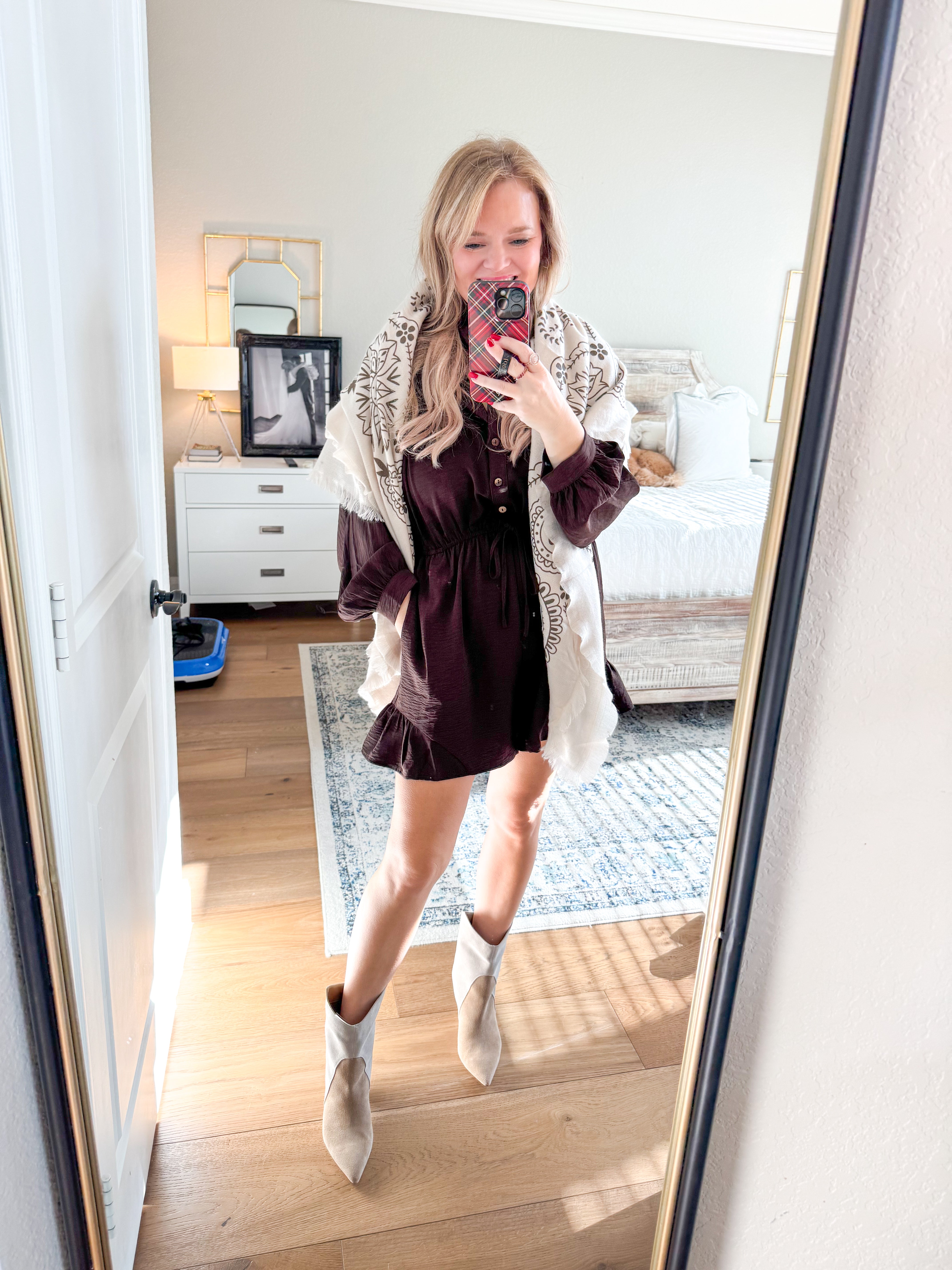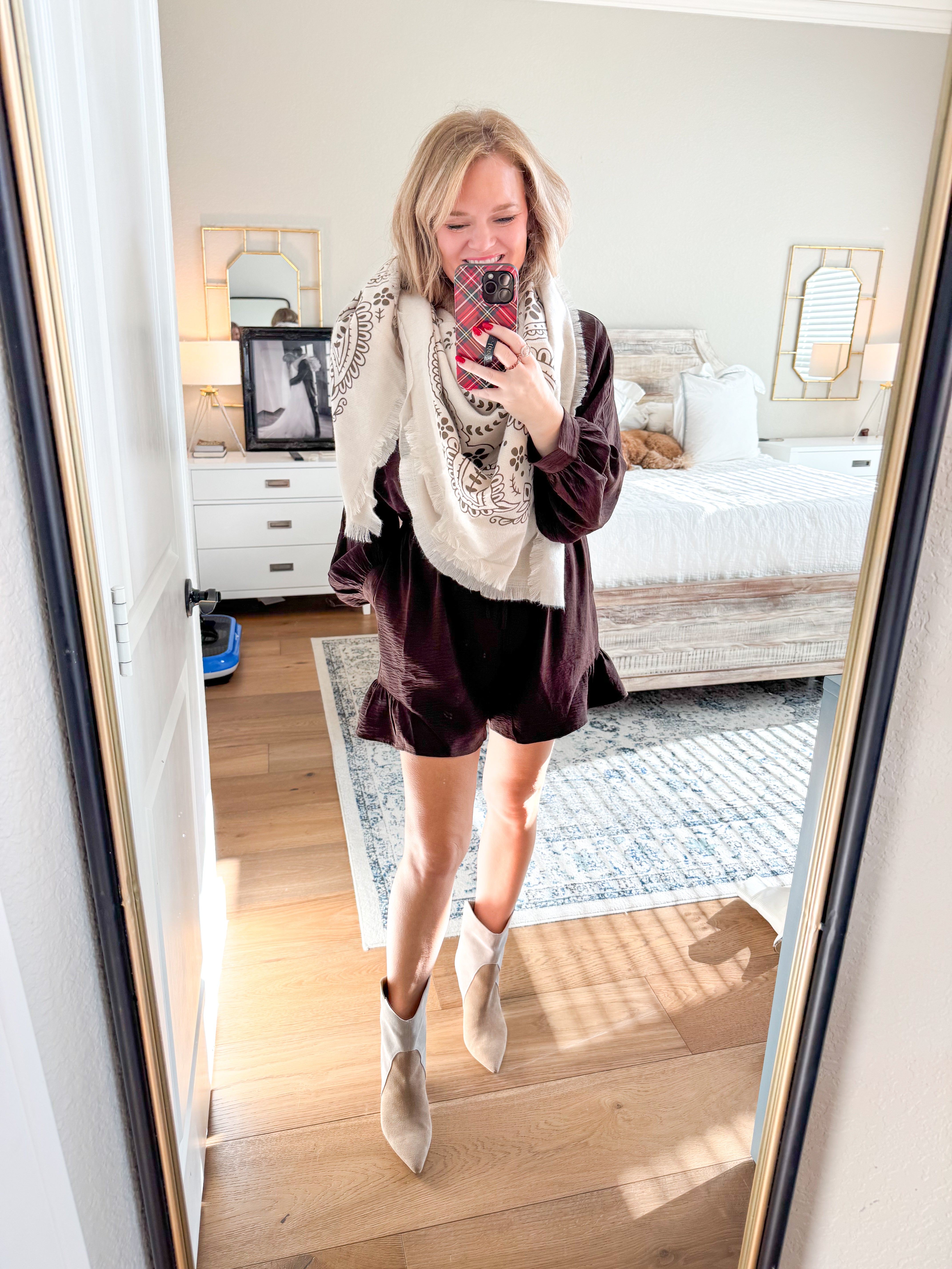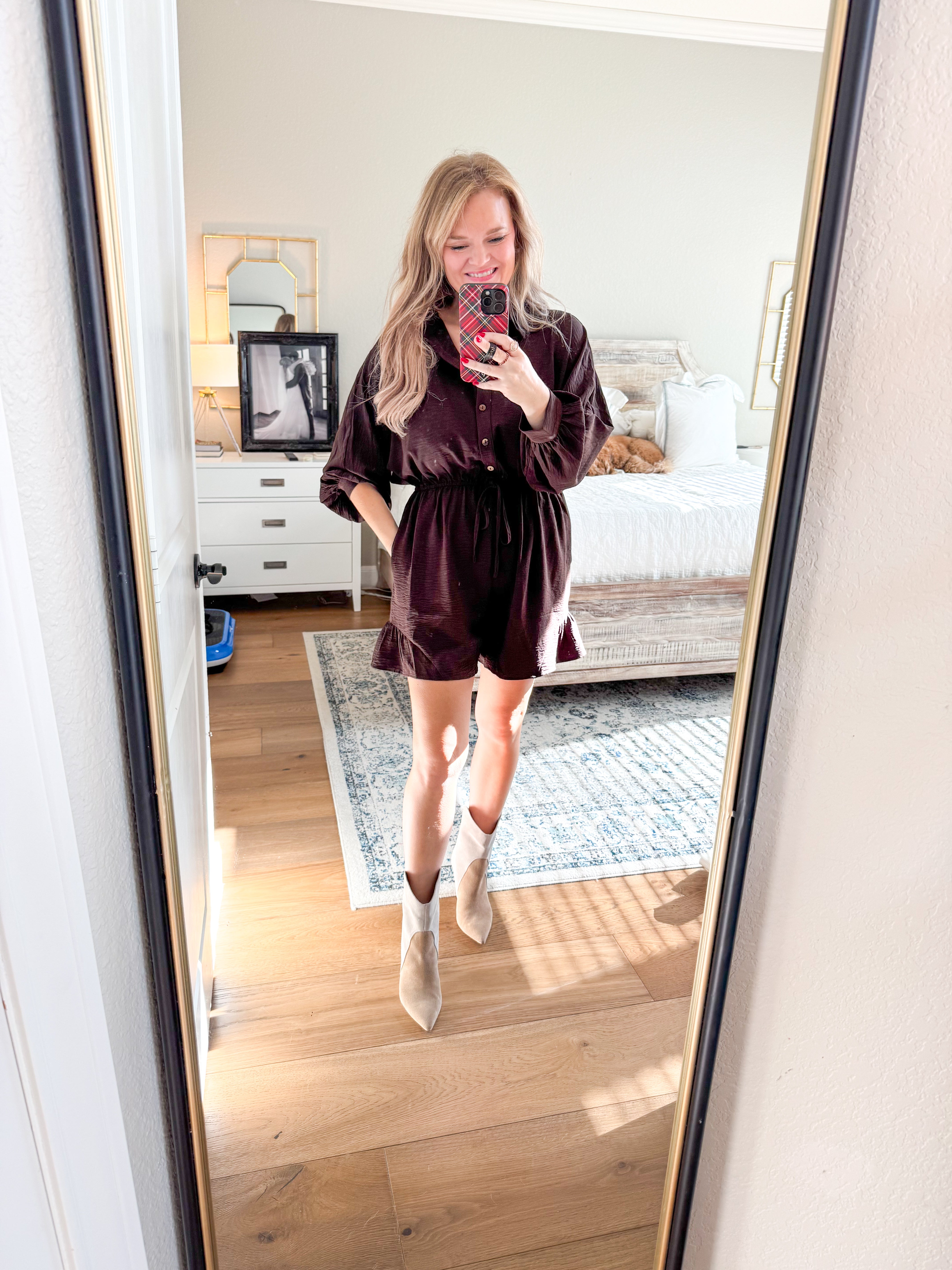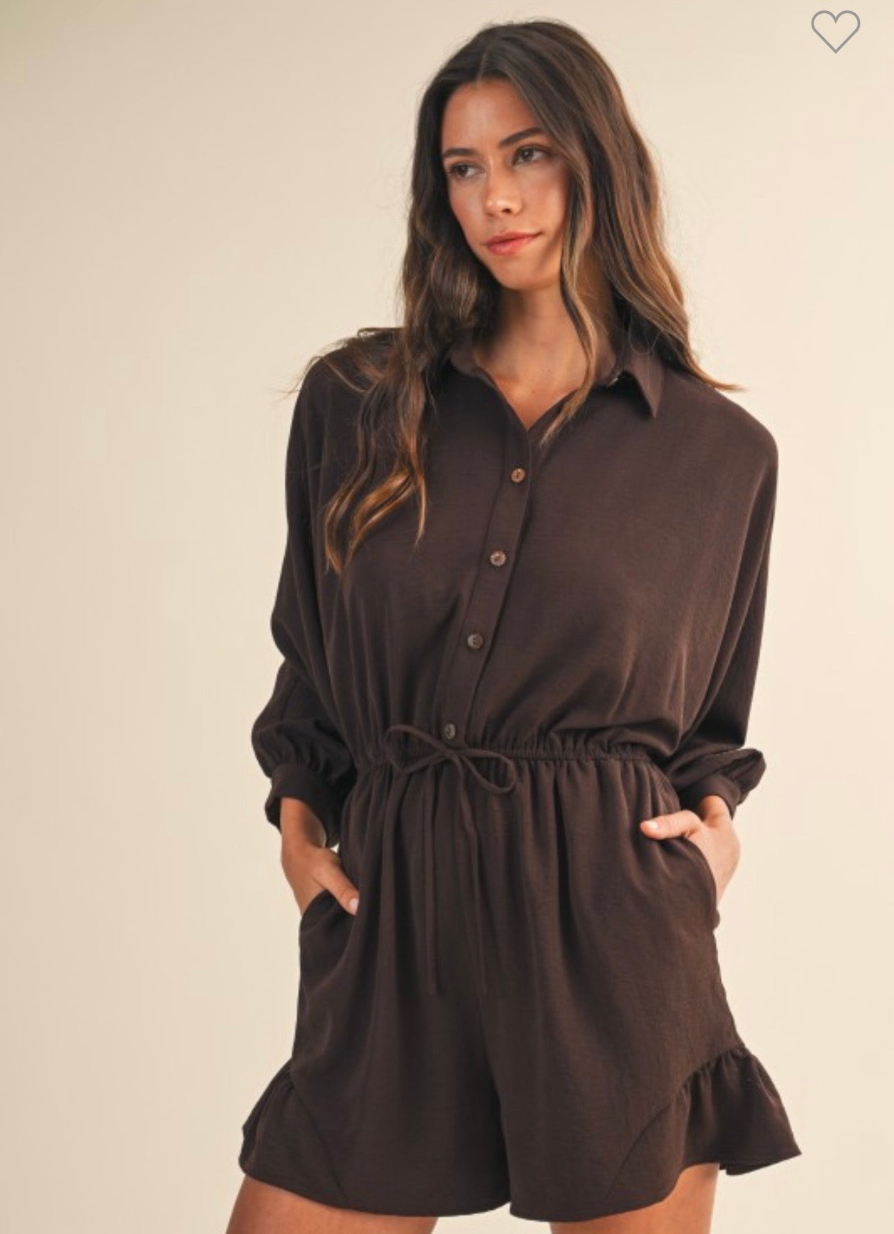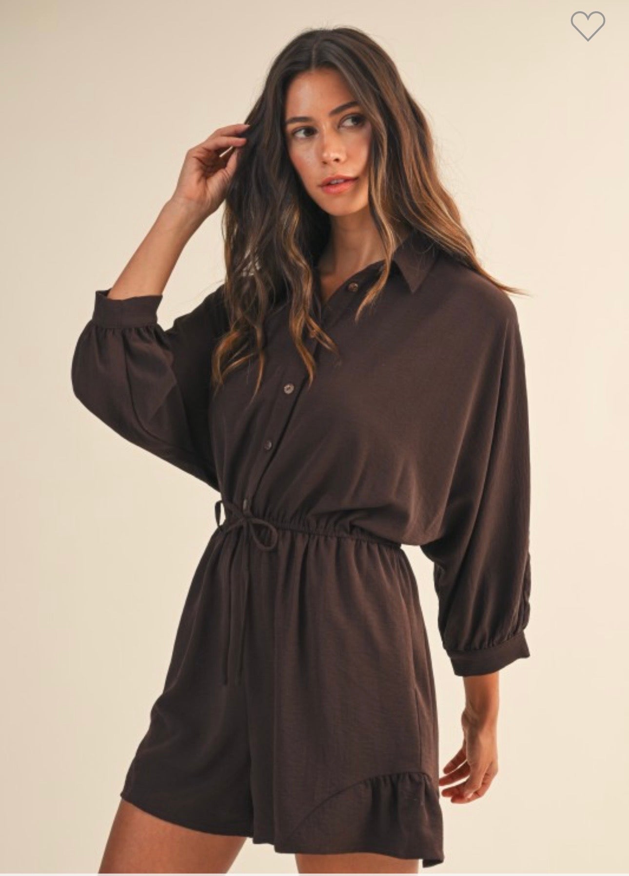 Button down romper with ¾ dolman sleeves, drawstring waist, side pockets, ruffled bottom. True to size, I am a 6/8 wearing a medium, can size down. 100% polyester.