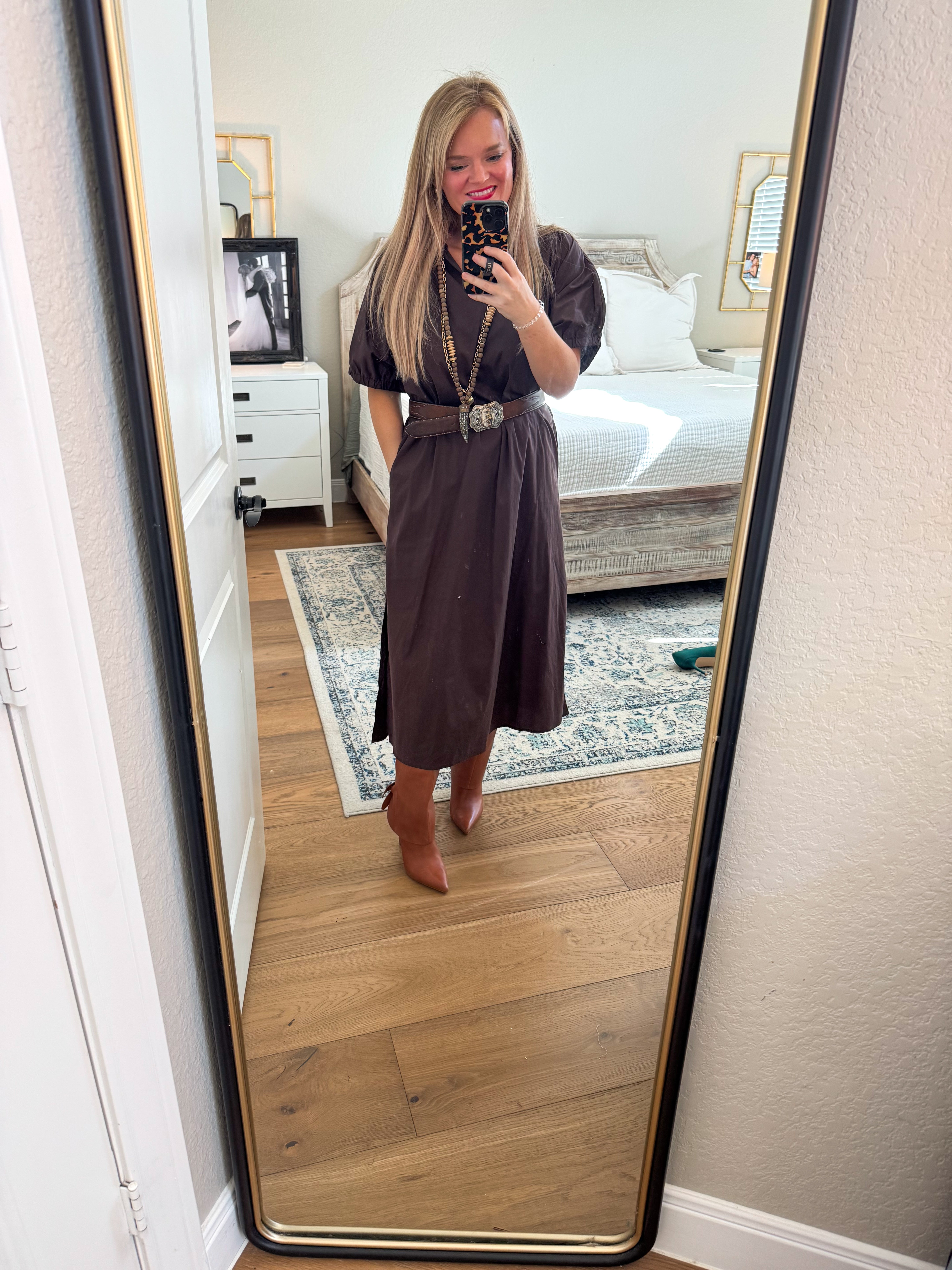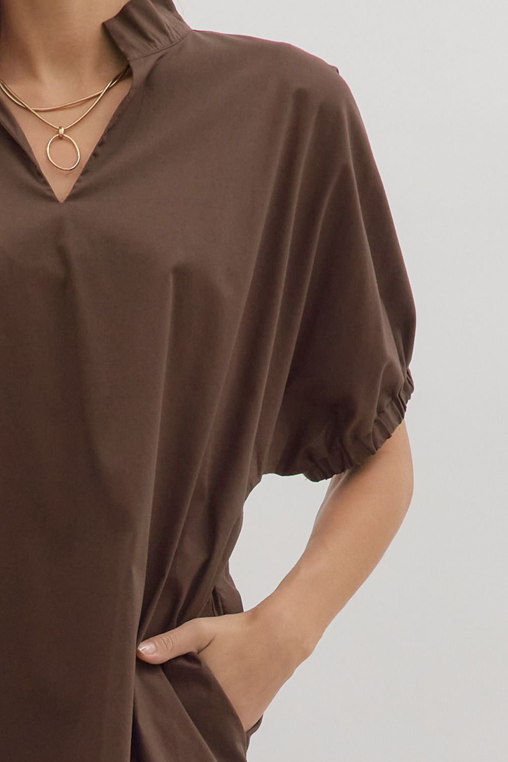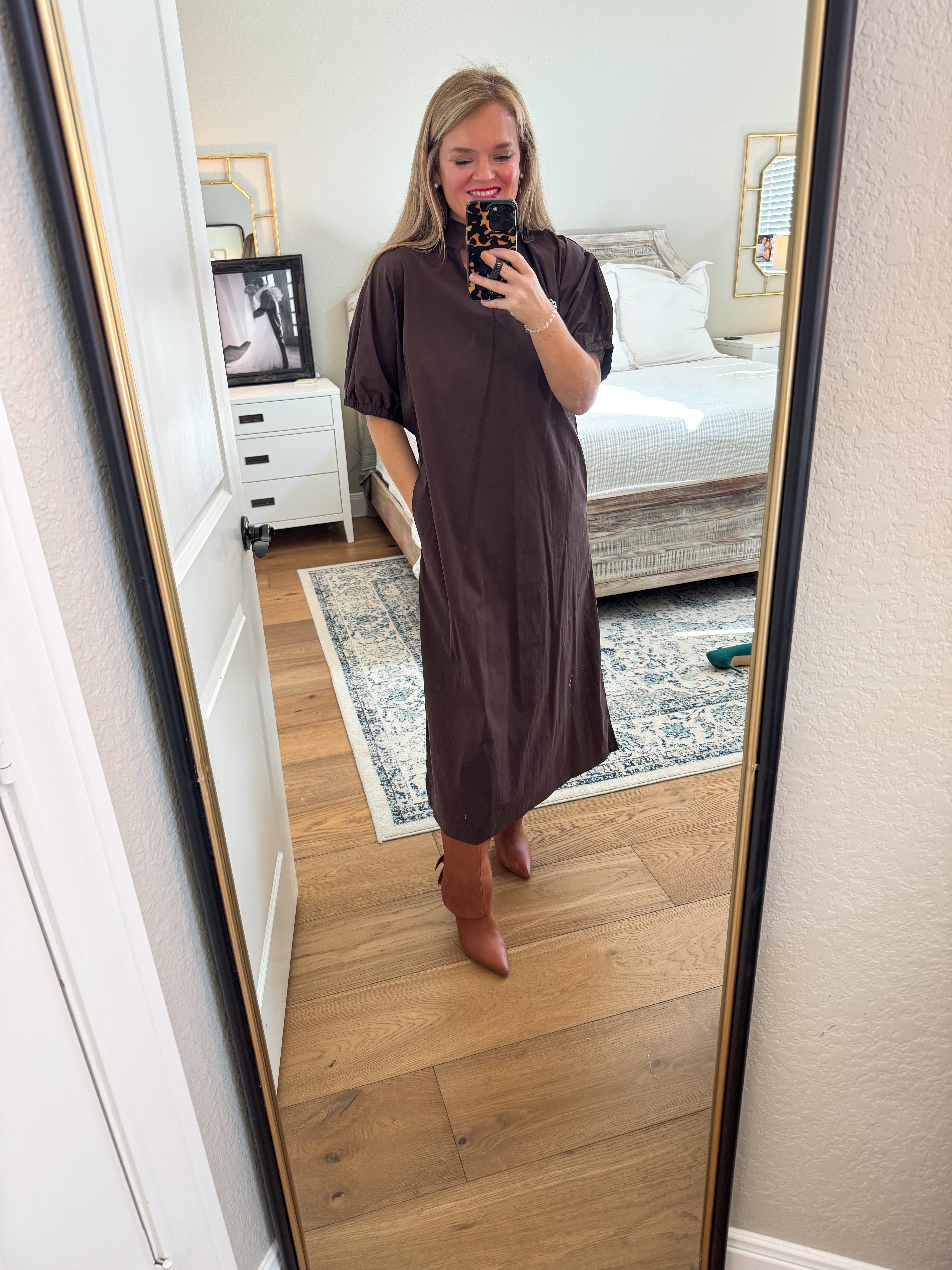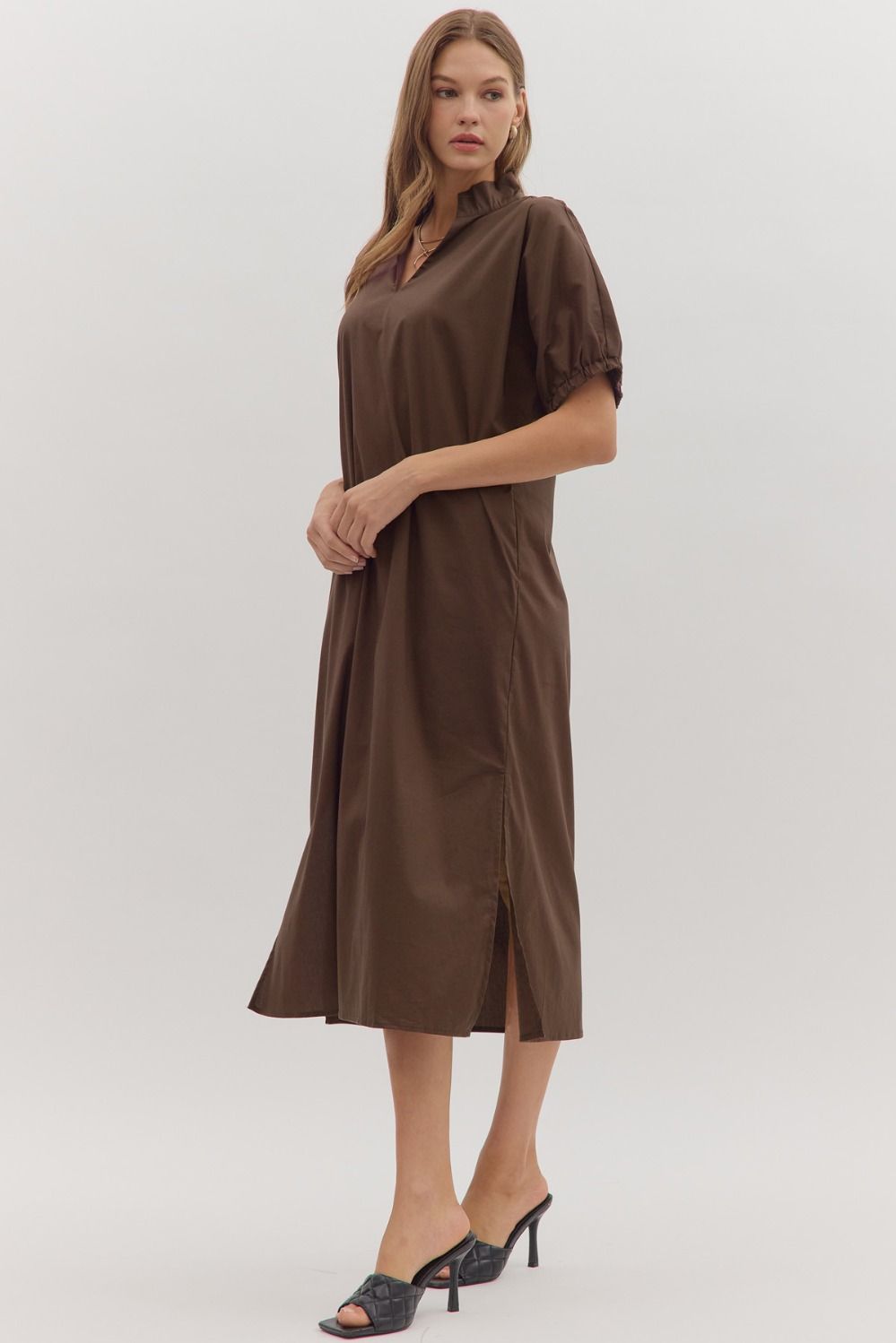 Solid short puff sleeve midi dress featuring band collar with v-neckline. Elasticated sleeve opening, side pockets, side slits, lined, woven, non-sheer, lightweight. I am a 6/8 wearing a small. 70% cotton, 27% nylon, 3% spandex.
