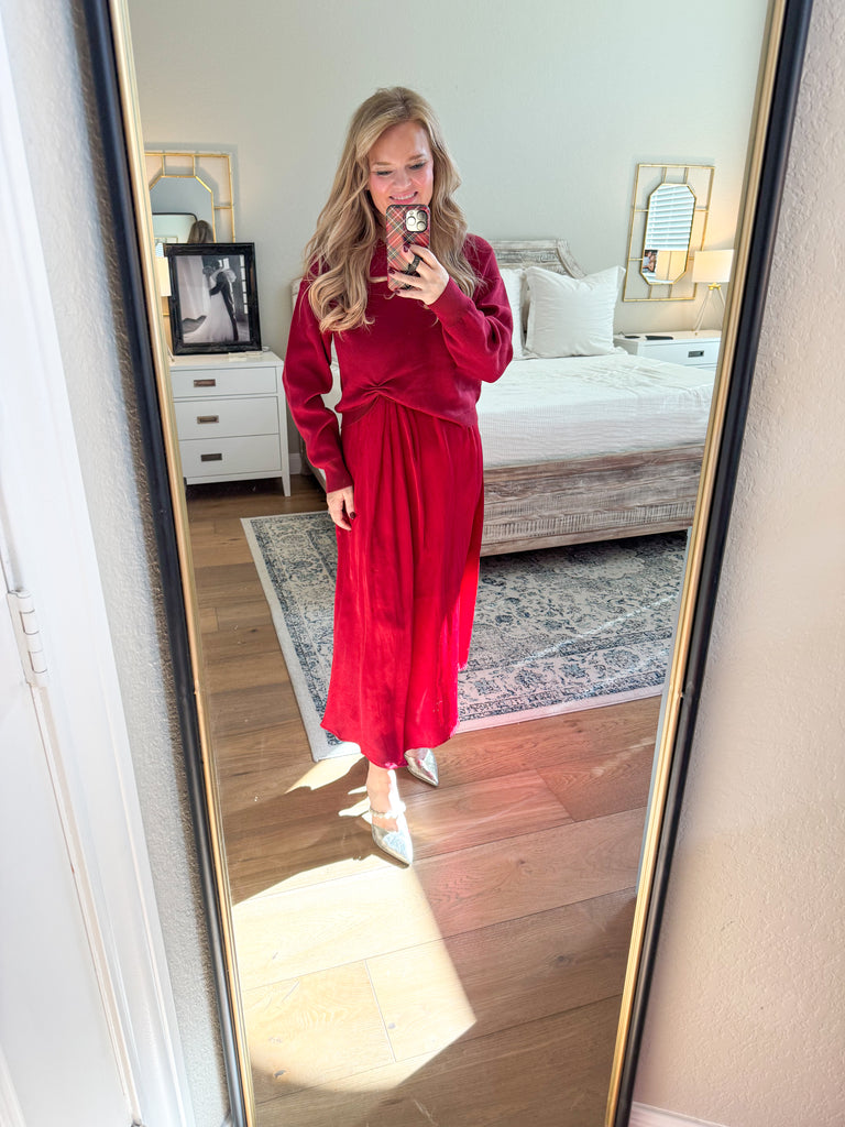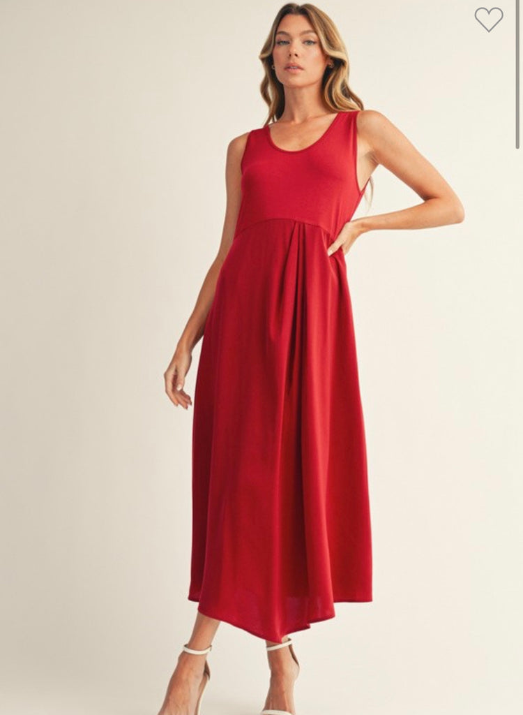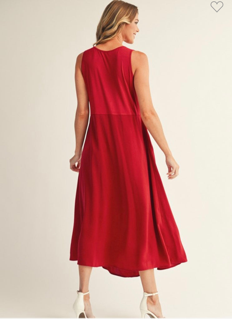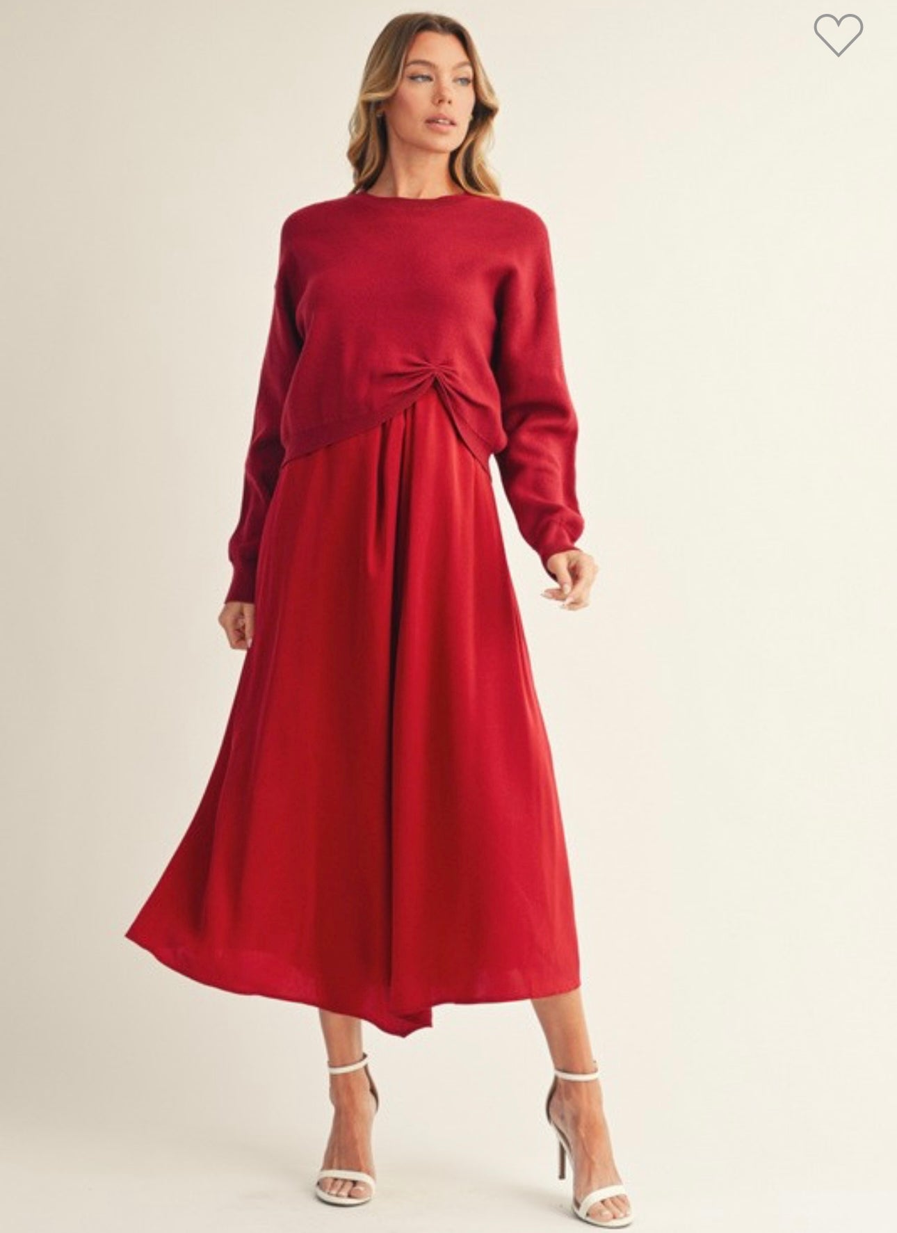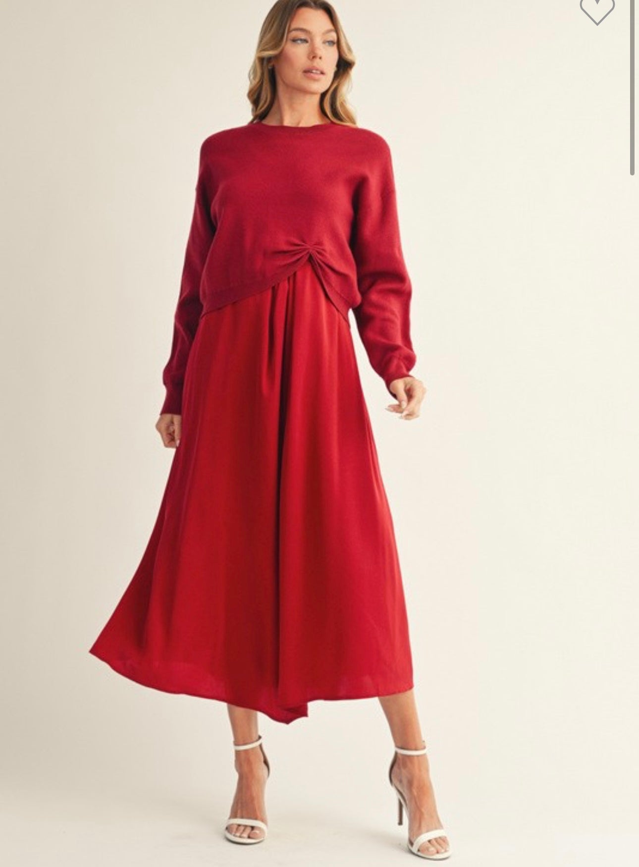 True to size, I am a 6/8 wearing a small. Sleeveless mixed media maxi dress with sweater overlay. Sweater is detached and both dress and sweater can be worn separately. 92% rayon, 8% spandex.