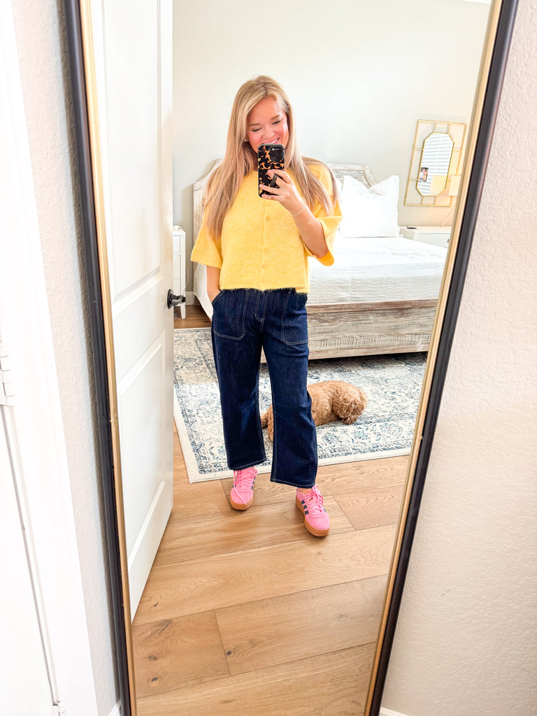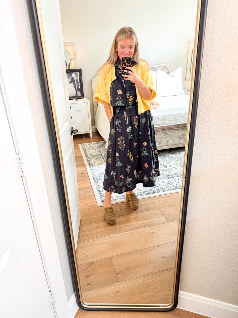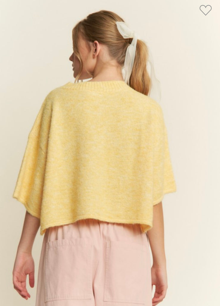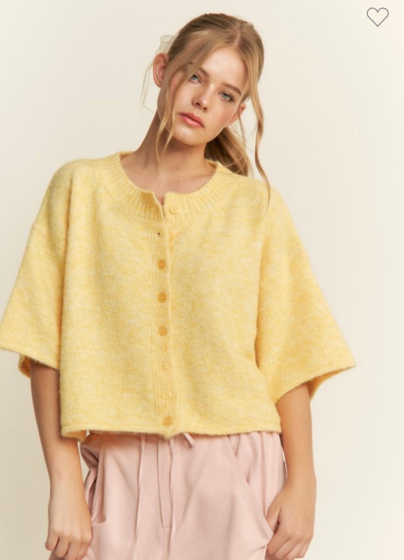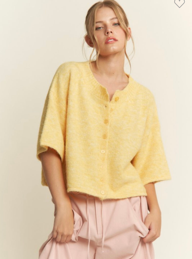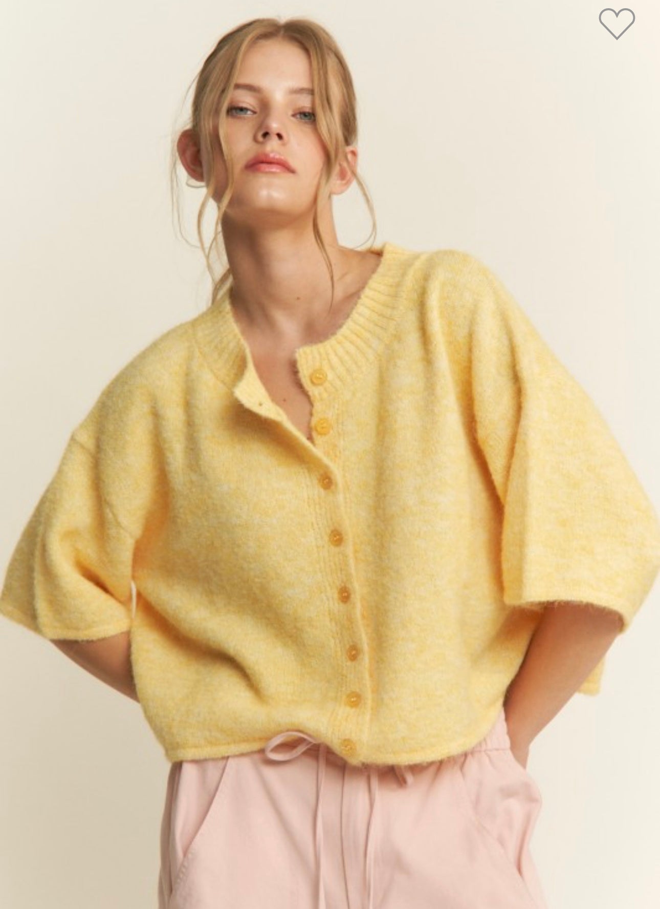 Boxy knit cardigan. Soft brushed knit texture, front button closure, elbow-length ¾ sleeve. Ribbed crew neckline and hem. 70% polyester, 15% nylon, 8% acrylic, 5% wool, 2% spandex. True to size, I am a 6/8 wearing a medium.