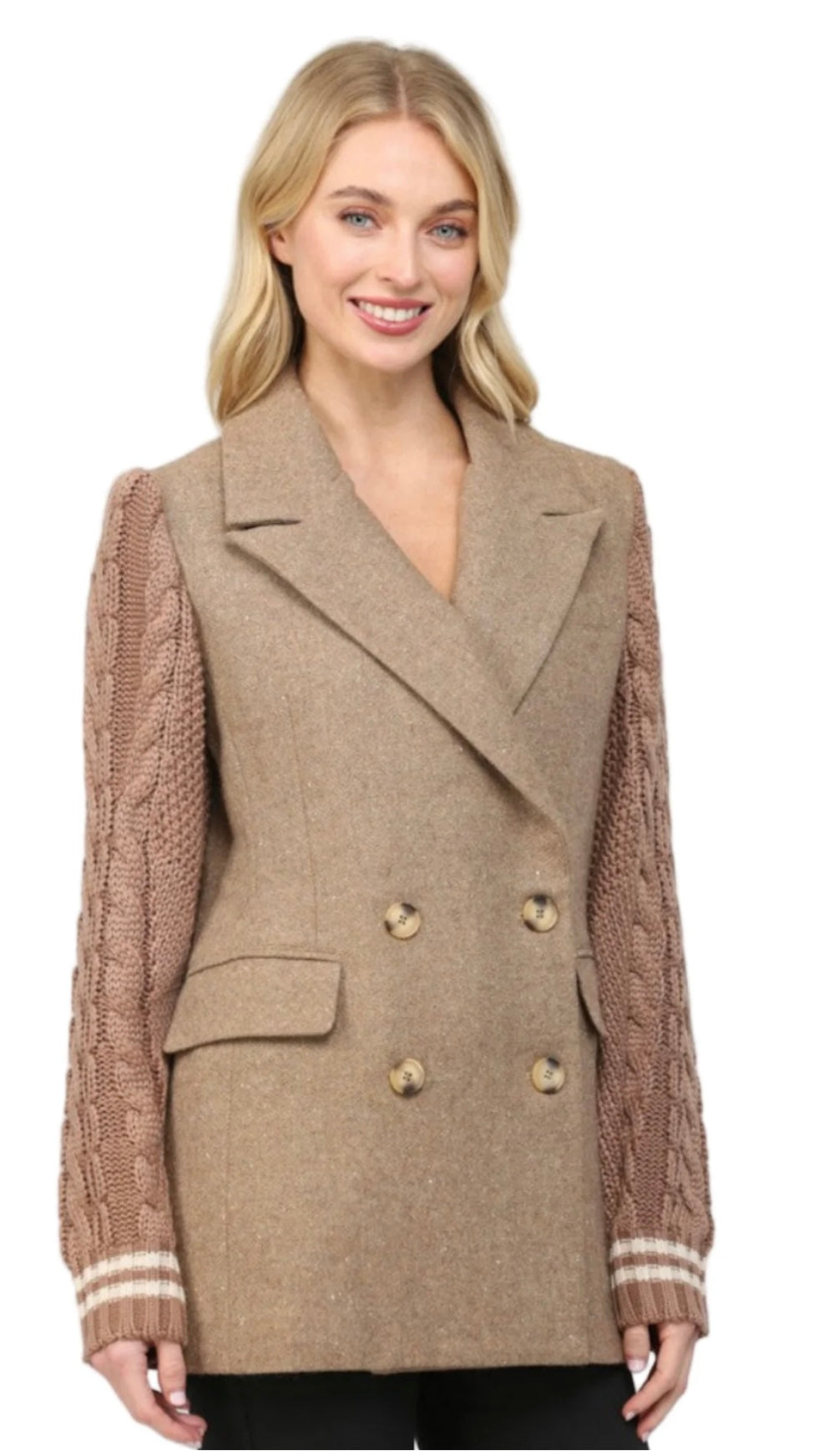 True to size, I am a 6/8 wearing a small. Oversized knitted cable sleeve double breasted blazer.