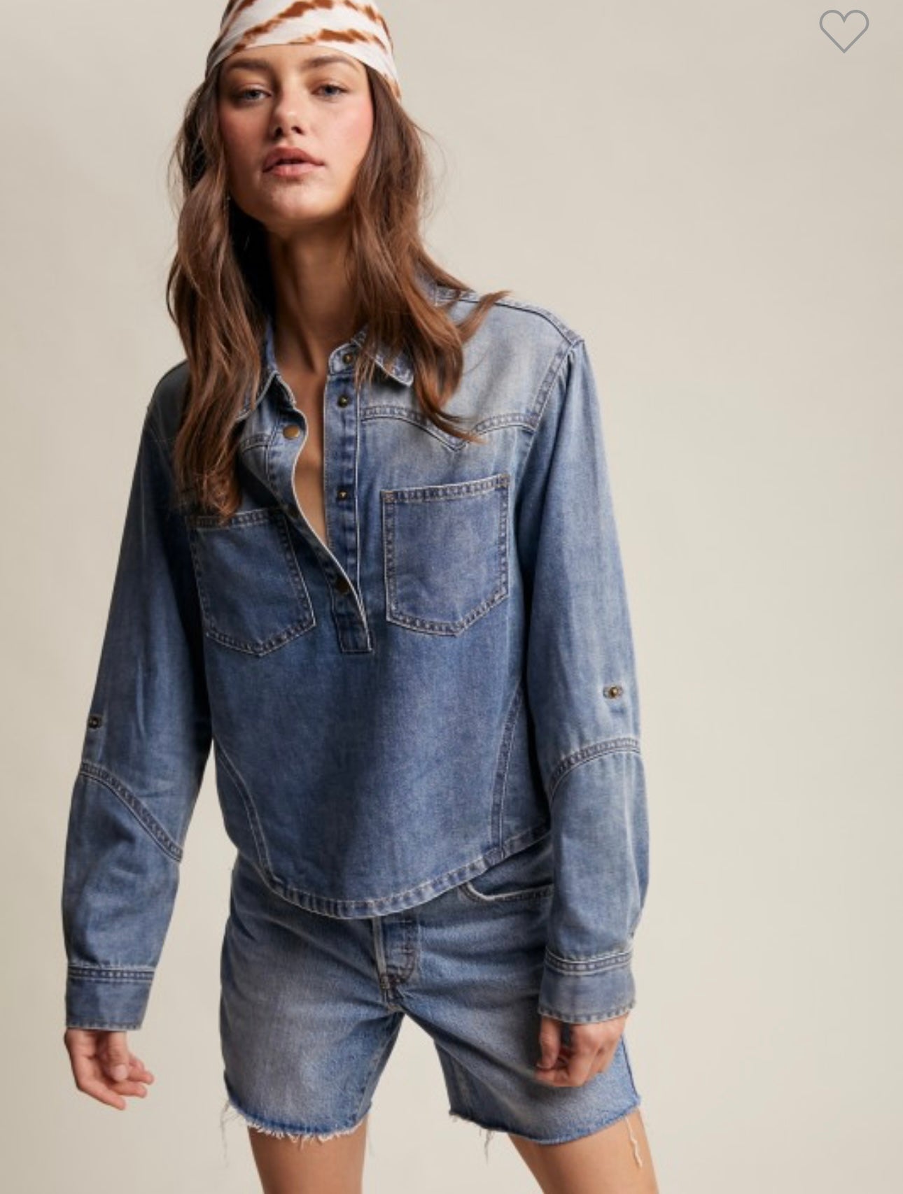 100% cotton denim with soft feel. Long sleeve with button cuffs. True to size, I am a 6/8 wearing a medium.