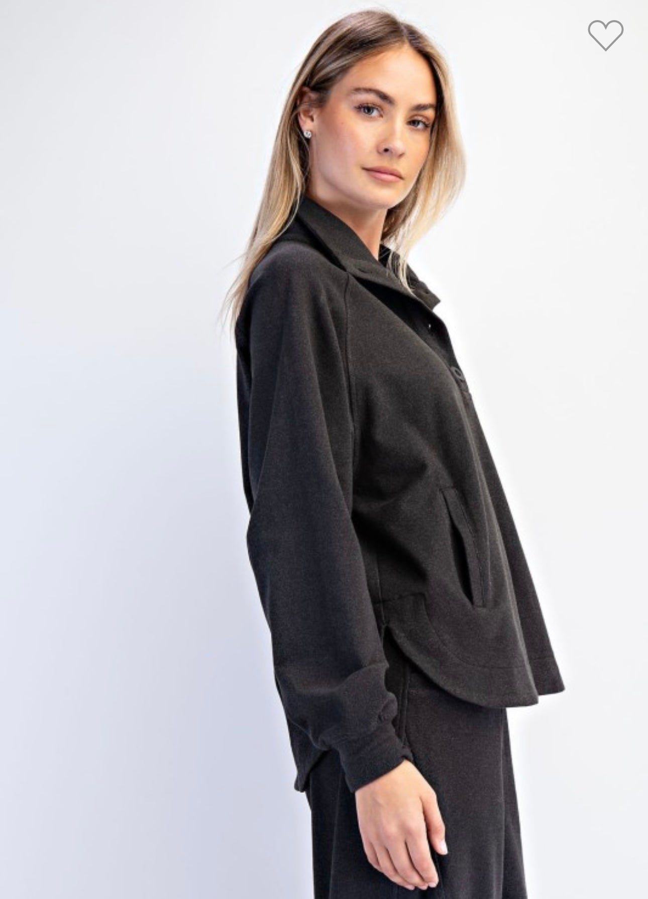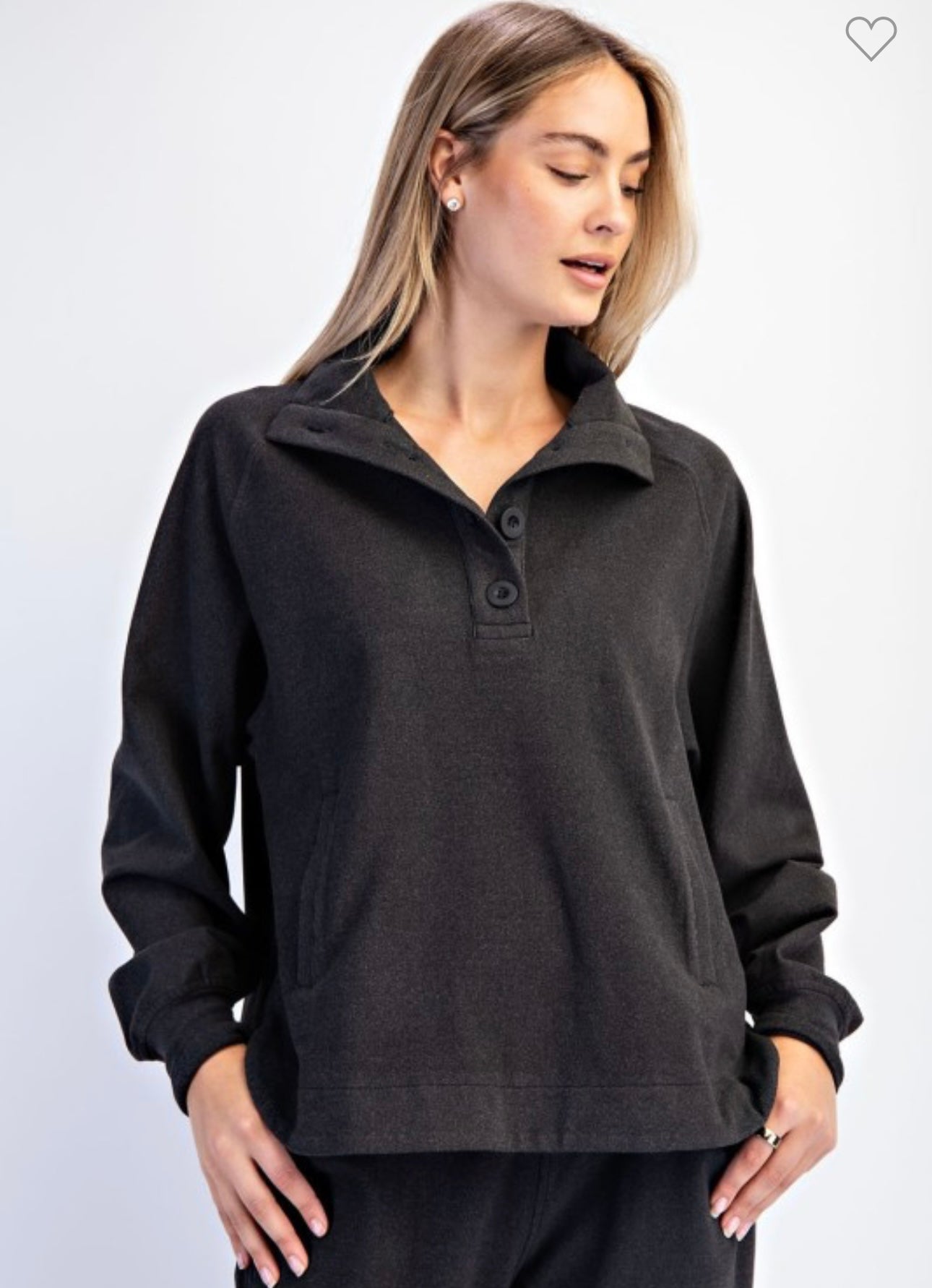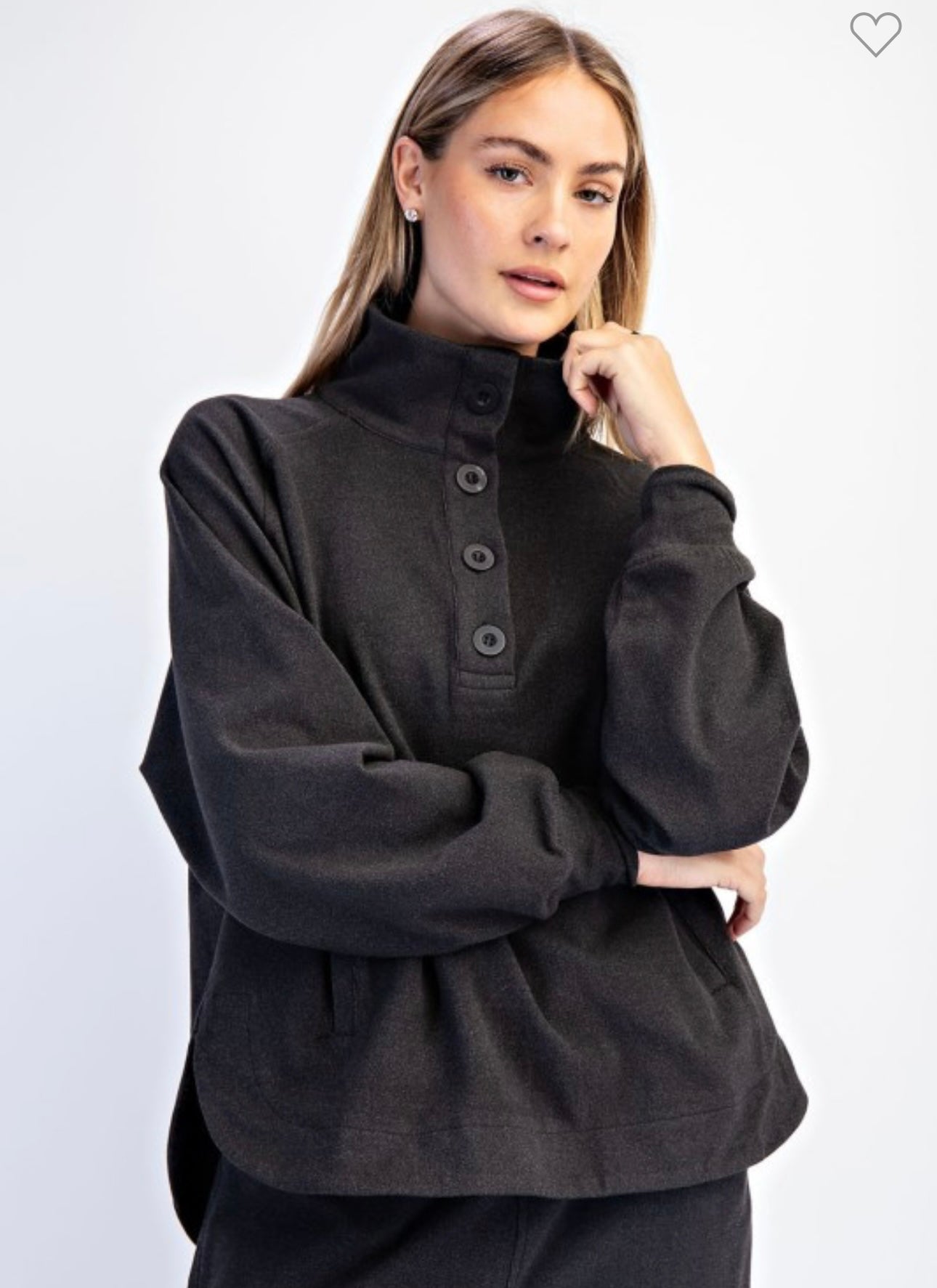 Brushed rib button down pullover. Mock neck, front pockets. Relaxed fit. 90% polyester, 10% spandex. True to size, I am a 6 wearing a medium but would size down to a small.