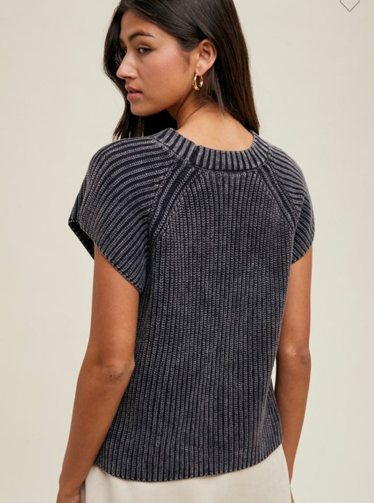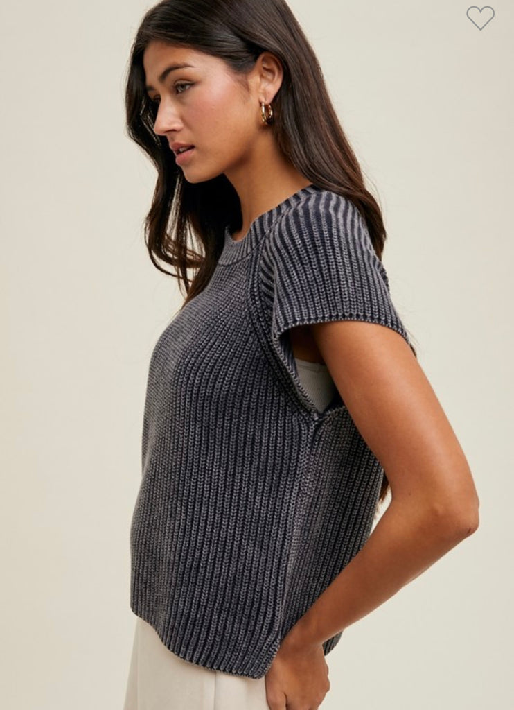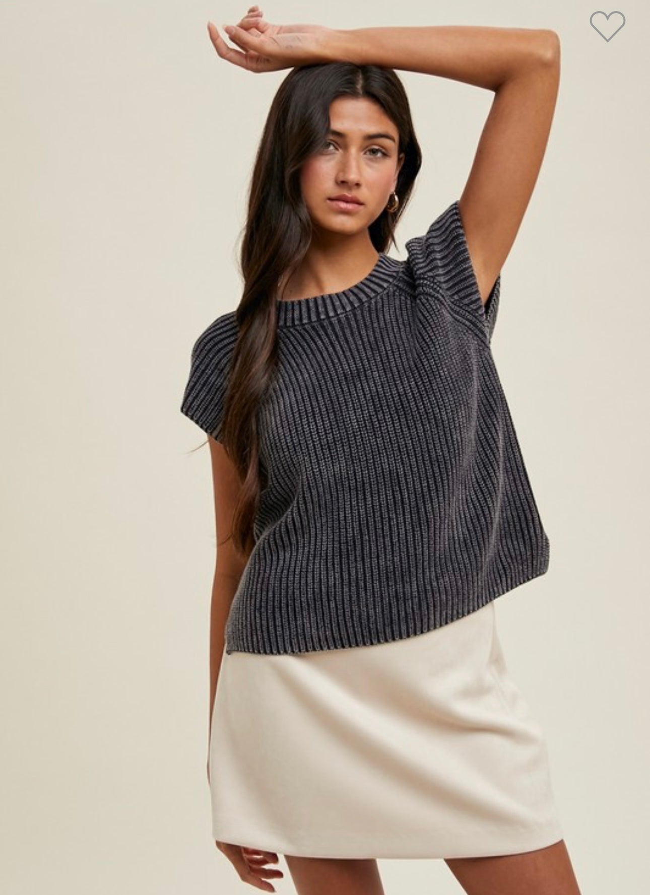 Washed sweater top. 100% cotton. True to size, I am a 6 wearing a medium.