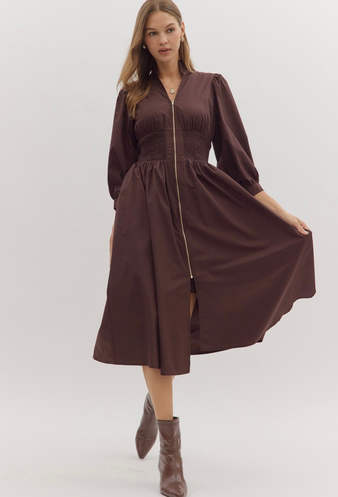 True to size, I am a 6/8 wearing a medium. 80% polyester, 20% cotton solid puff ¾ sleeve midi dress featuring smocked waist detail. Zipper closure at front. Button closure at sleeve. Side pockets, Lined, woven, non-sheer, lightweight.