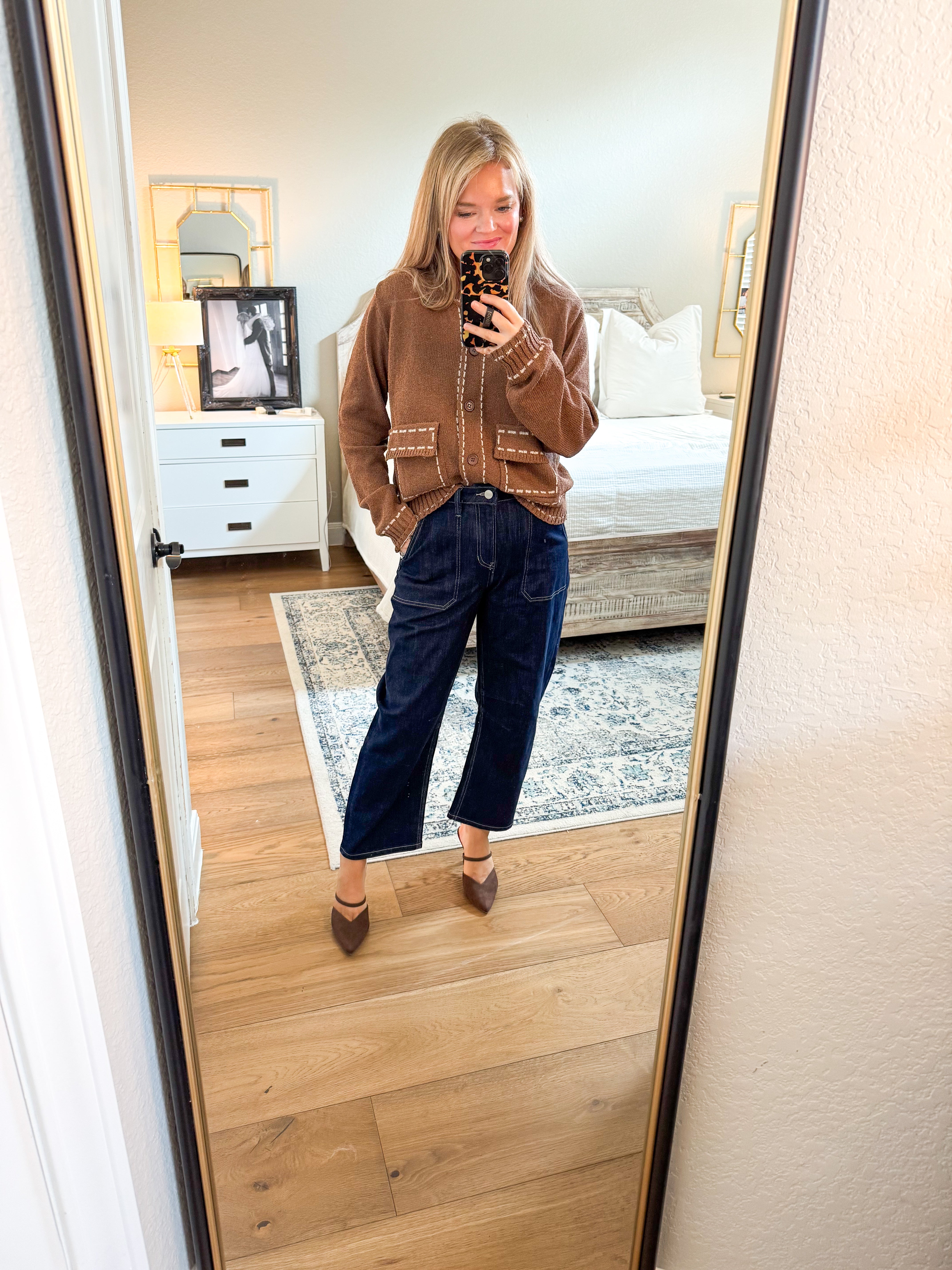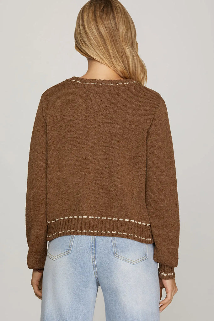 Long sleeve front button closure sweater cardigan with front pocket and contrast stitch detail. 100% polyester. I am a 6/8 wearing a medium.
