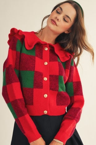 42% acrylic, 30% polyester, 28% nylon. Christmas plaid sailor cardigan. I am a 6/8 wearing a small.