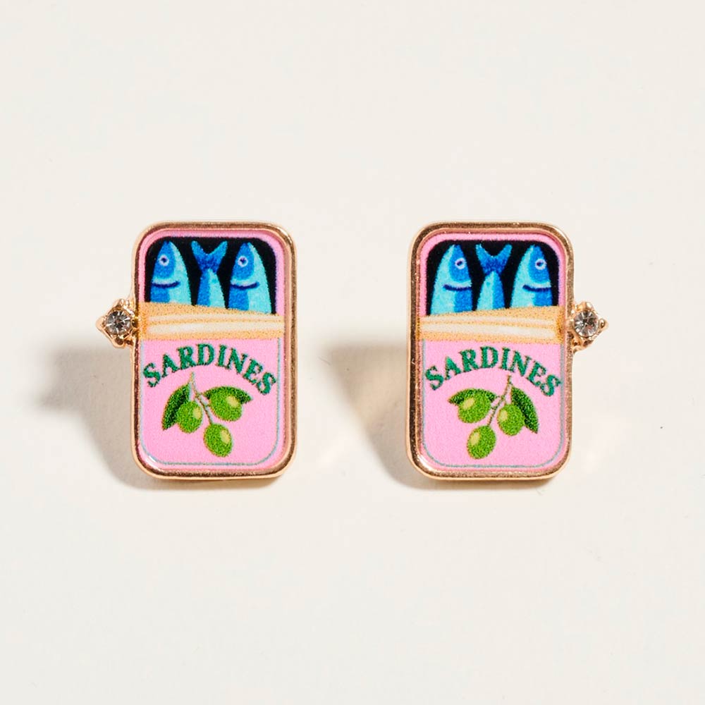• Whimsical sardine can stud earrings featuring a playful fish and citrus graphic design for a fun, food-inspired statement. Lightweight and eye-catching, these novelty studs add personality to everyday outfits, themed events, gift shops, and quirky accessory collections.