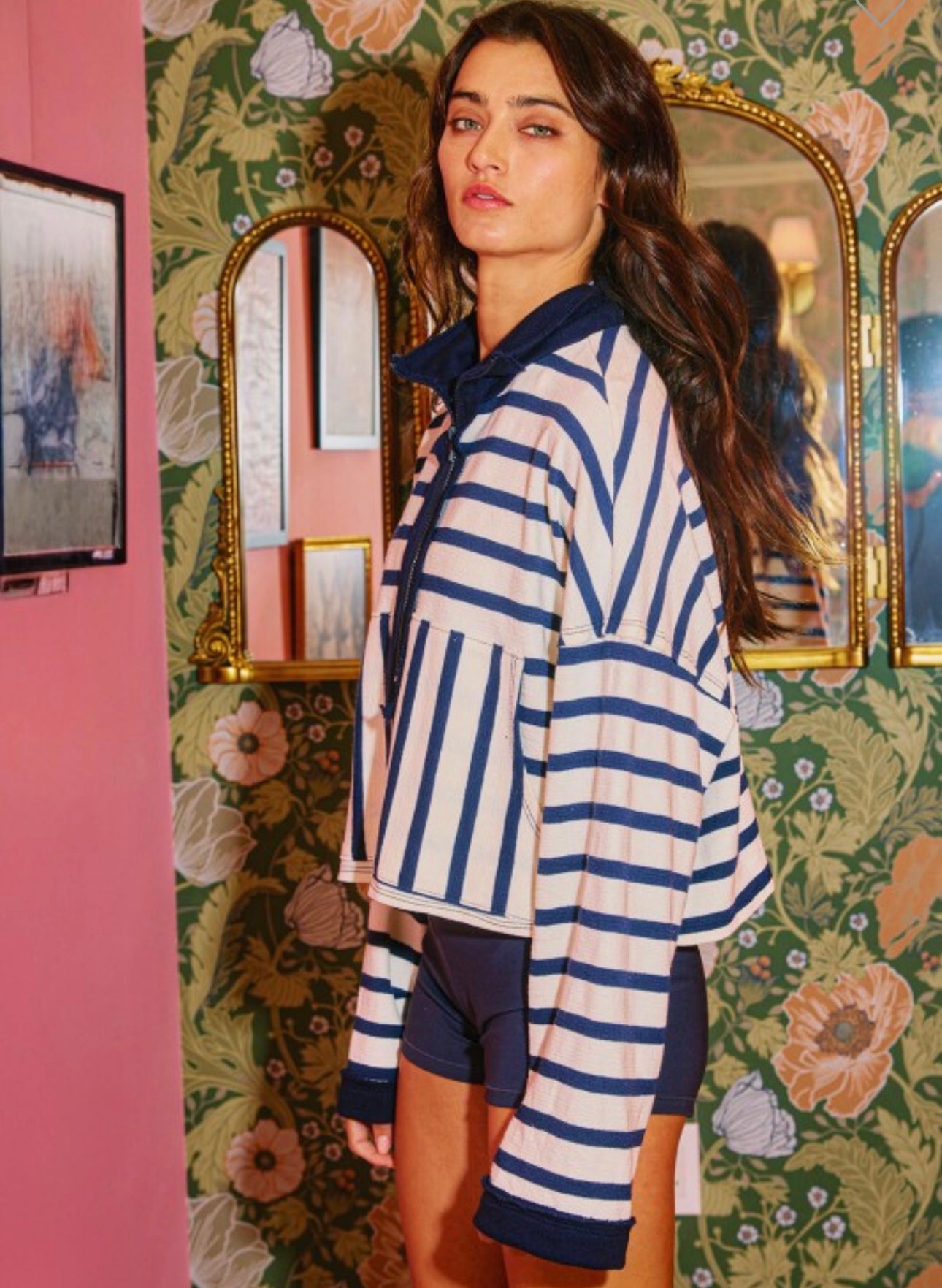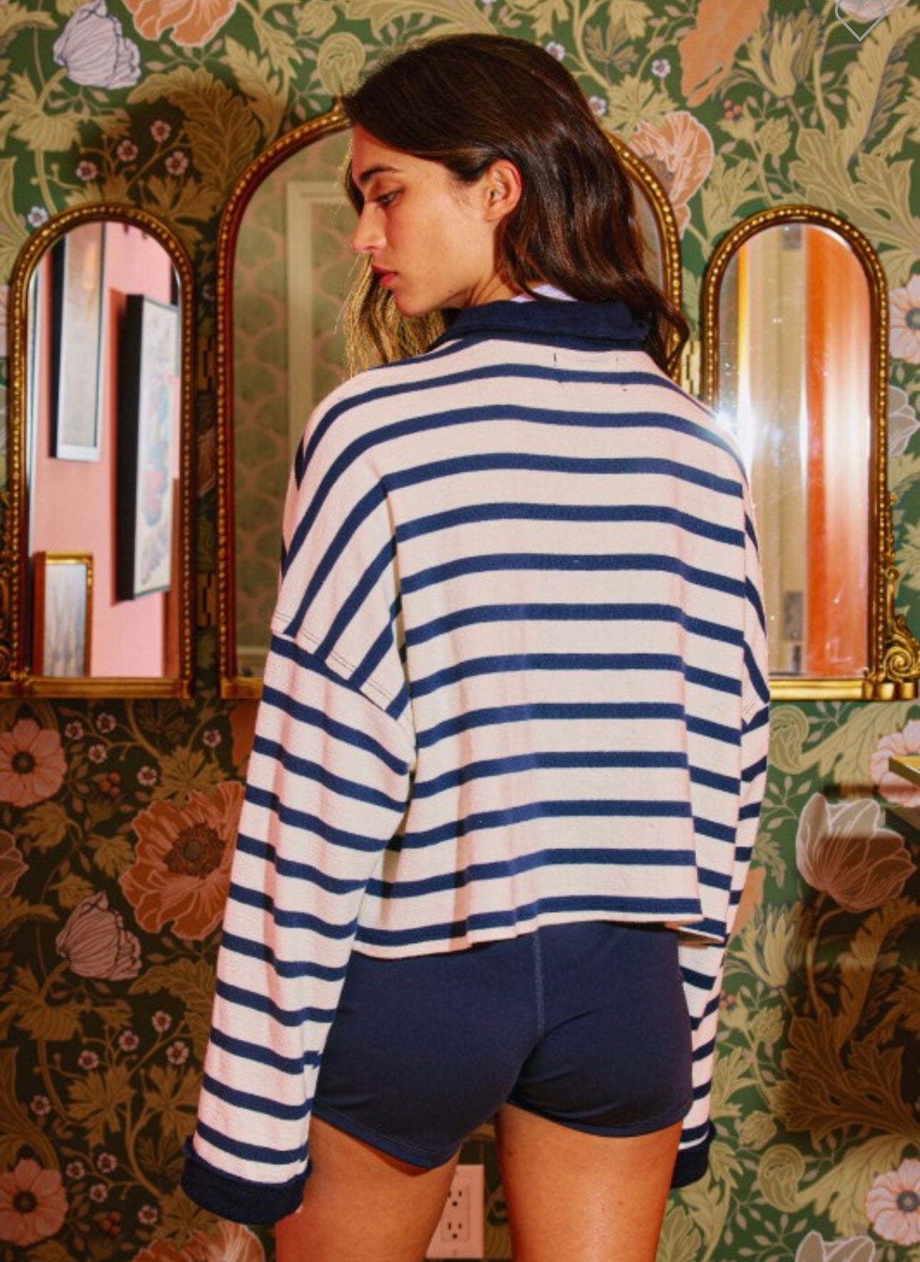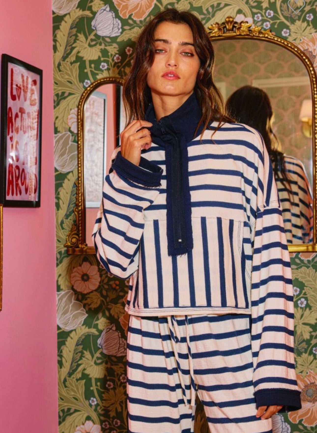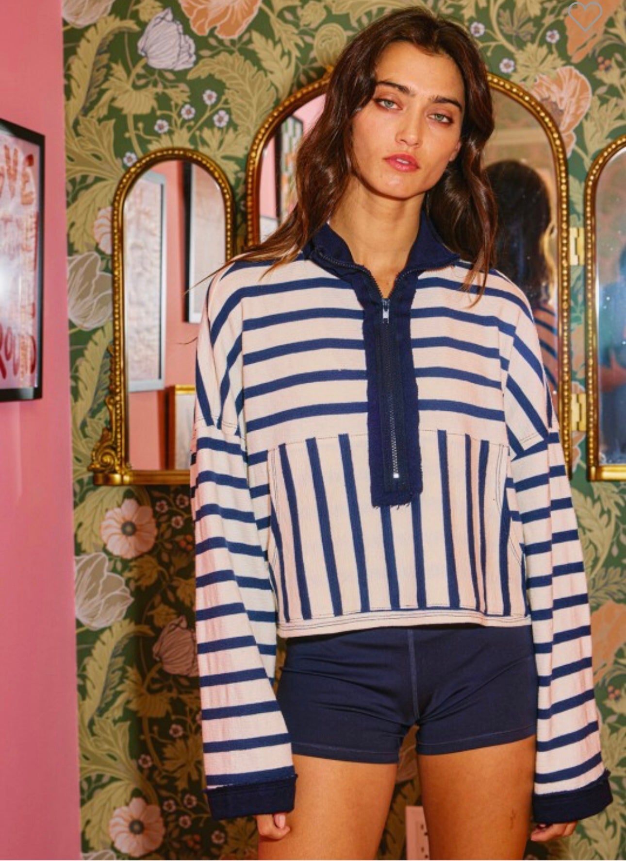 Zip neck striped pullover collared half-zip front with long drop-shoulder sleeves. Cropped silhouette, kangaroo pocket front. 66% cotton, 34% polyester. True to size, I am a 6/8 wearing a medium.
