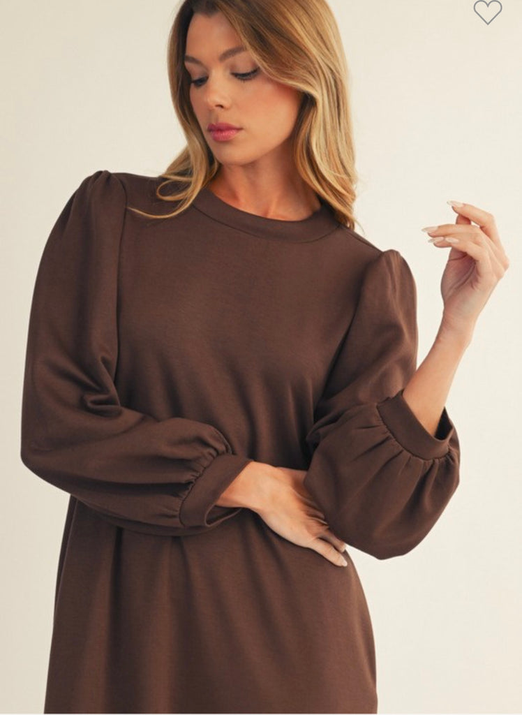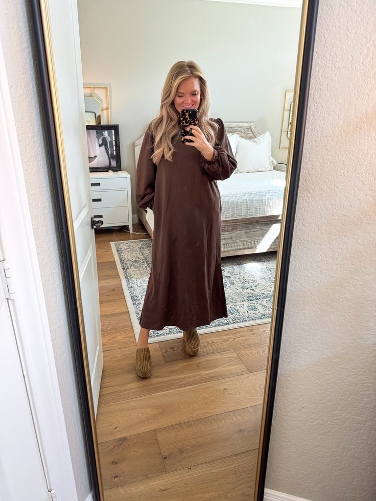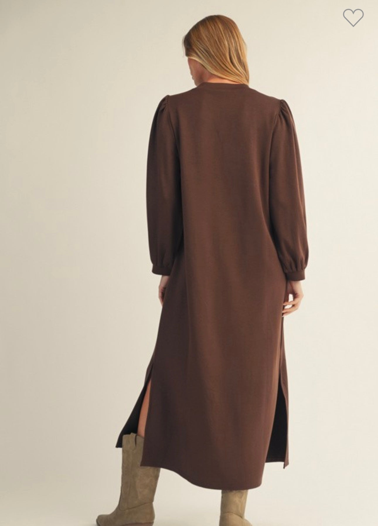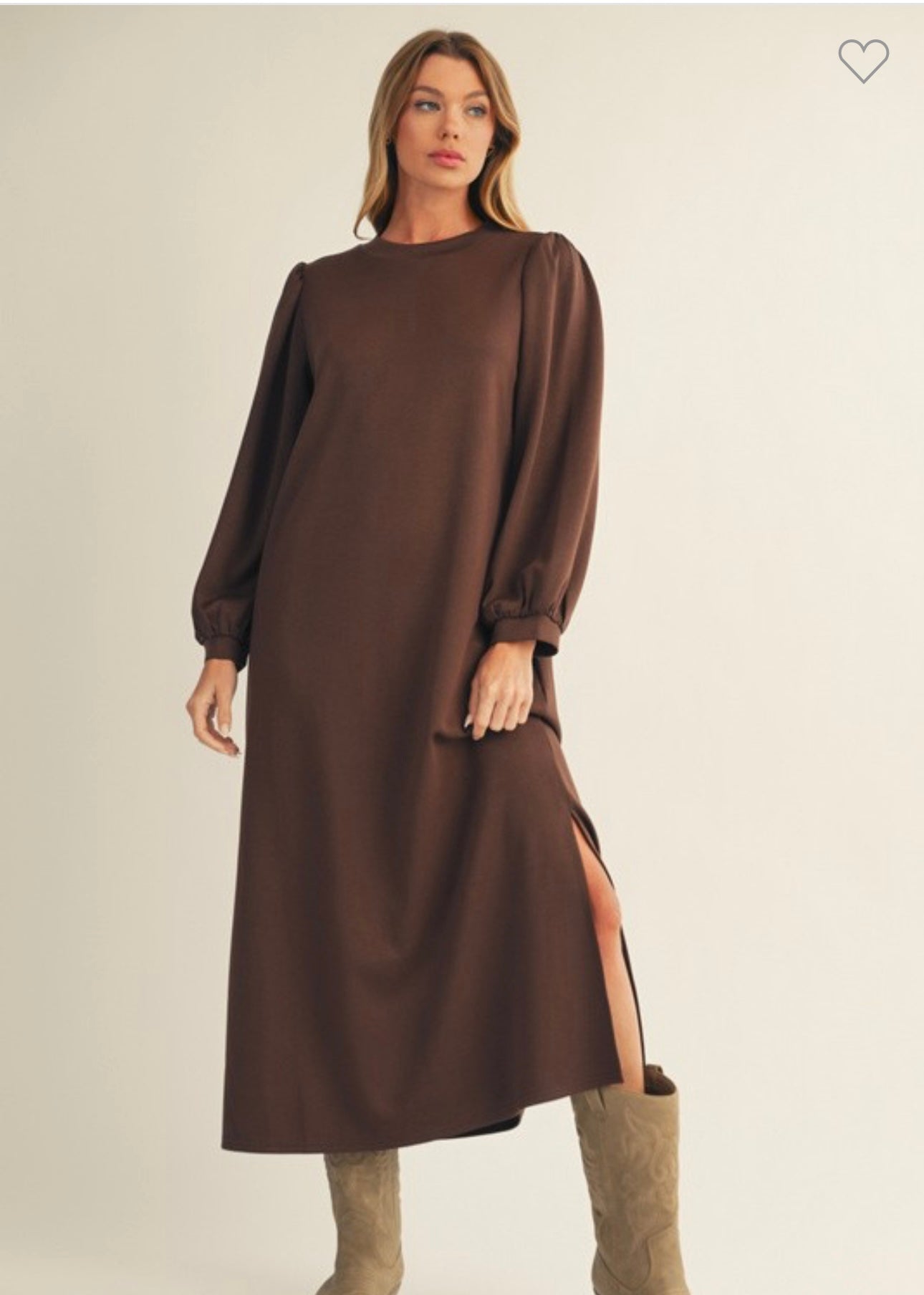 True to size, I am a 6 wearing a medium. Long puff sleeves solid midi dress with side slit detail, side pockets. 50% rayon, 45% polyester, 5% spandex.