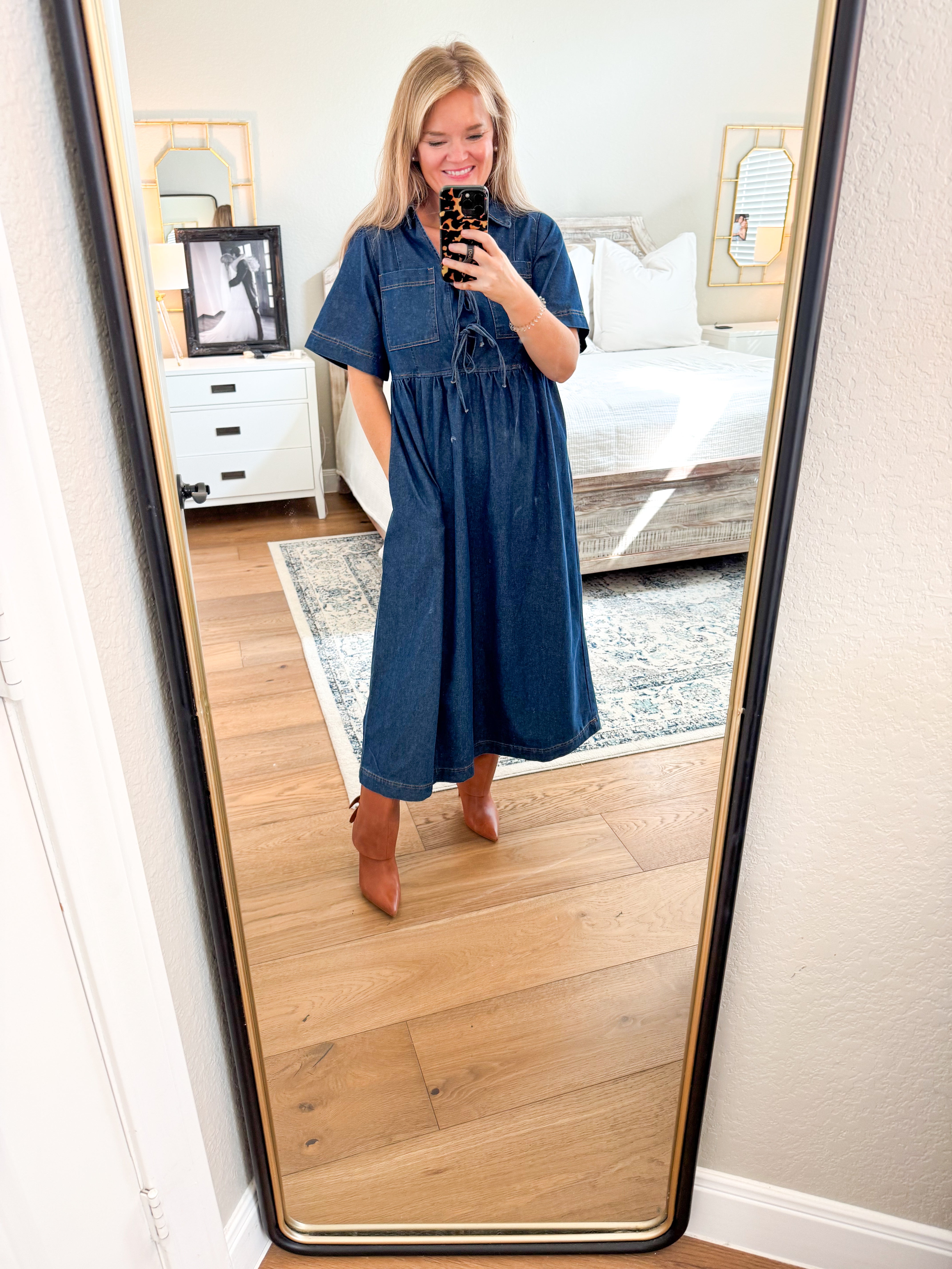 True to size, I am a 6/8 wearing a small. 51% cotton, 28% polyester, 21% recycled polyester. Front bow tie dress with side pockets.