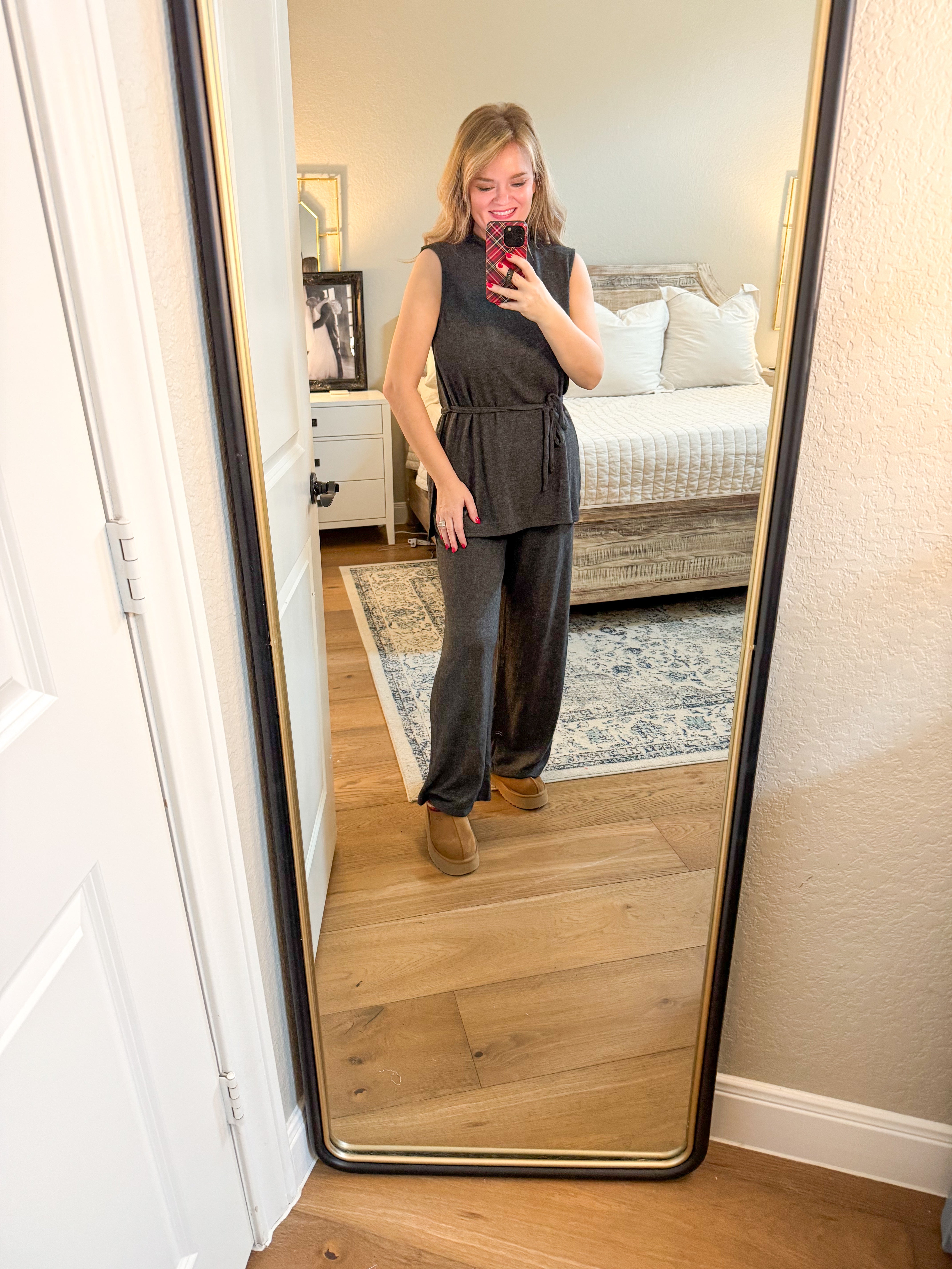 True to size, I am a 6/8 wearing a medium. Mock neck sleeveless waist tie top. Matching pants sold separately.