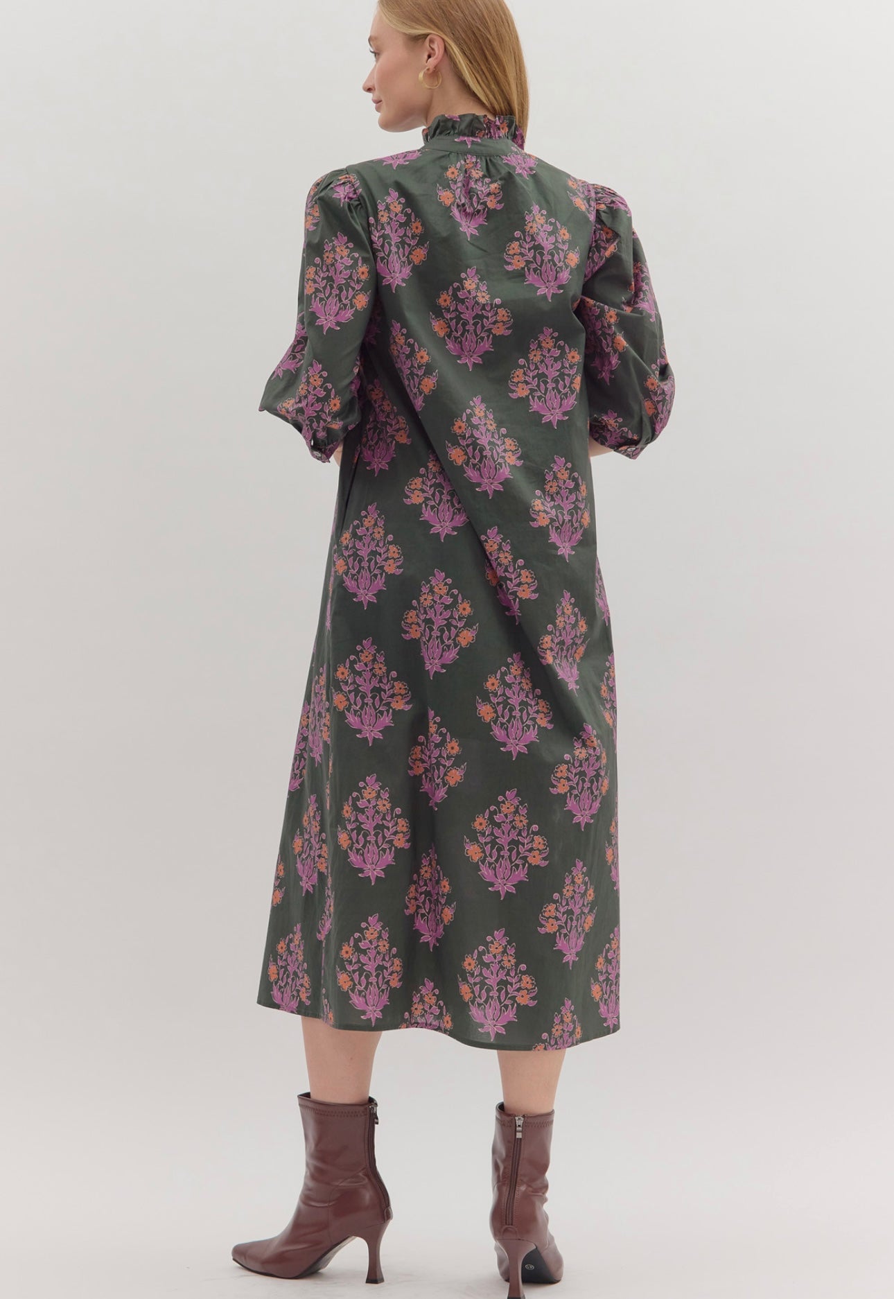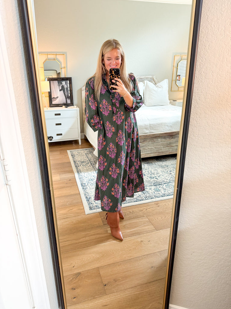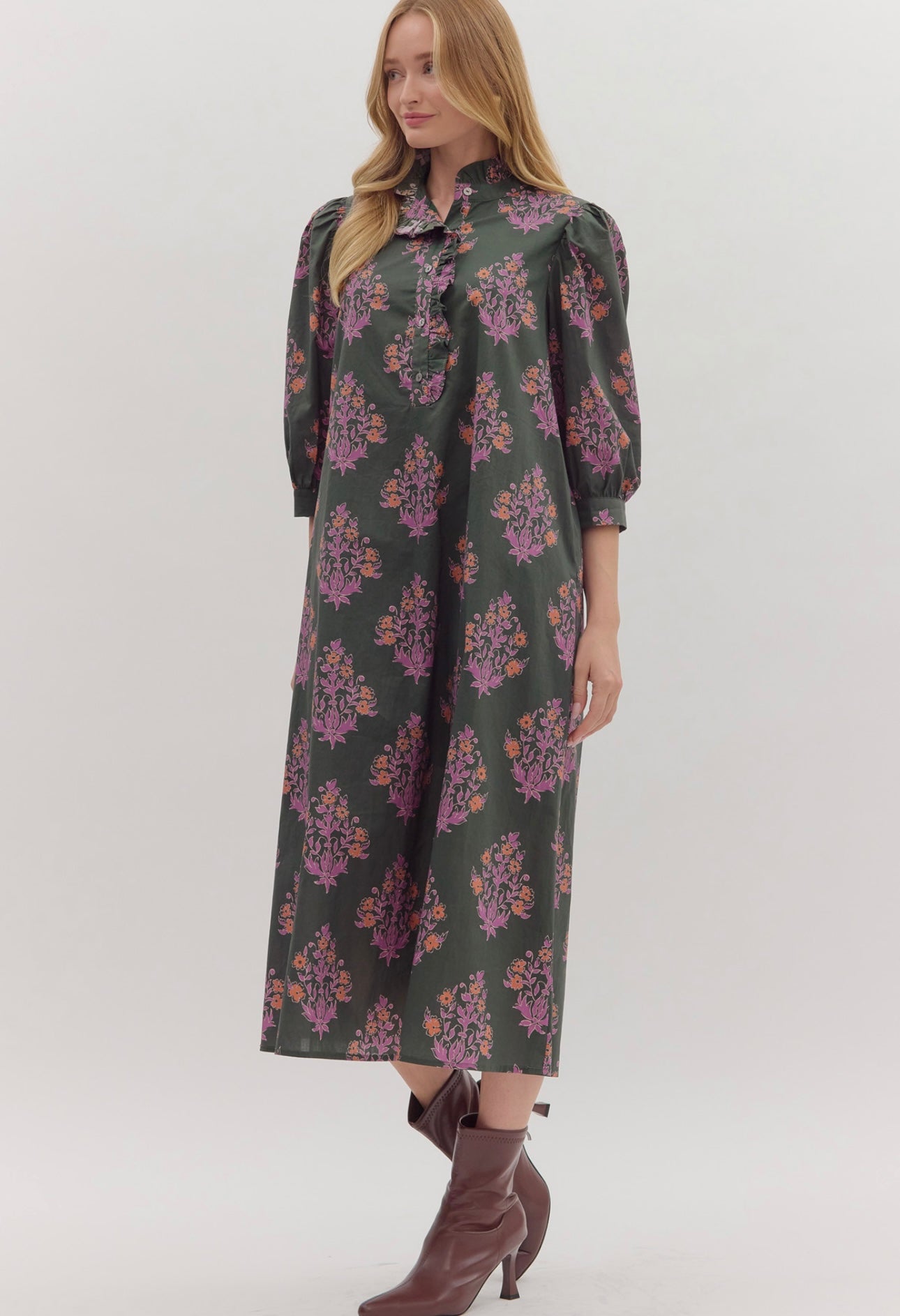 Runs very big, I am a 6/8 wearing a small. Botanical print ¾ sleeve midi dress featuring ruffle trim at collar and front placket. Button closure at front. Side pockets, lined, woven, non-sheer, lightweight. 100% cotton.