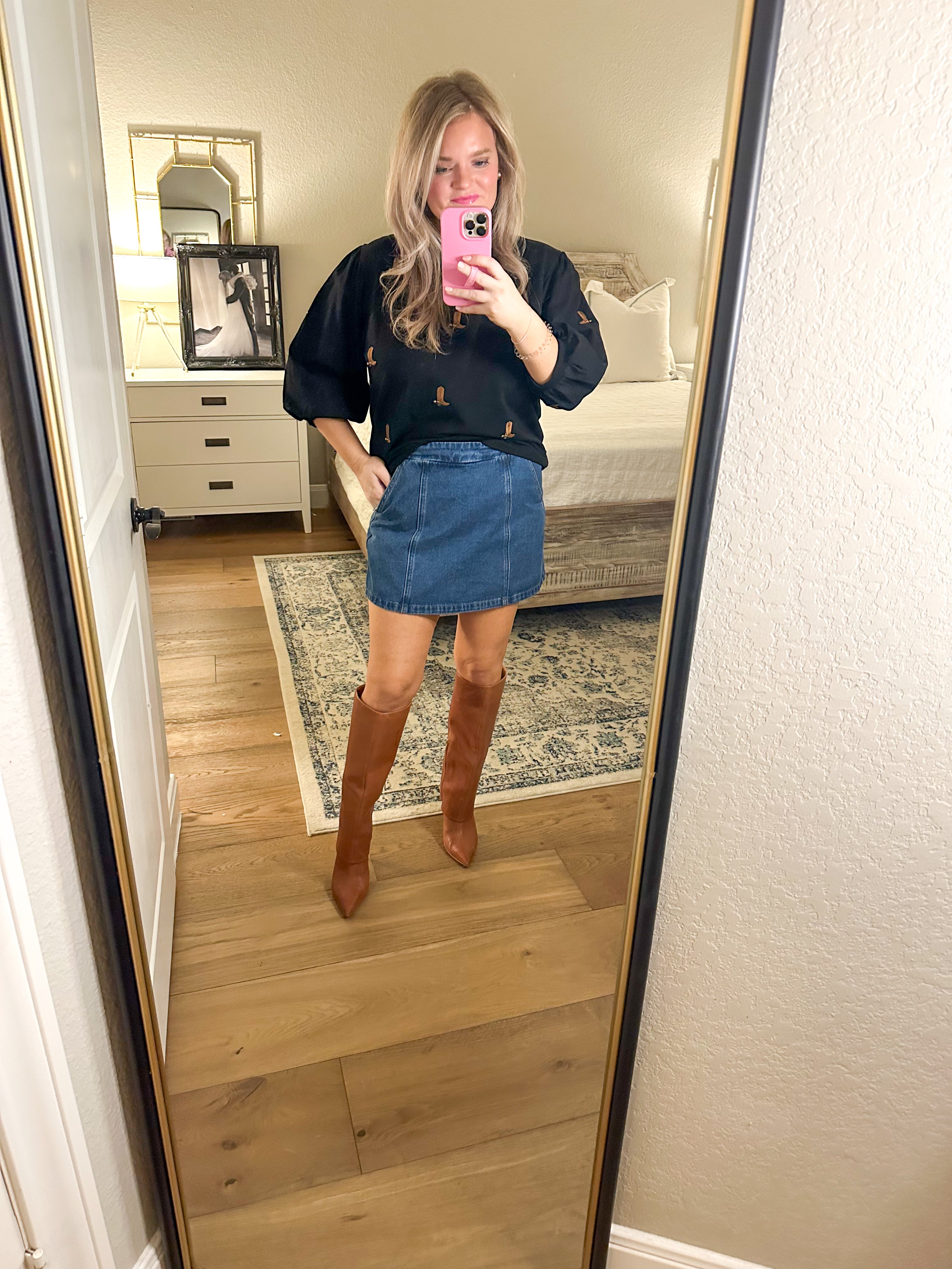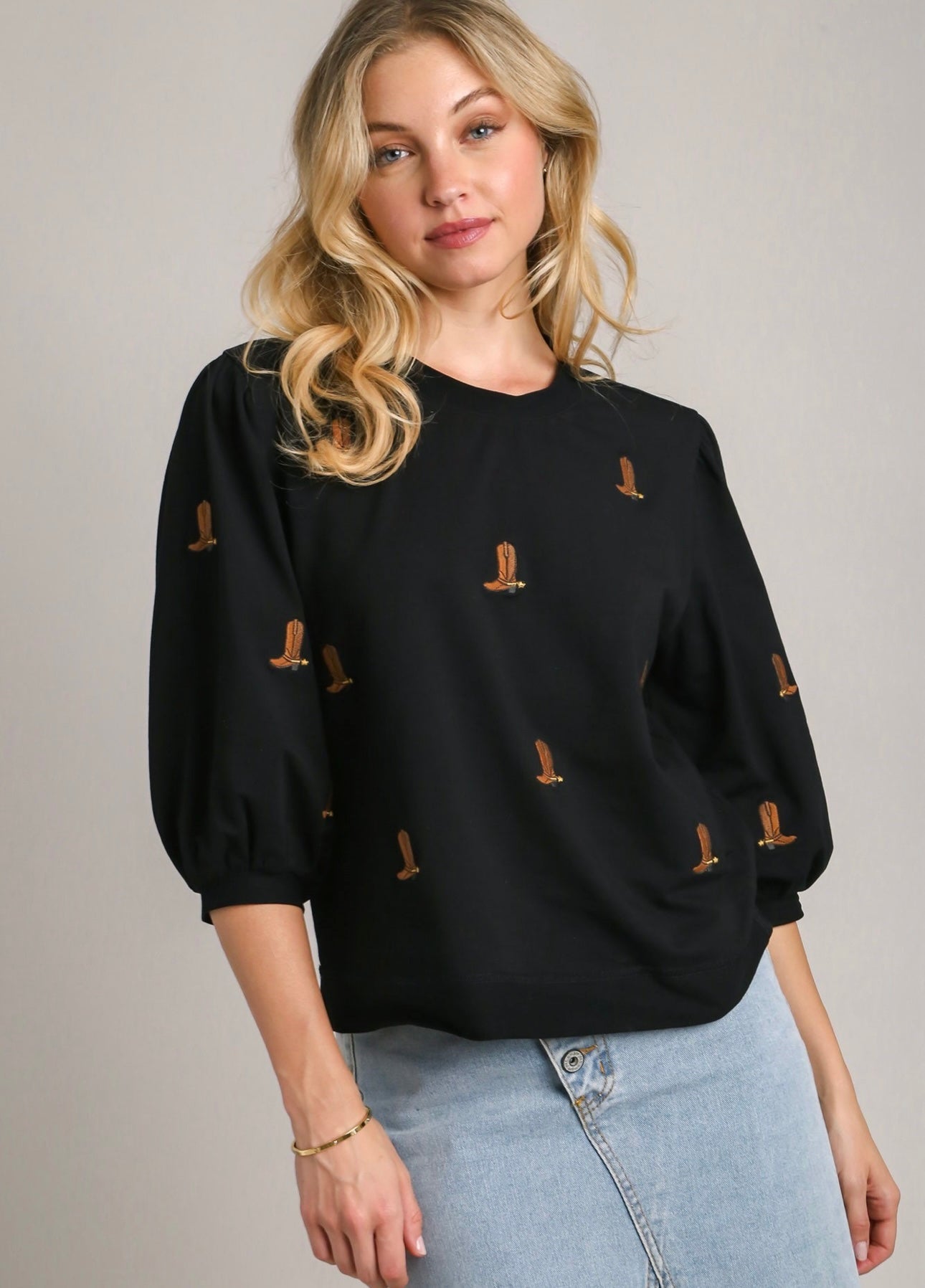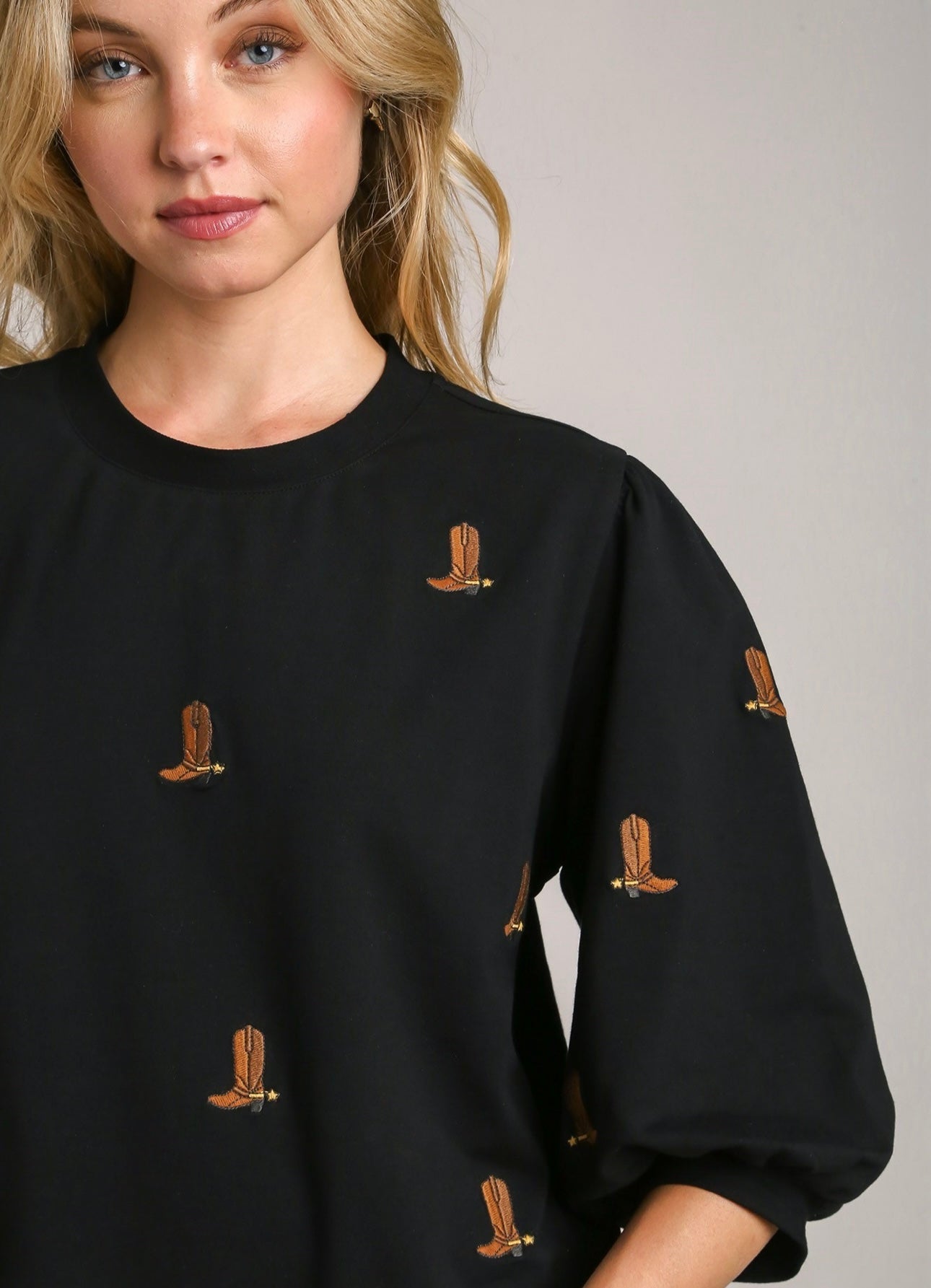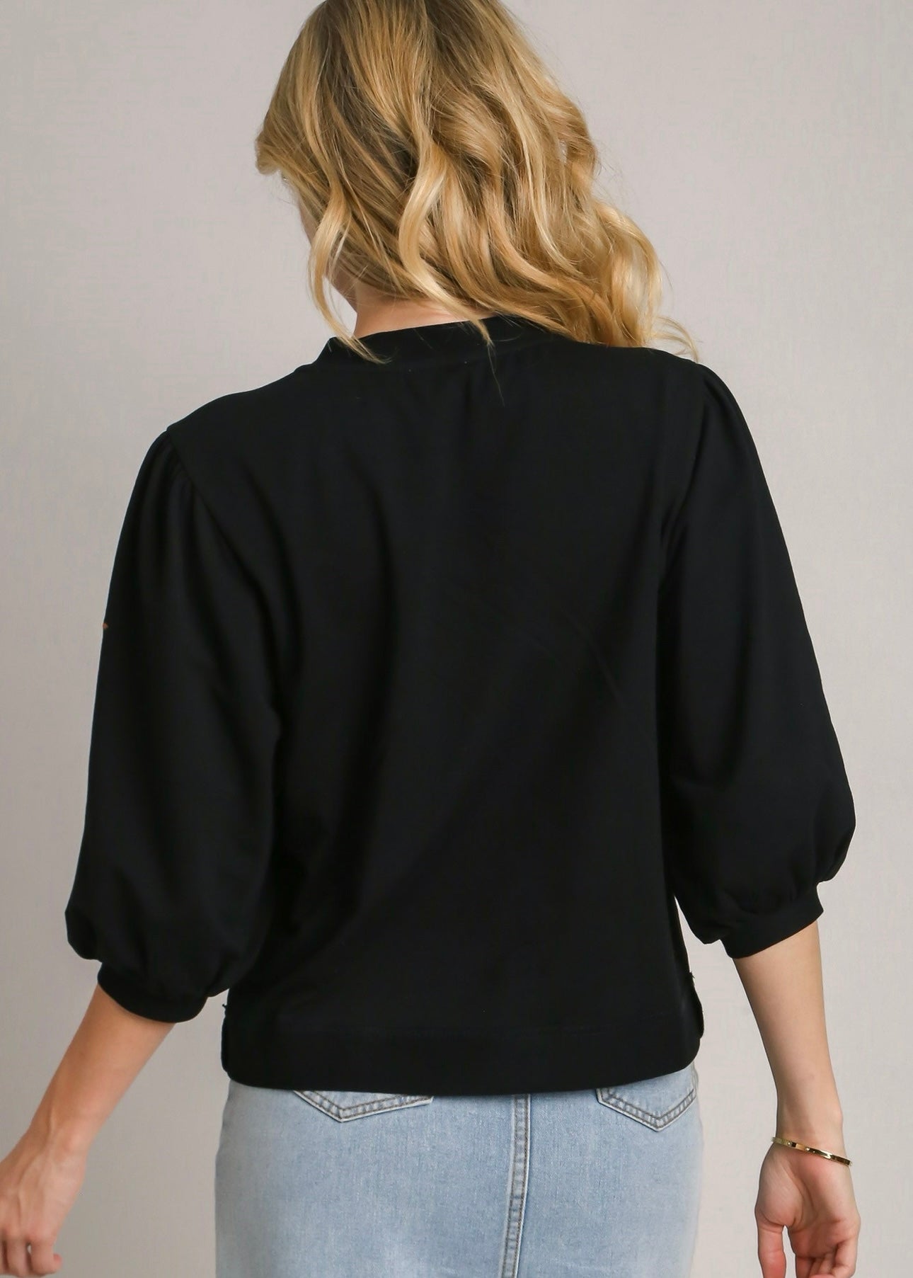 Crewneck ¾ sleeve black tee with embroidery. 95% cotton, 5% spandex. True to size, I am an 8/10 wearing a medium.