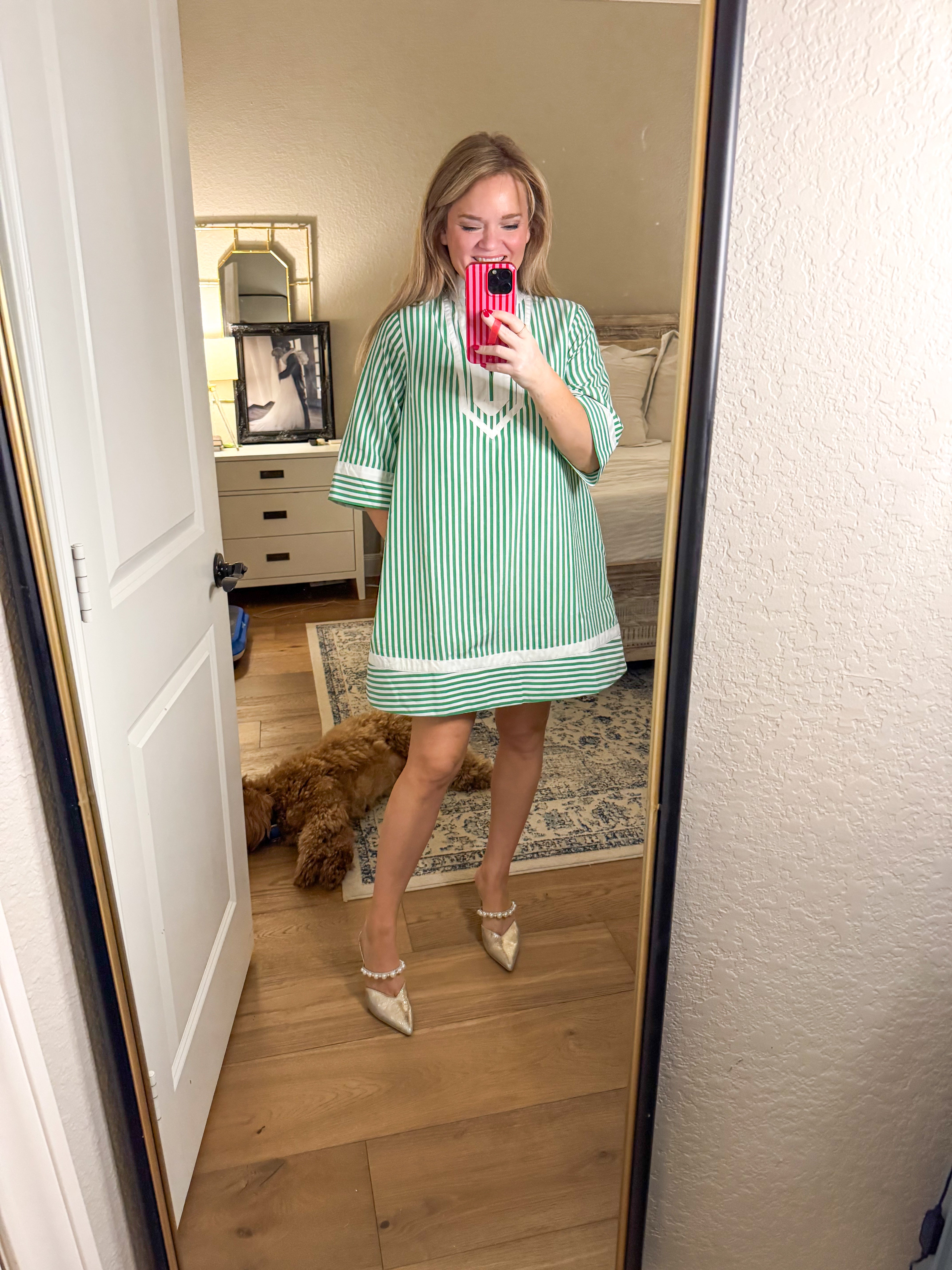 100% polyester. Striped half sleeve mini dress featuring contrast trim and V-neckline. Side pockets. Lined. Woven. Non-sheer. Lightweight. True to size, I am a 6/8 wearing a small.