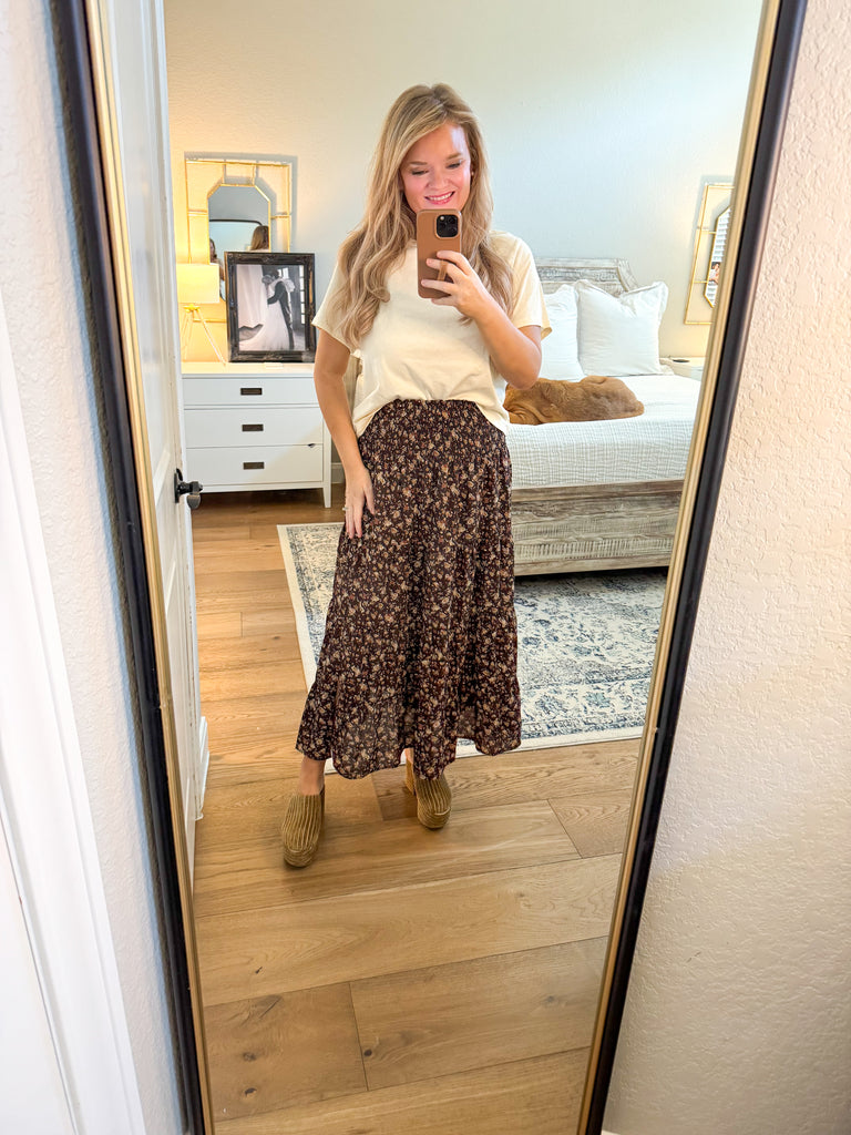 True to size, I am a 6 wearing a medium. Floral tiered front slit midi skirt. Smocked waist, lined. Length 35”. 97% polyester, 3% spandex. Lined.