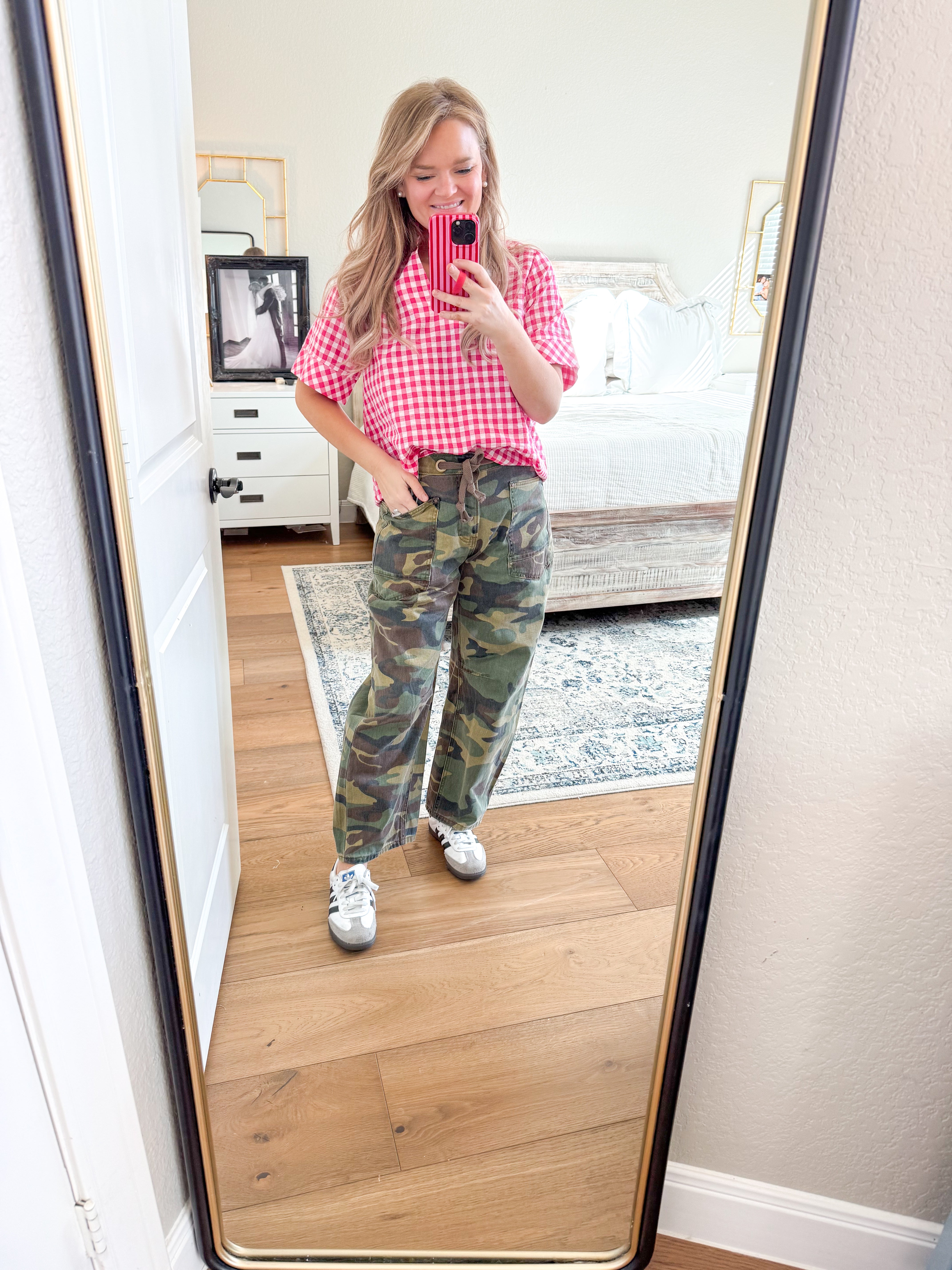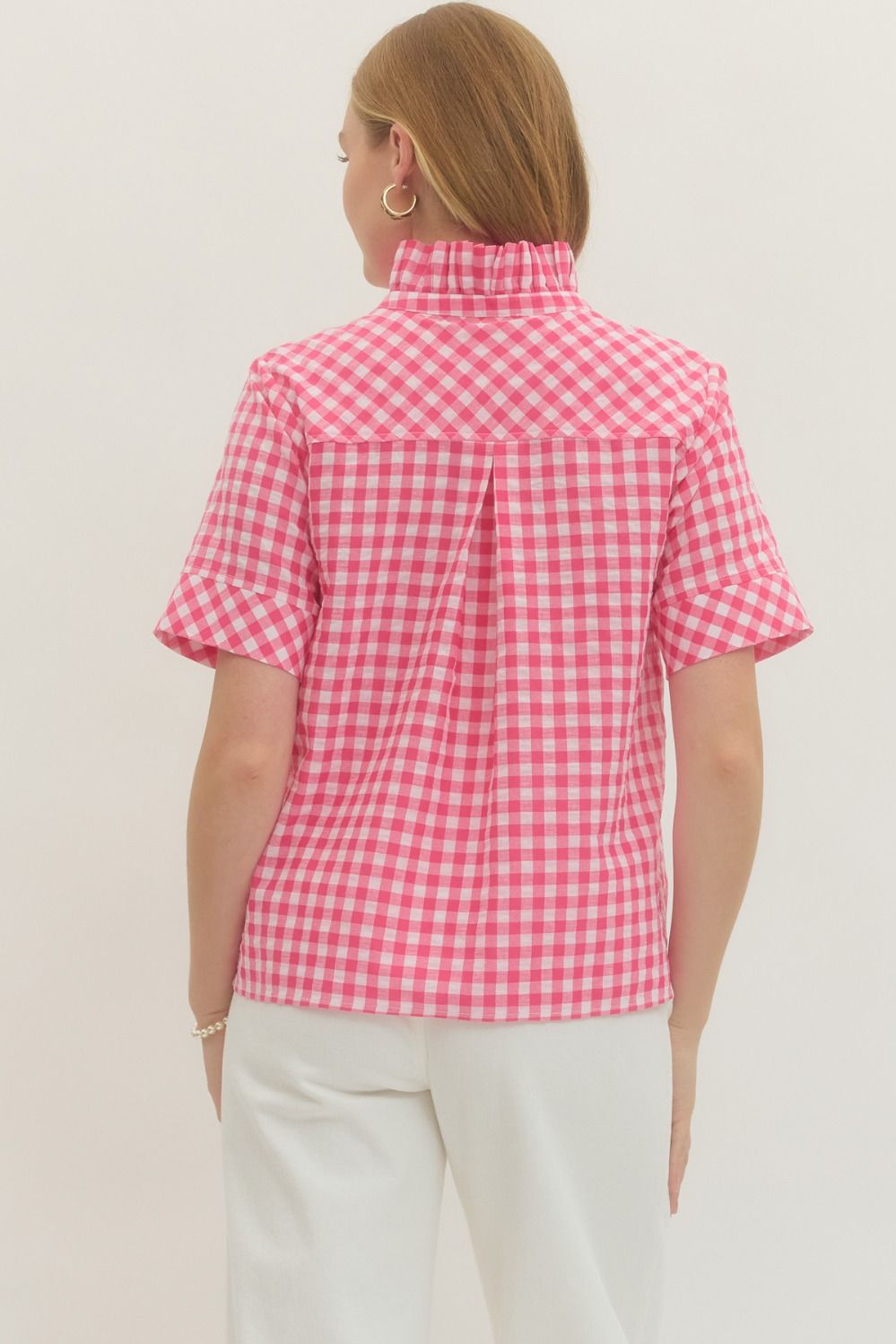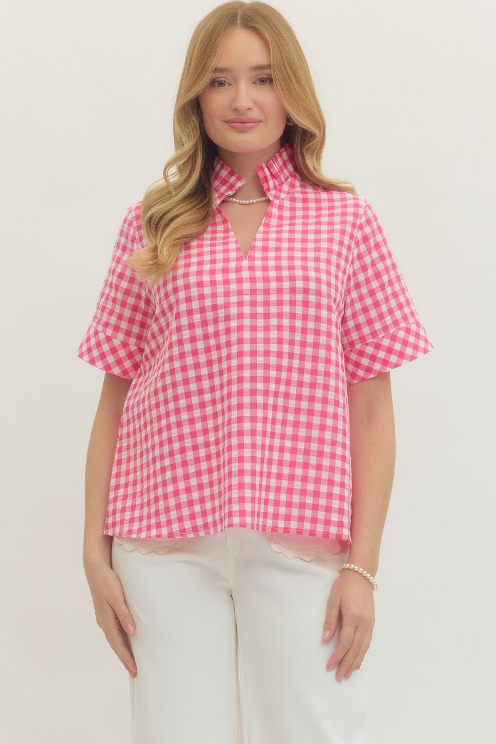 100% cotton Gingham short sleeve top featuring stand collar V-neck. Unlined. Woven. Non-sheer. Lightweight. True to size, I am a 6/8 wearing a small.