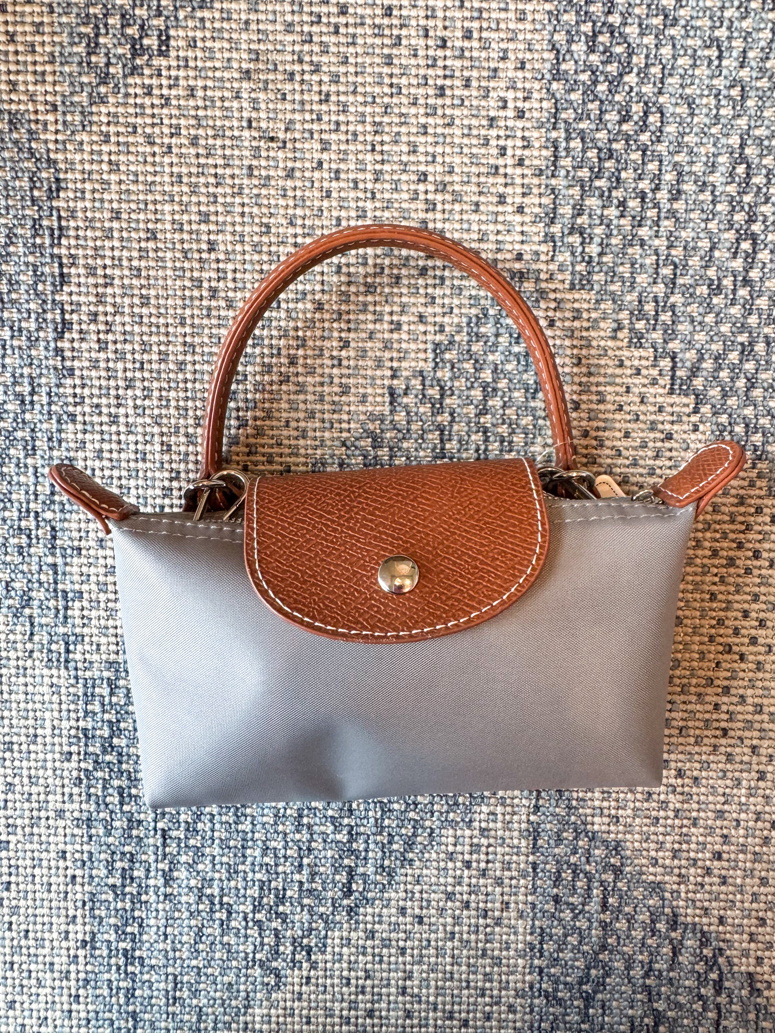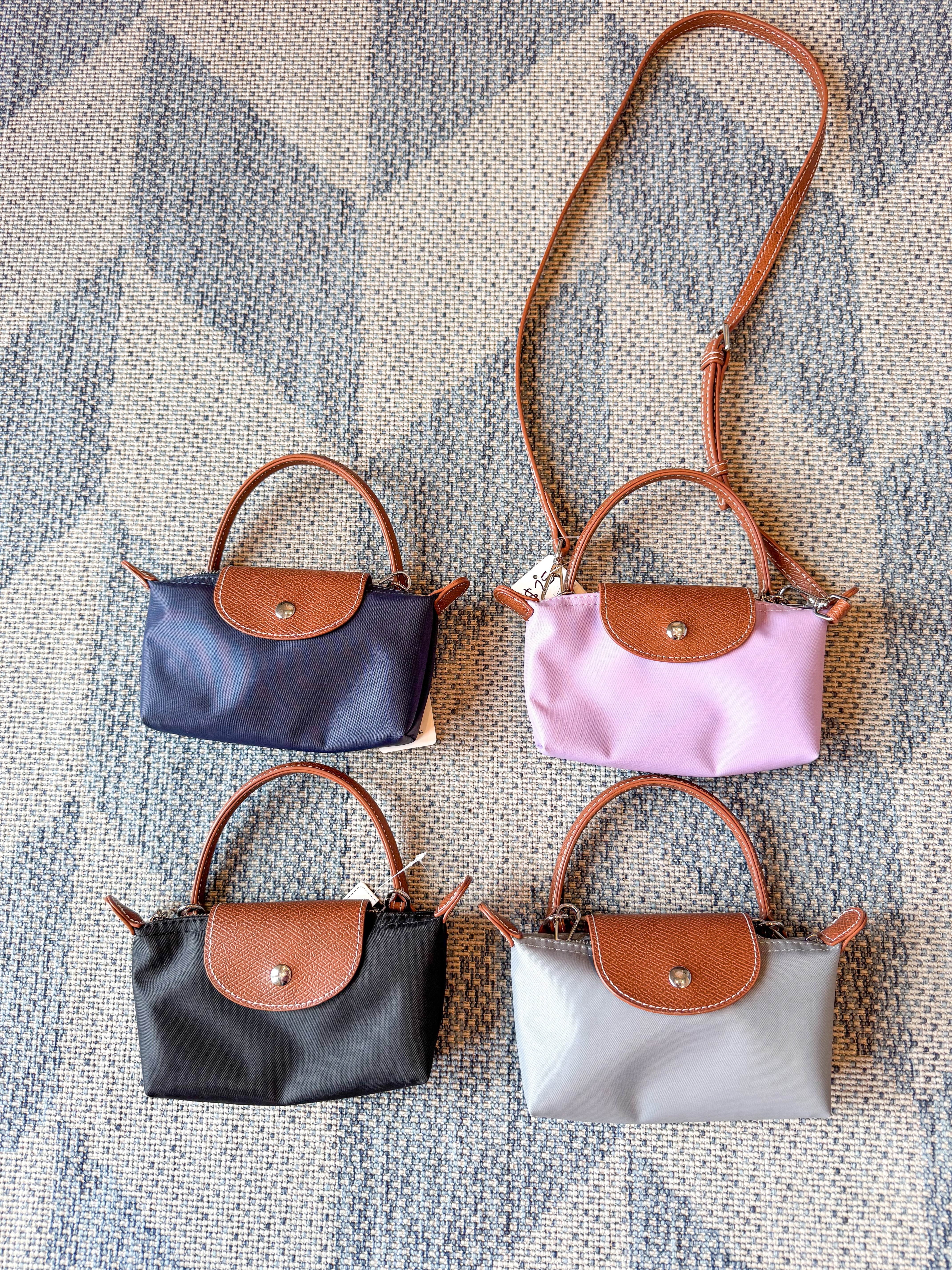 Mini Nylon removable crossbody strap with zipper closure and button flap.