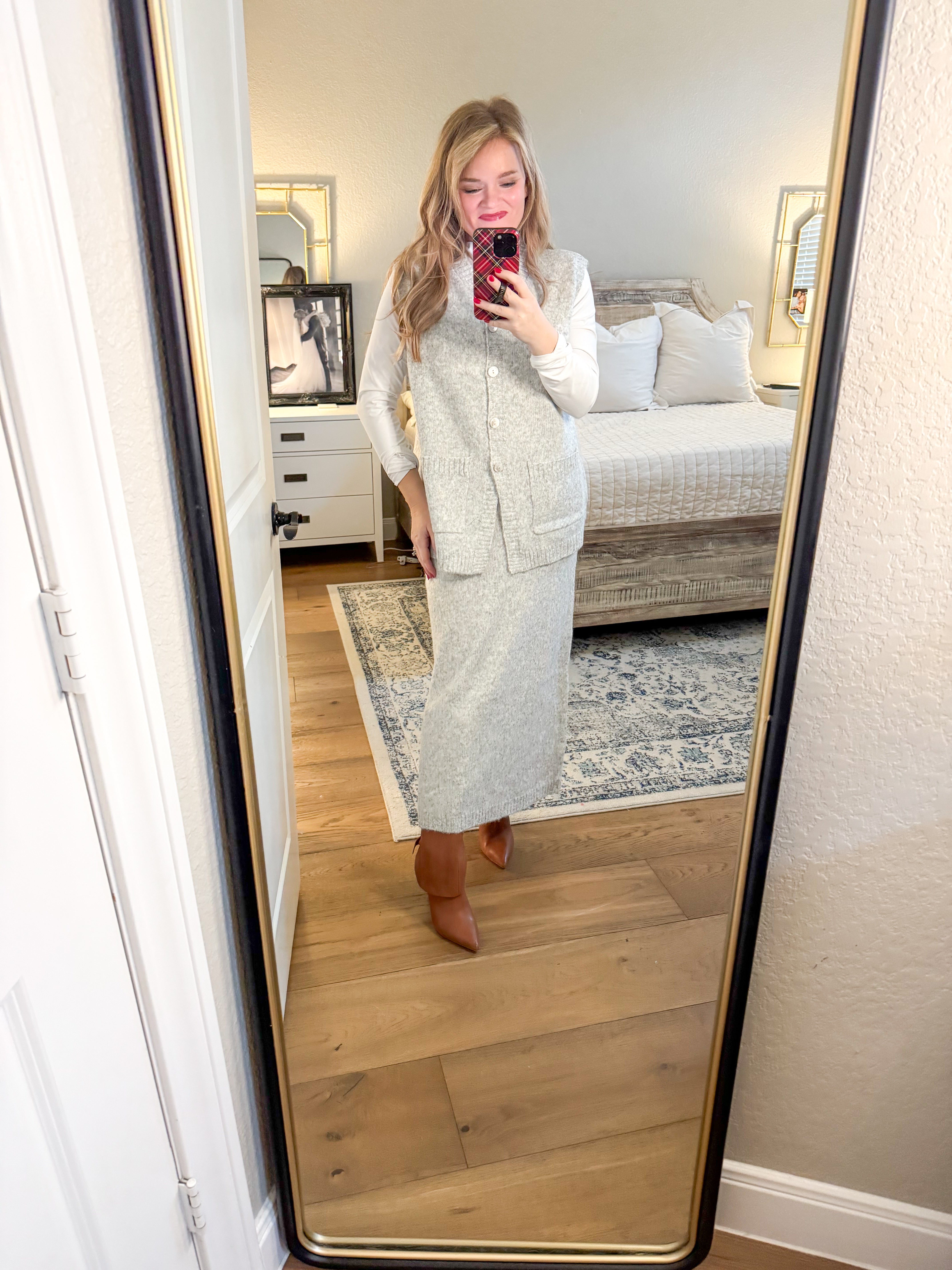 True to size, I am a 6/8 wearing a medium. Brushed sweater top and skirt set. Functional buttons on top and elastic waist skirt. 55% polyester, 18% acrylic, 17% nylon, 10% wool. Top and bottom sold together as set.
