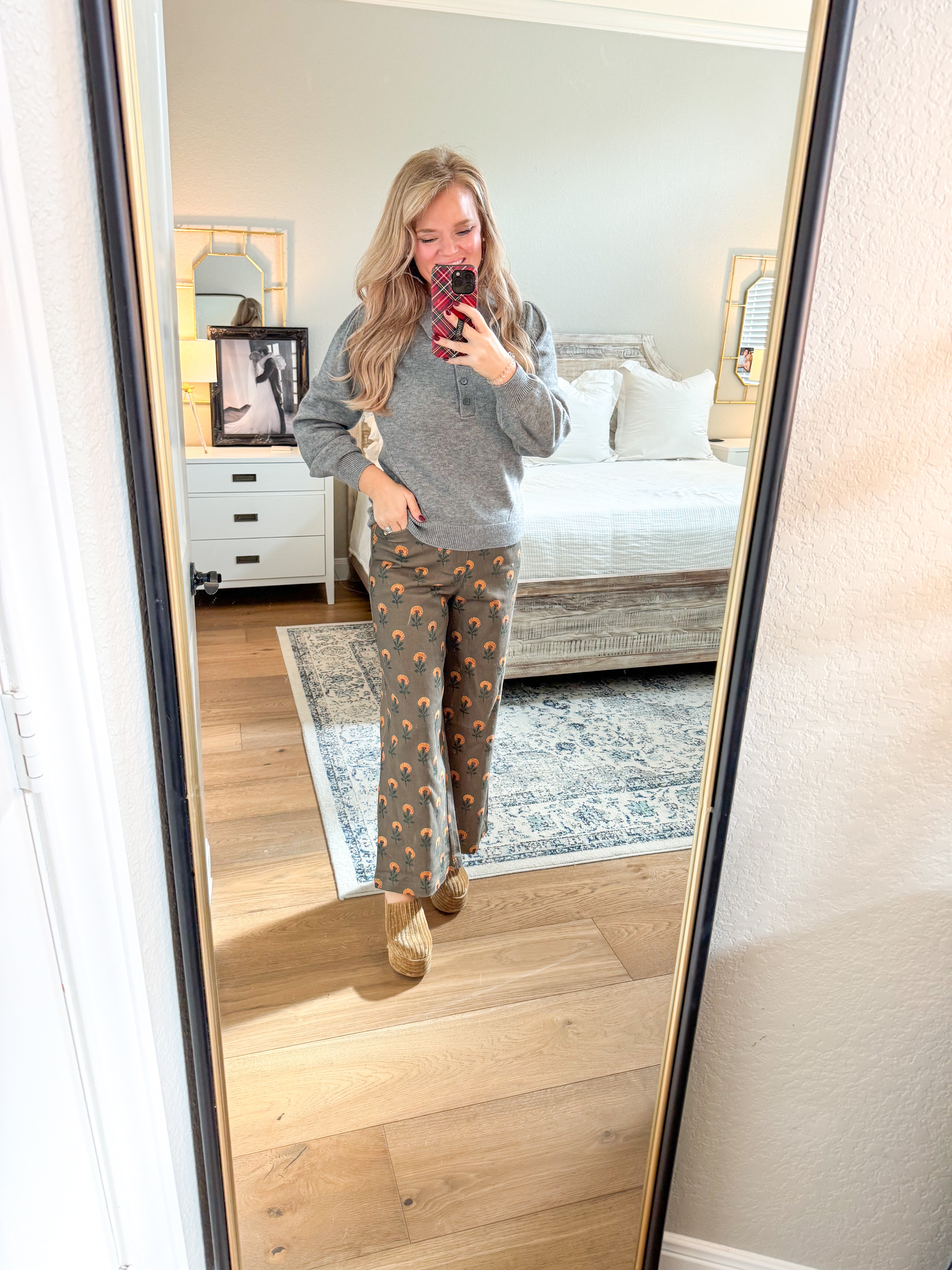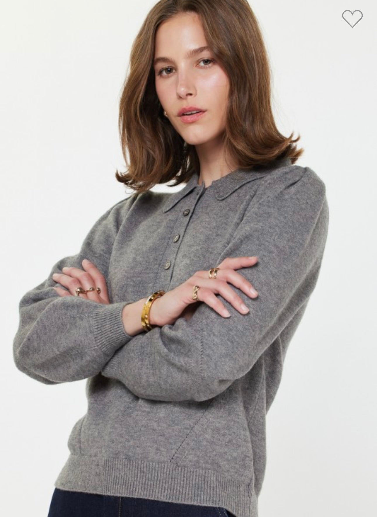 59% acrylic, 28% poly, 22% nylon. Polo collar with button placket, long sleeve, ribbed cuffs and hems. Shoulder pleats for subtle volume. Christmas plaid sailor cardigan. I am a 6/8 wearing a medium.
