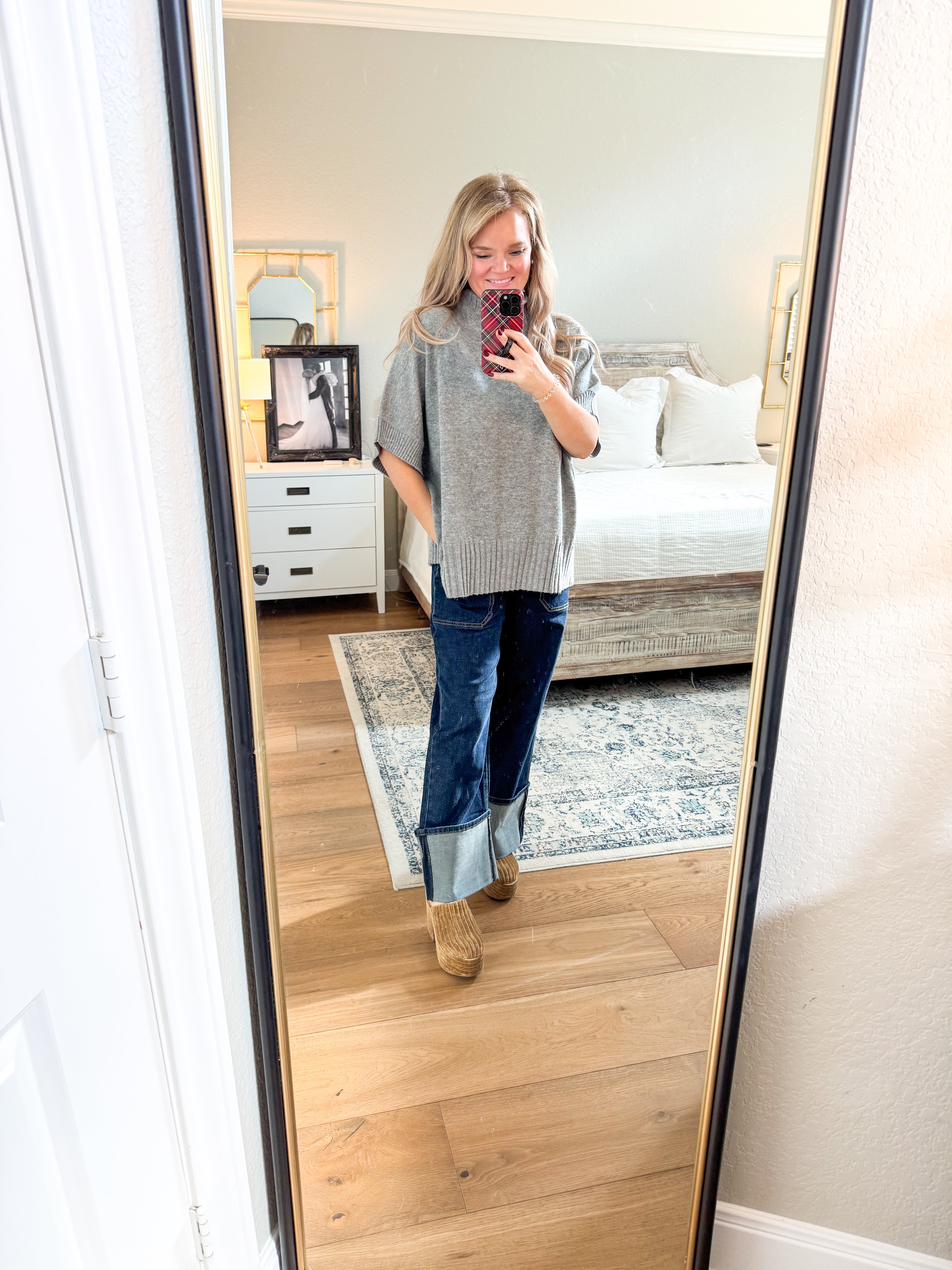 Turtle neck short sleeve side slit sweater. True to size, I am a 6/8 wearing a small.