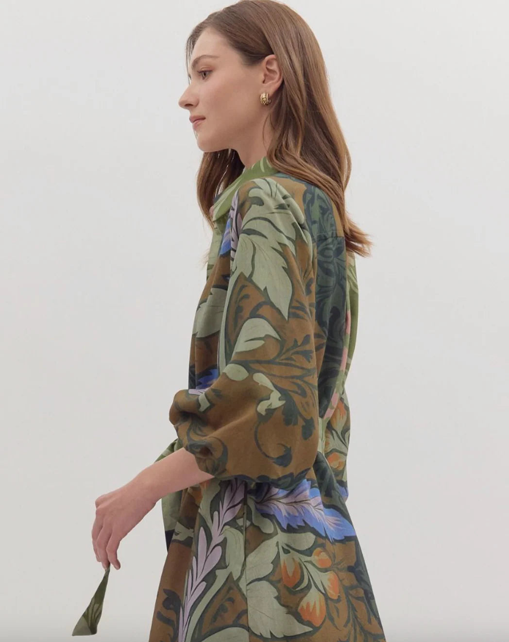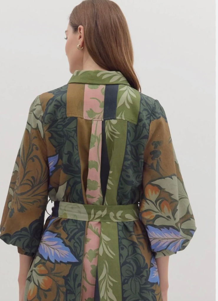 Botanical print Side pockets. 80% rayon, 20% nylon. green dress with belt. True to size, I am a 6/8 wearing a medium.