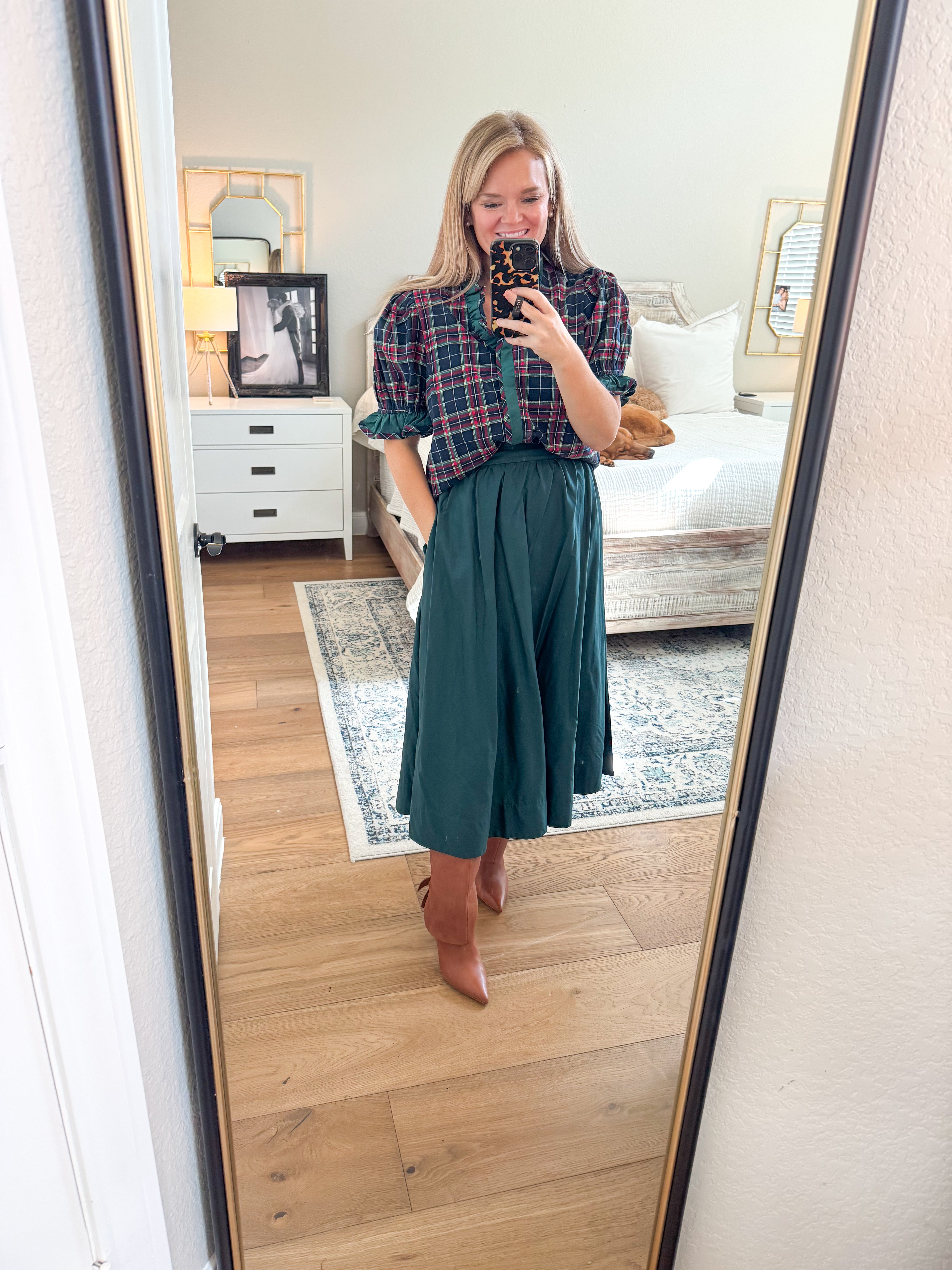 Woven plaid short sleeved blouse with ruffle detail. True to size, I am a 6/8 wearing a medium.