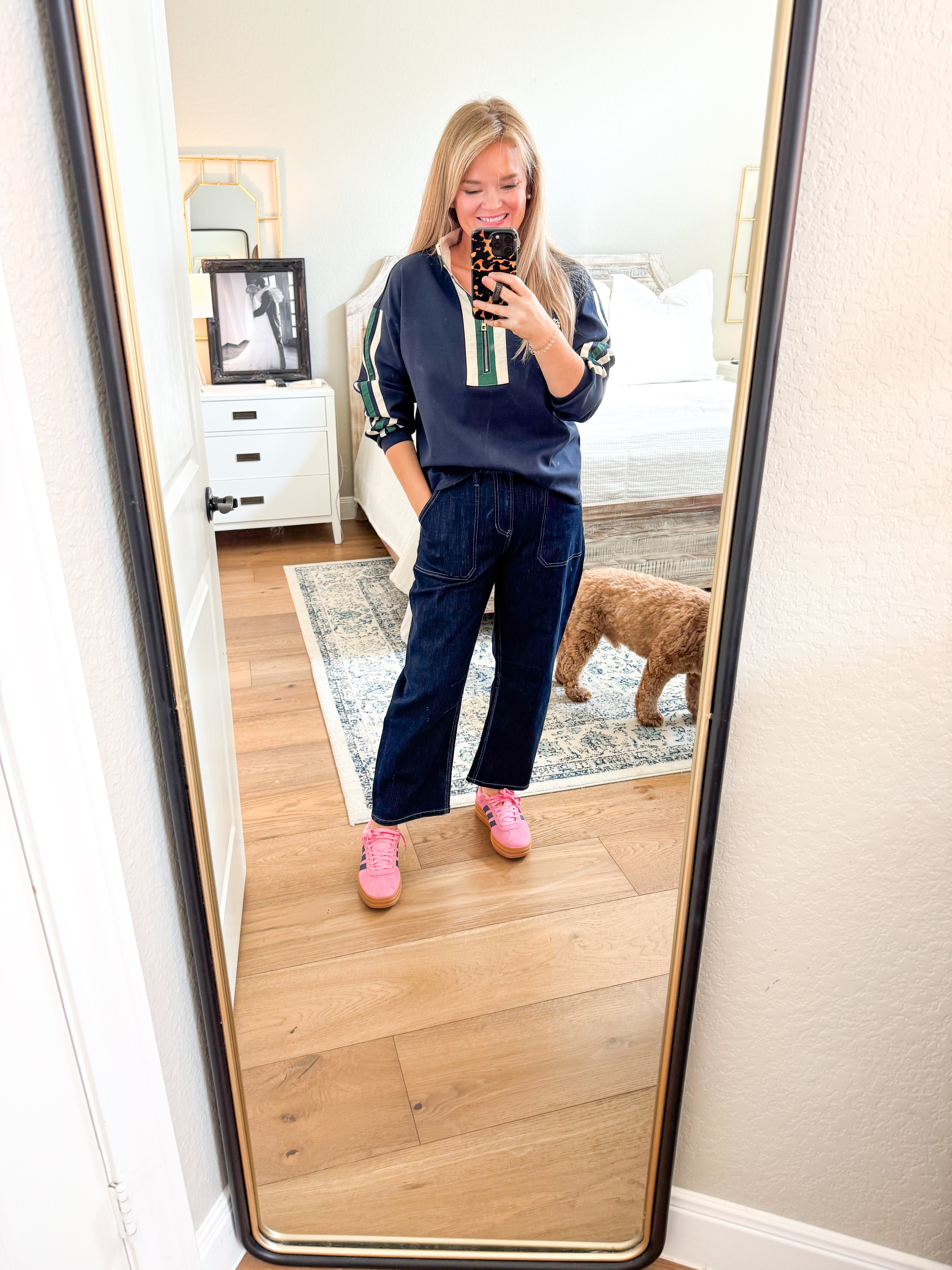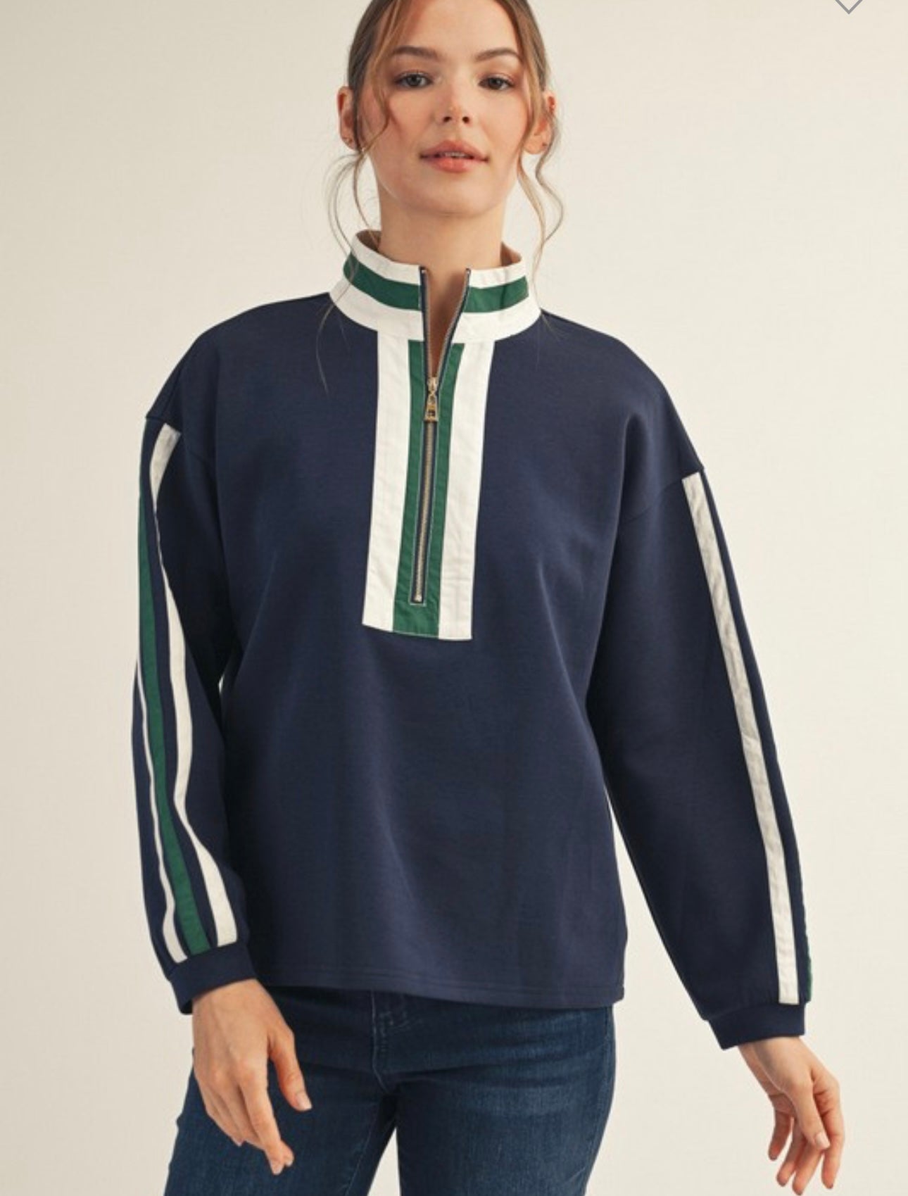 Drop shoulder zip up sweatshirt with solid contrast detail, mock neck. 46% cotton, 46% polyester, 8% spandex. True to size, I am a 6/8 wearing a small.