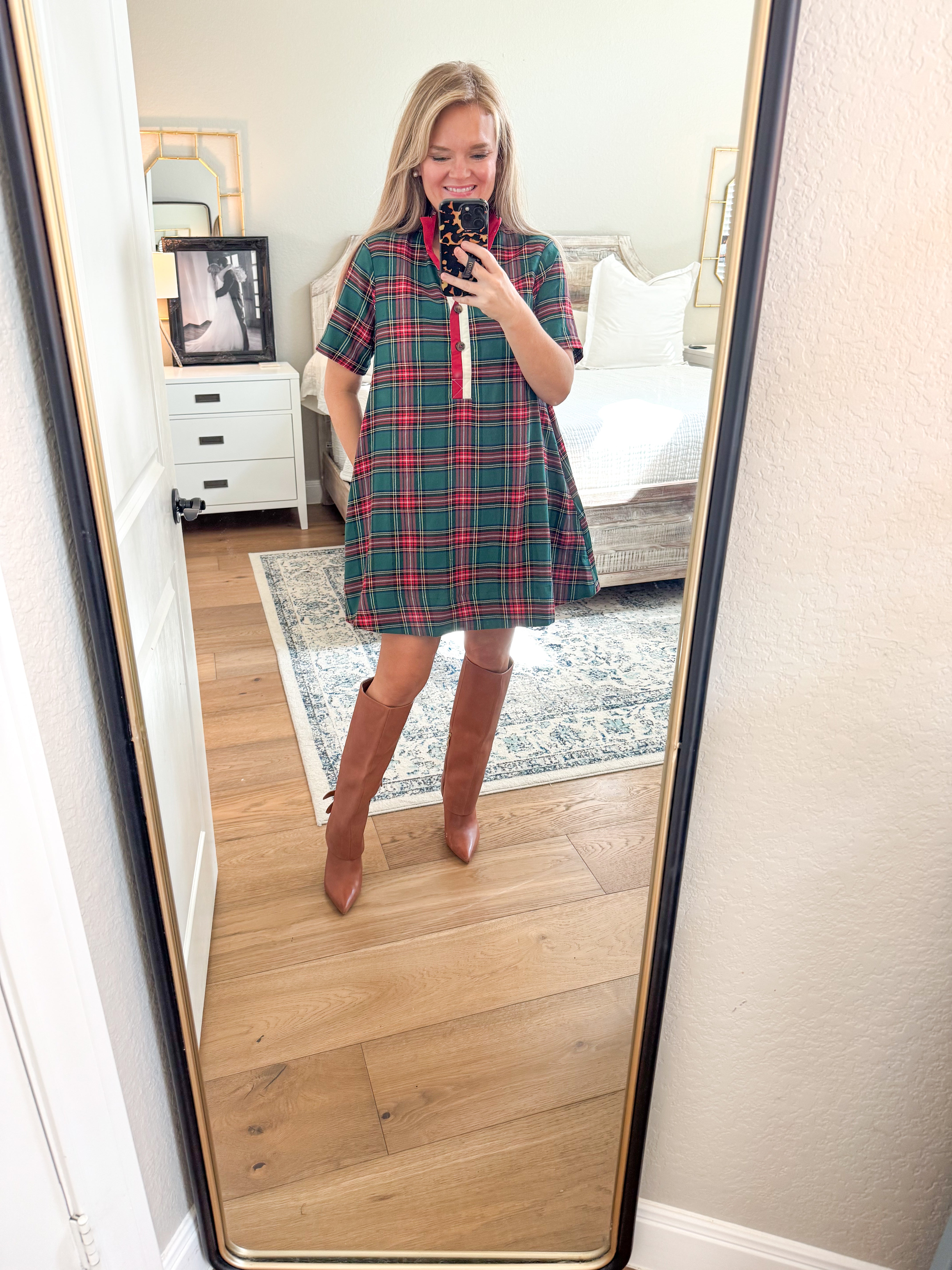 Runs large, I am a 6 wearing a small. Plaid short sleeve dress featuring contrast buttoned placket and collar lining. Side pockets, lined, woven, non-sheer, lightweight. 80% polyester, 20% cotton.