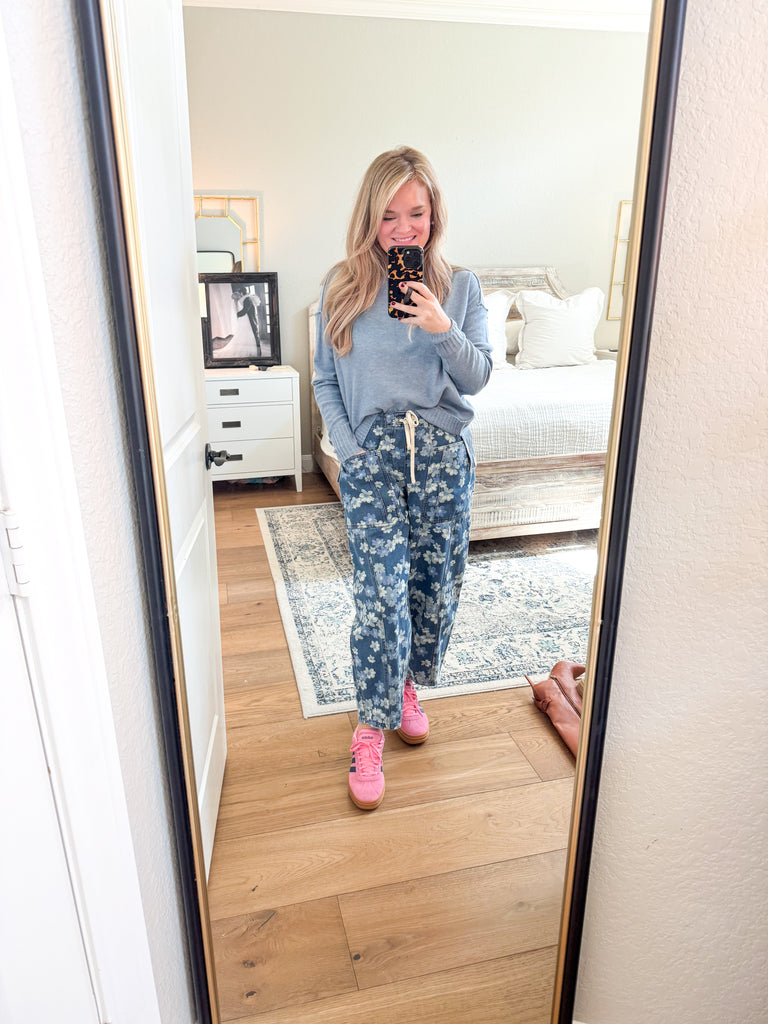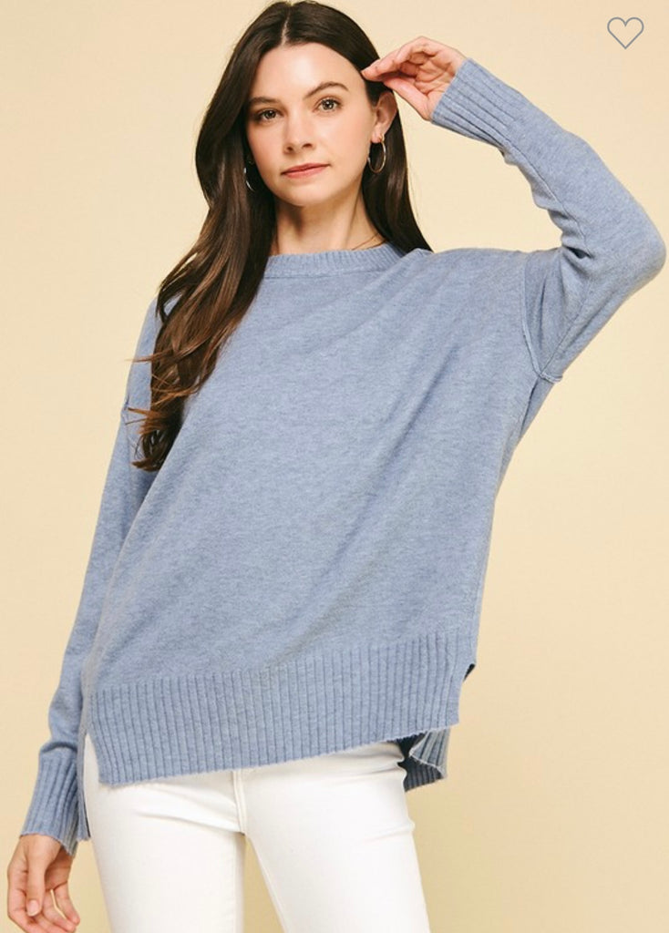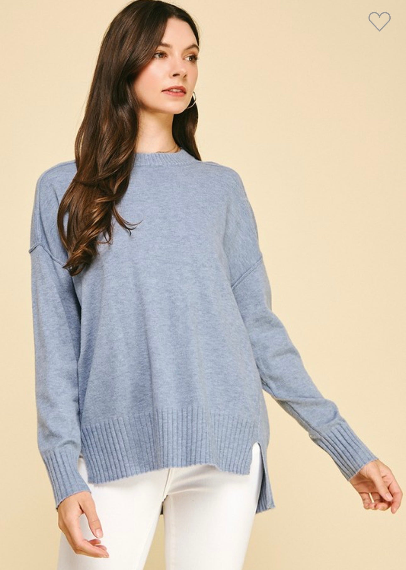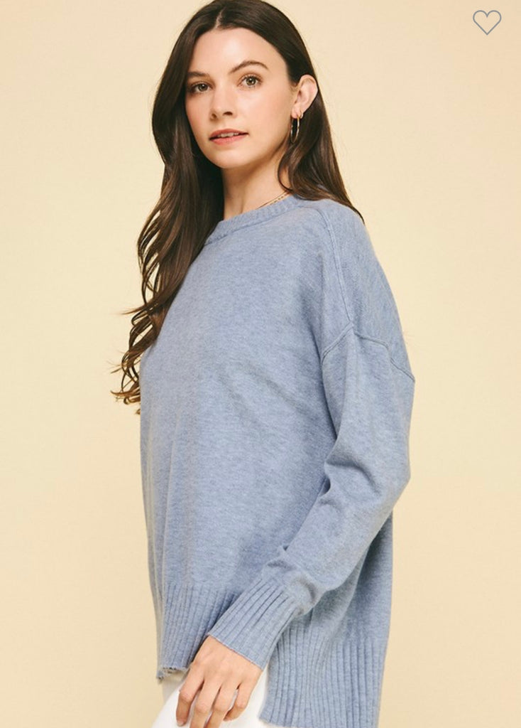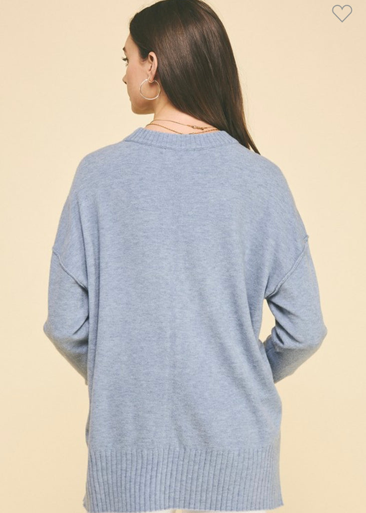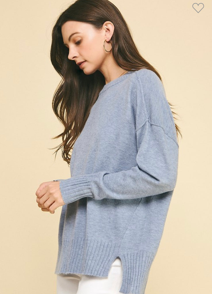 Round neck, drop shoulder super soft sweater. I’m a 6/8 wearing a medium.