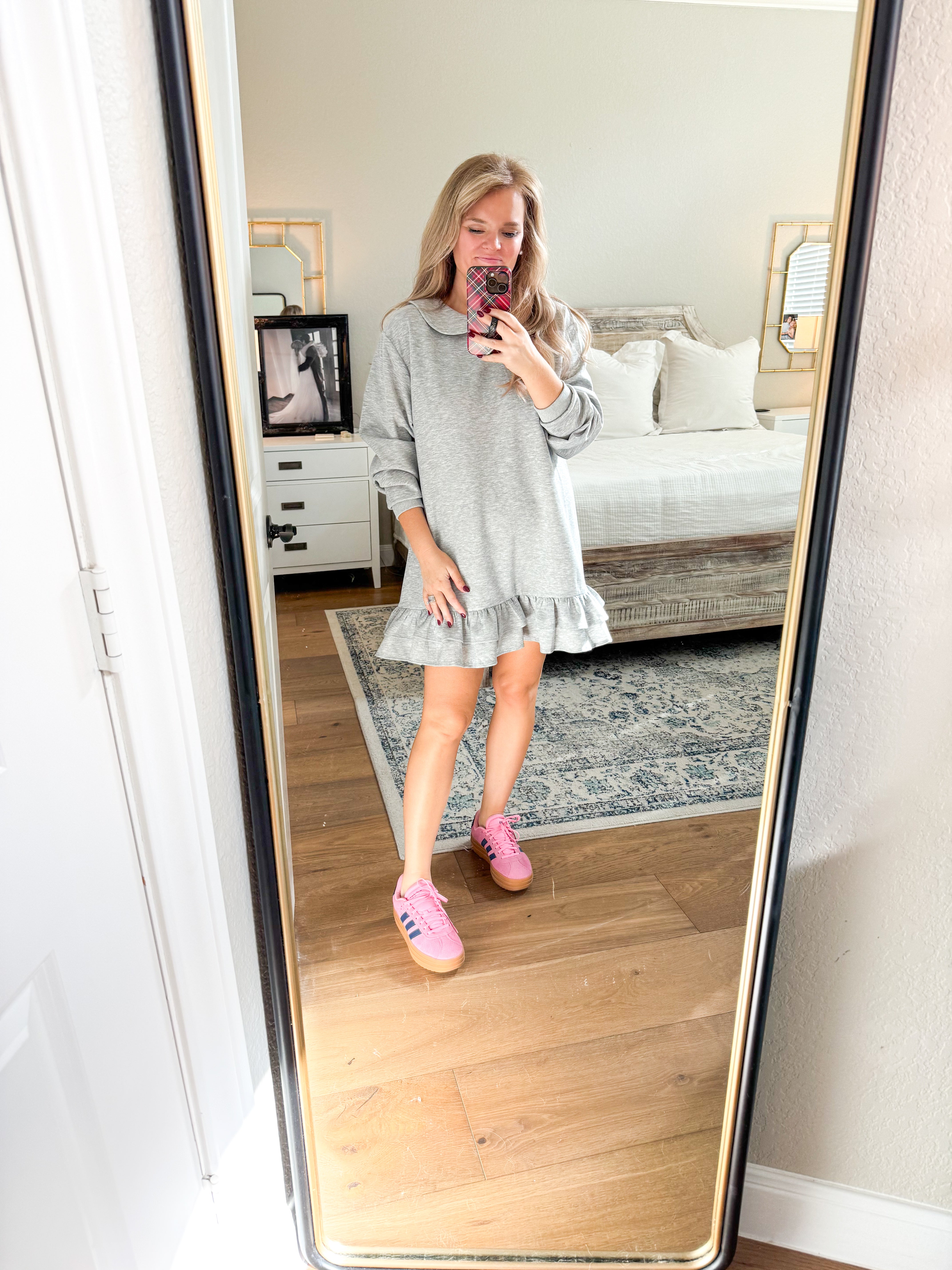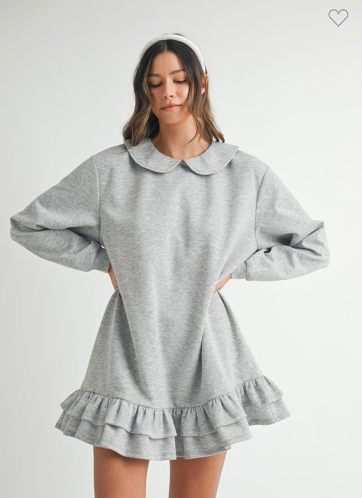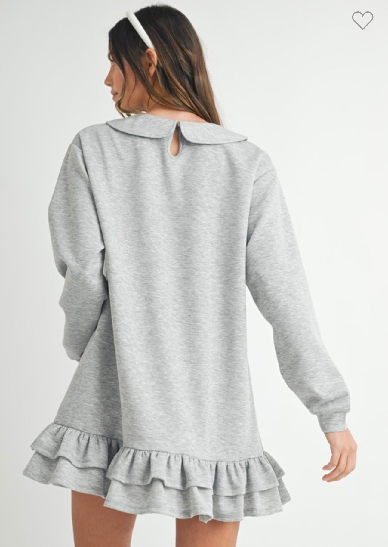 True to size, I am a 6/8 wearing a small. Solid long sleeve scuba peter pan collar ruffle tiered hem dress. Back neckline button keyhole closure. 45% rayon, 49% polyester, 6% spandex.